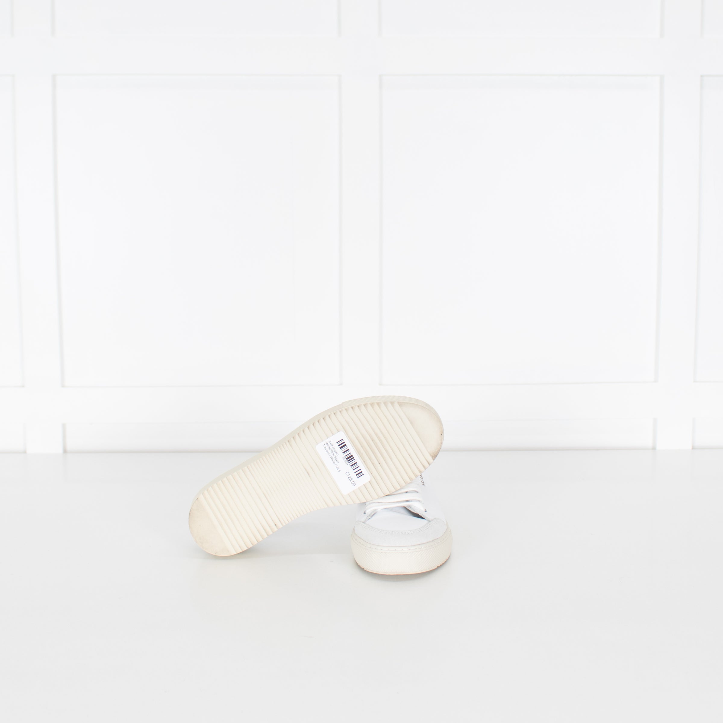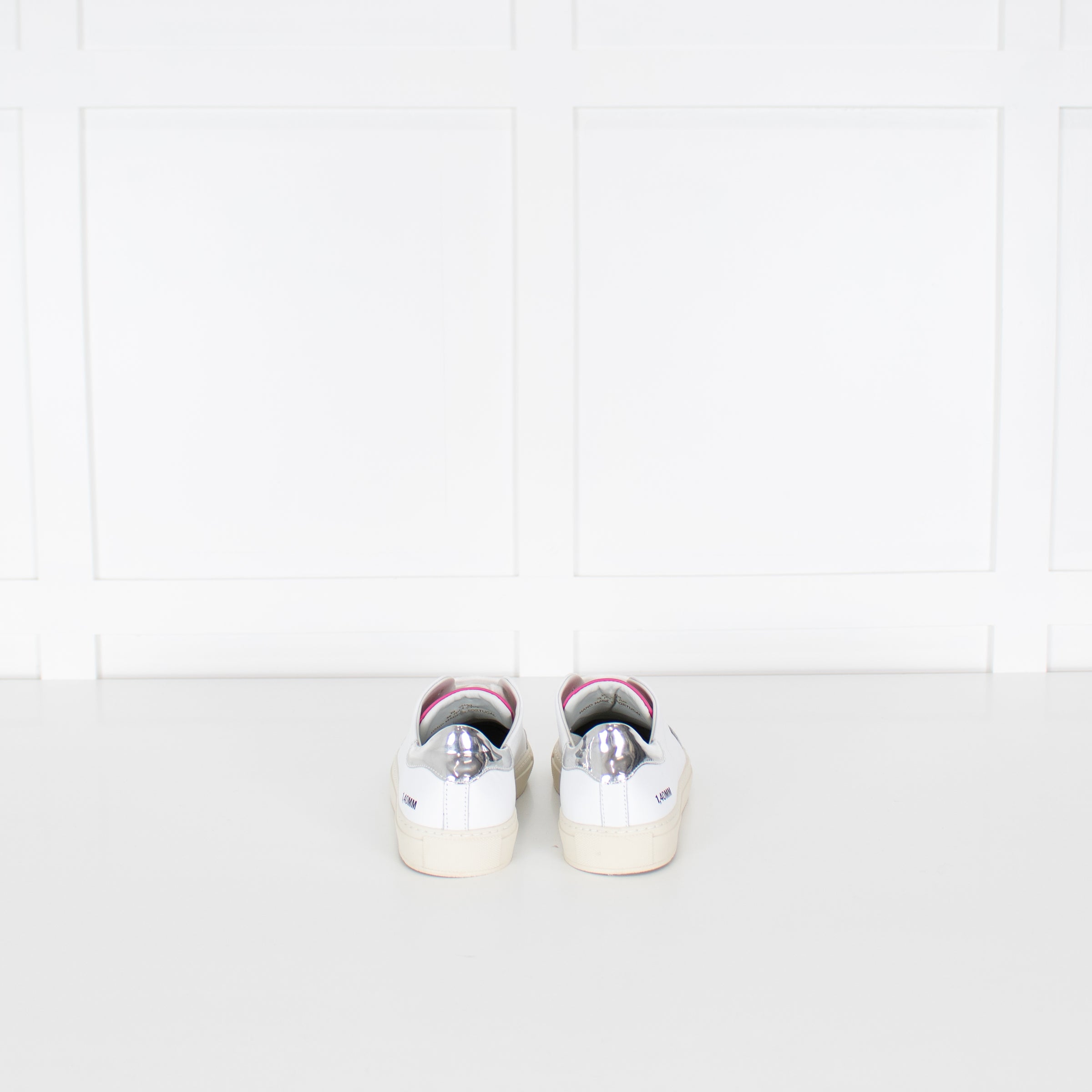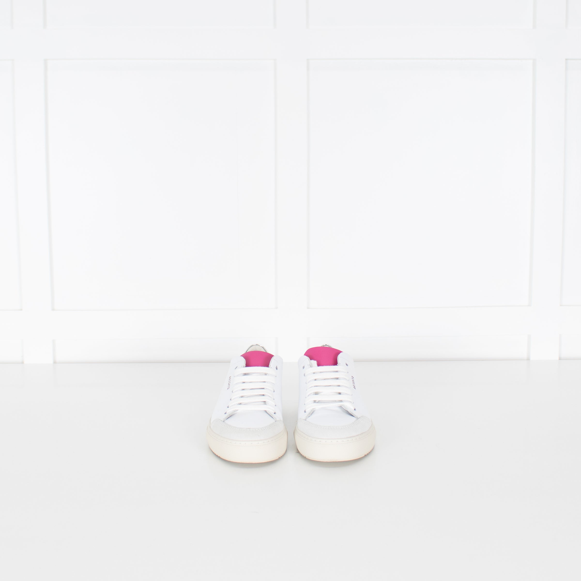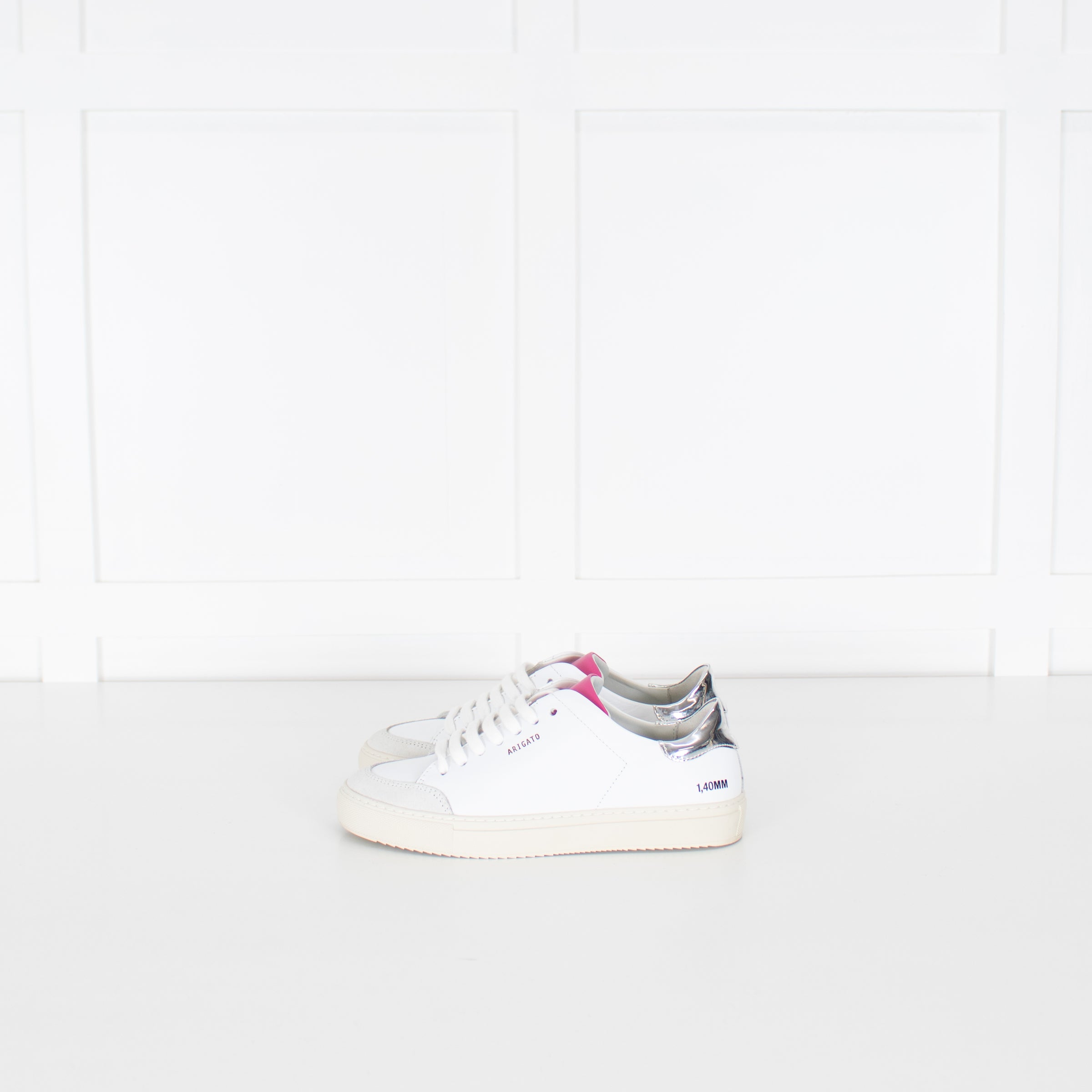 Axel Arigato white trainers, featuring gorgeous pink and silver block accents with a suede front and a small chunky rubber sole.