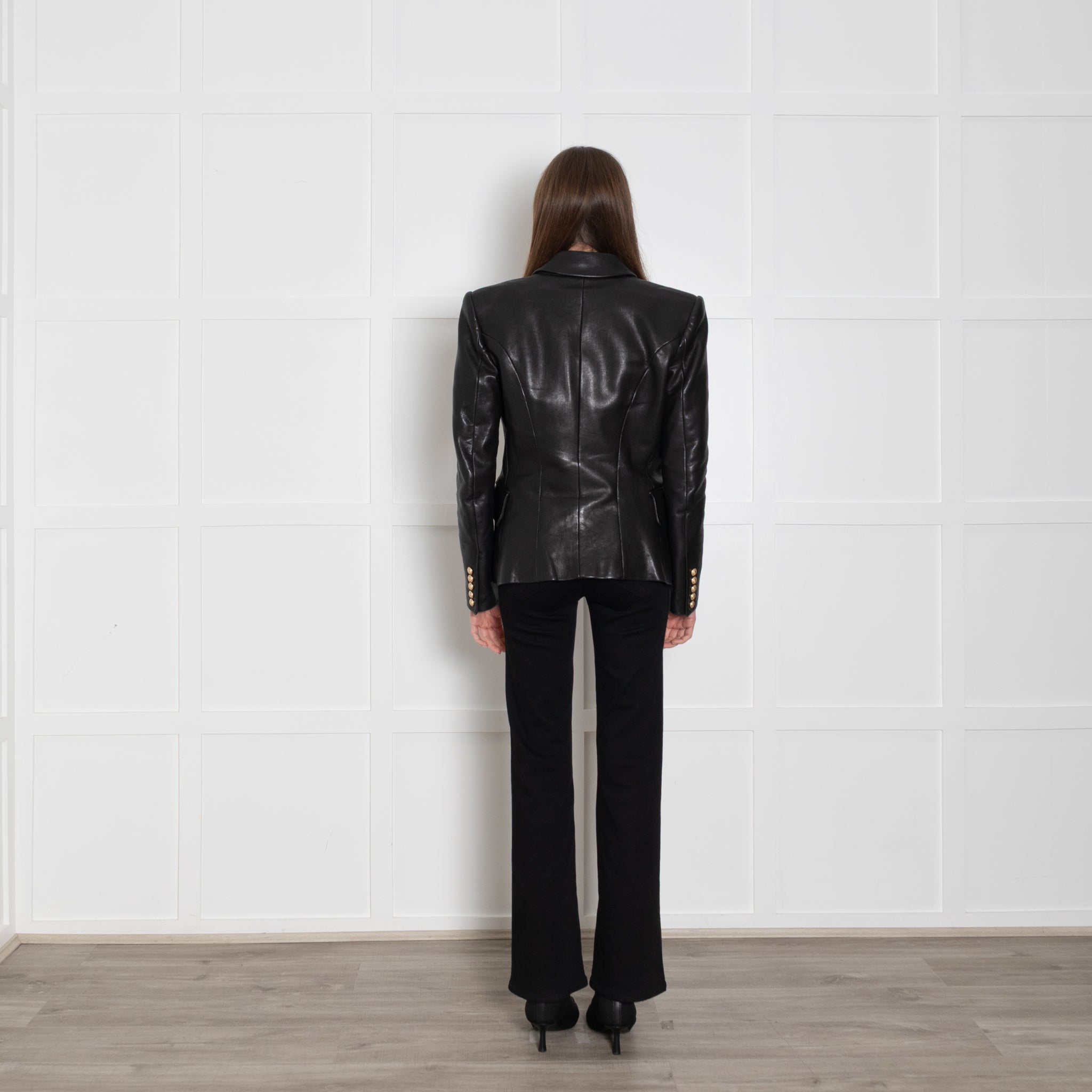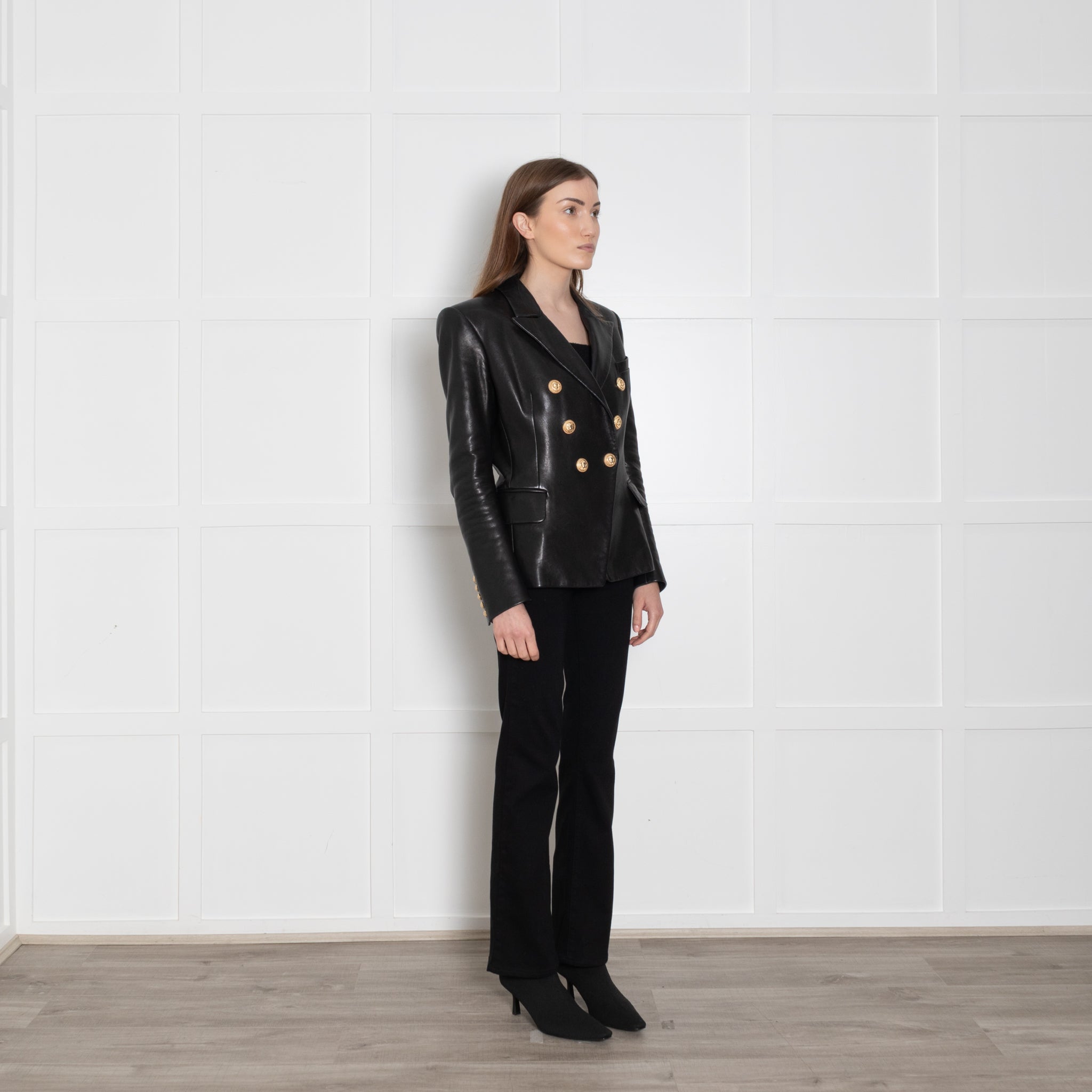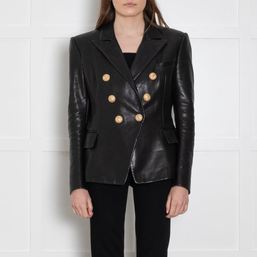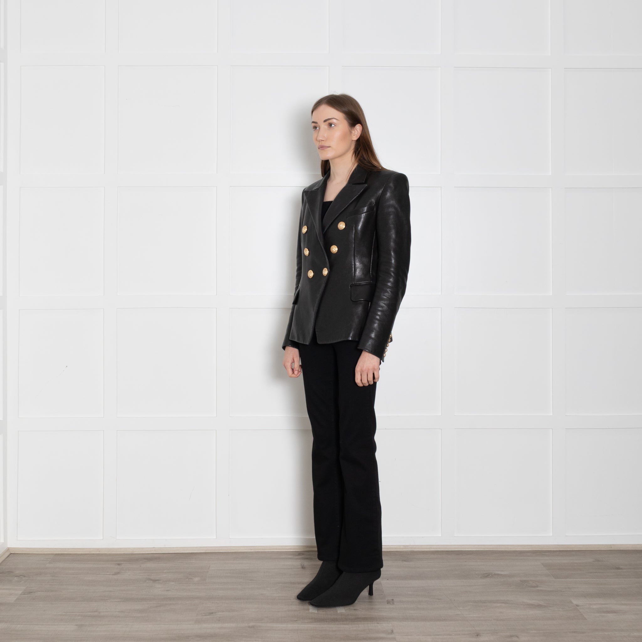 Balmain black leather double-breasted blazer with shoulder padding and iconic lion-engraved gold-tone buttons. This blazer features a pointed collar and lapel, two front flap pockets, and one front slip pocket.