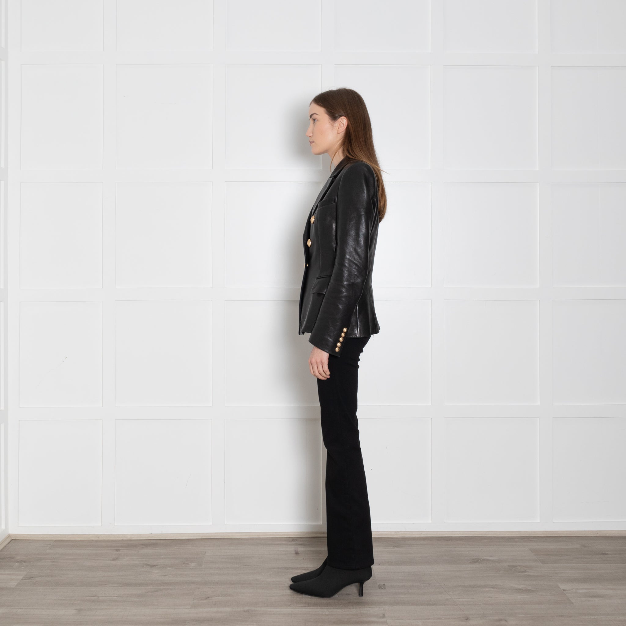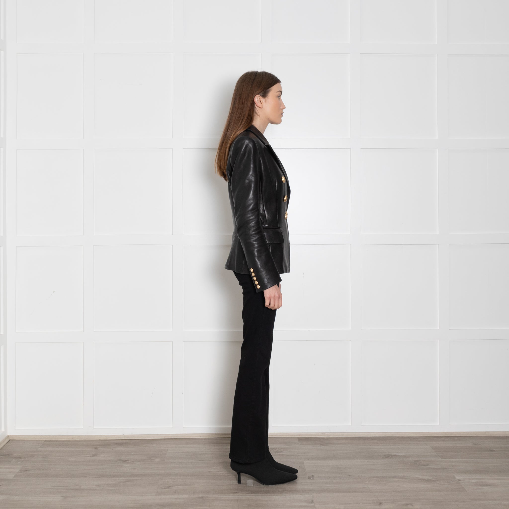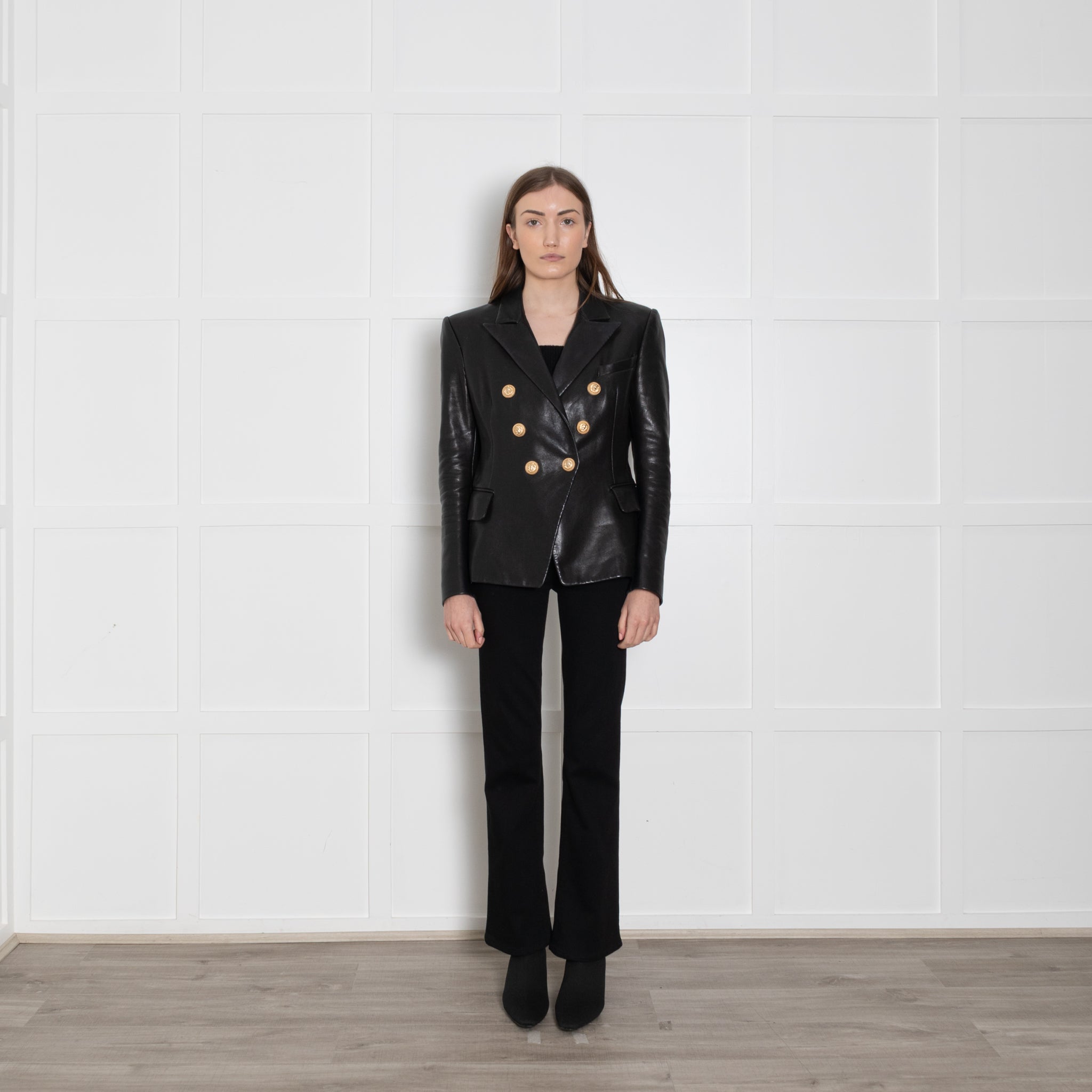 Balmain black leather double-breasted blazer with shoulder padding and iconic lion-engraved gold-tone buttons. This blazer features a pointed collar and lapel, two front flap pockets, and one front slip pocket.