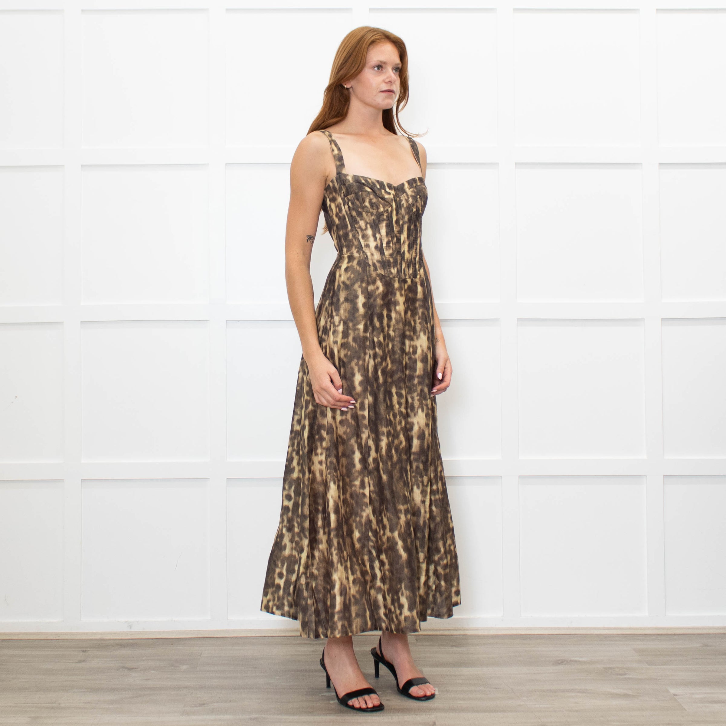 Bardot brown animal print corseted fitted midi dress. Sweetheart neckline with a zip fastening to the back.