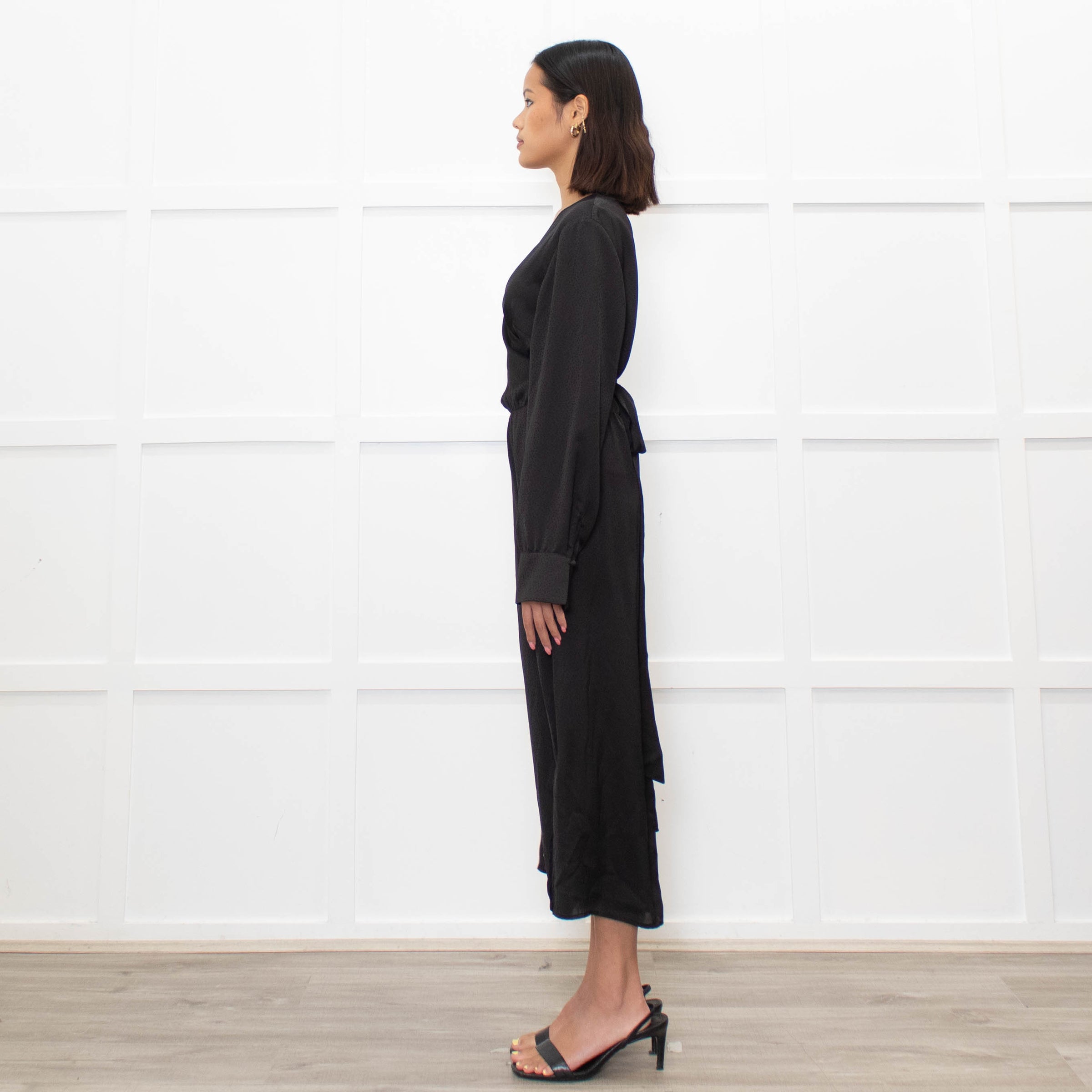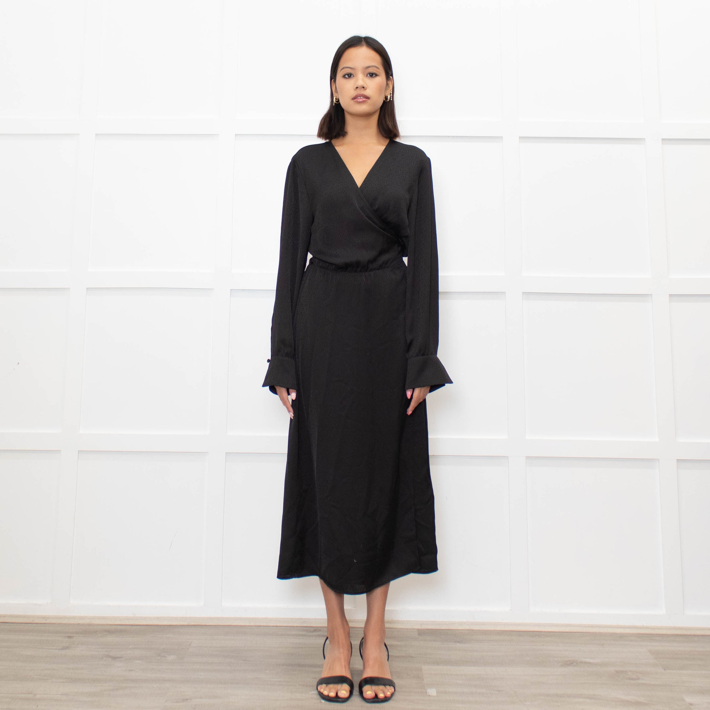 Ba&sh black on black jacquard woven wrap dress with long sleeves gathered into the cuffs, a V-shaped neckline, and a tied belt.