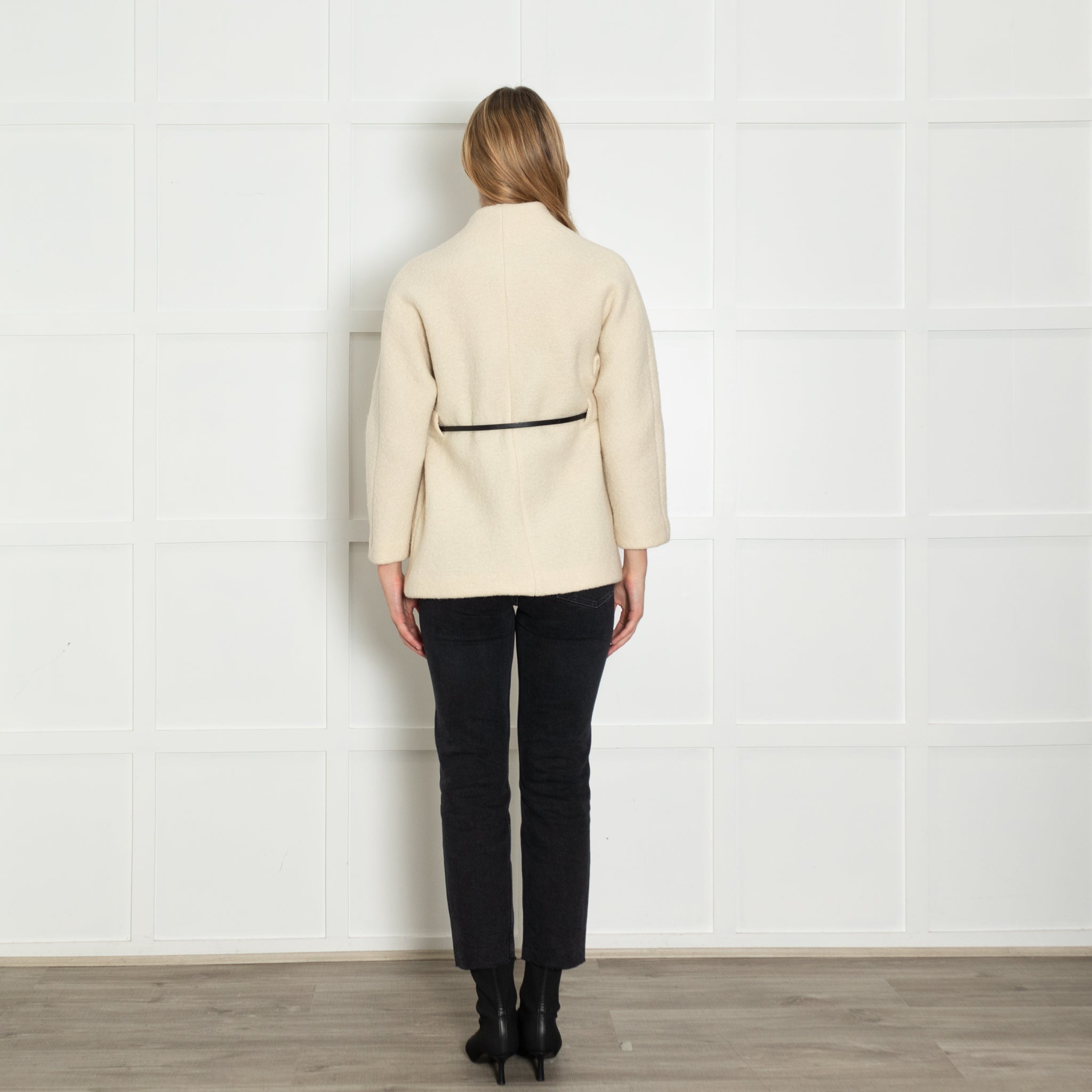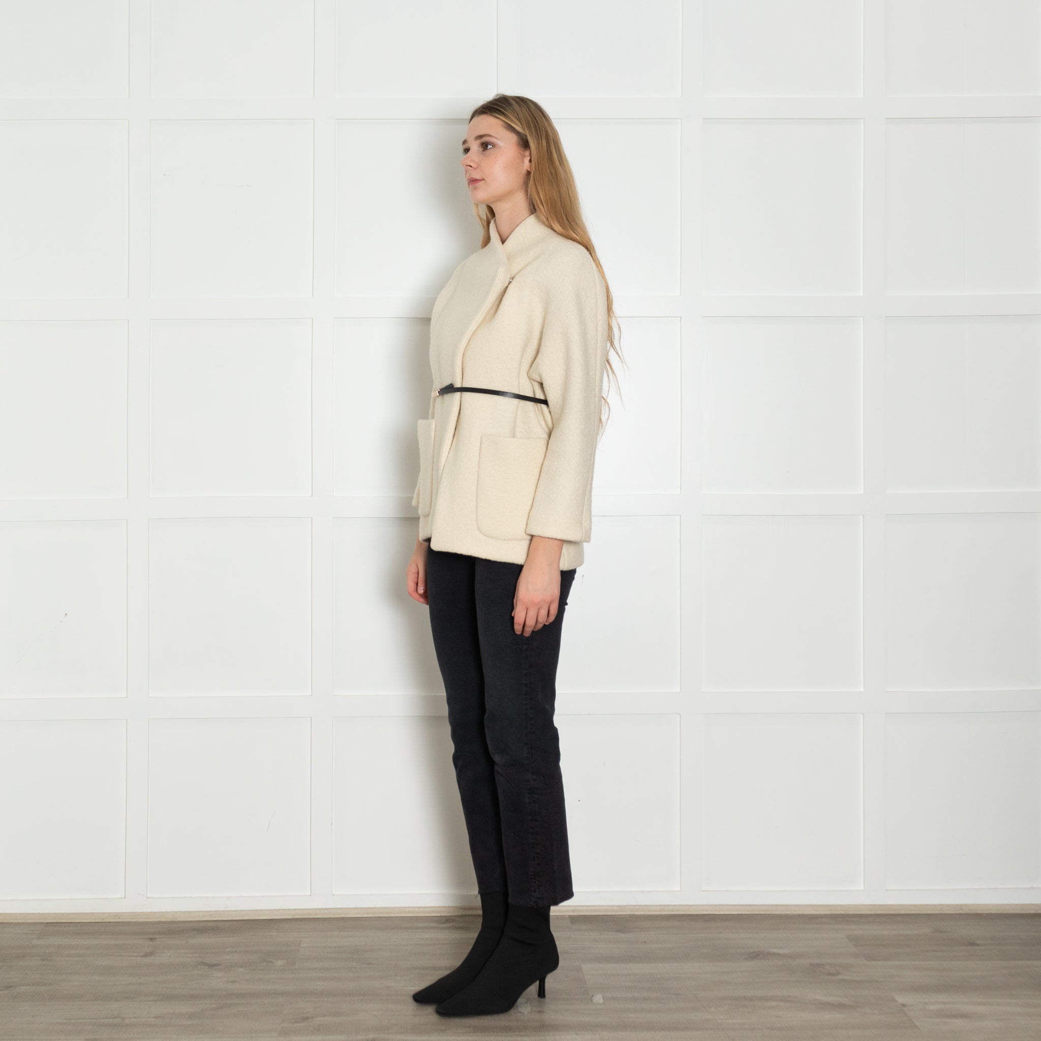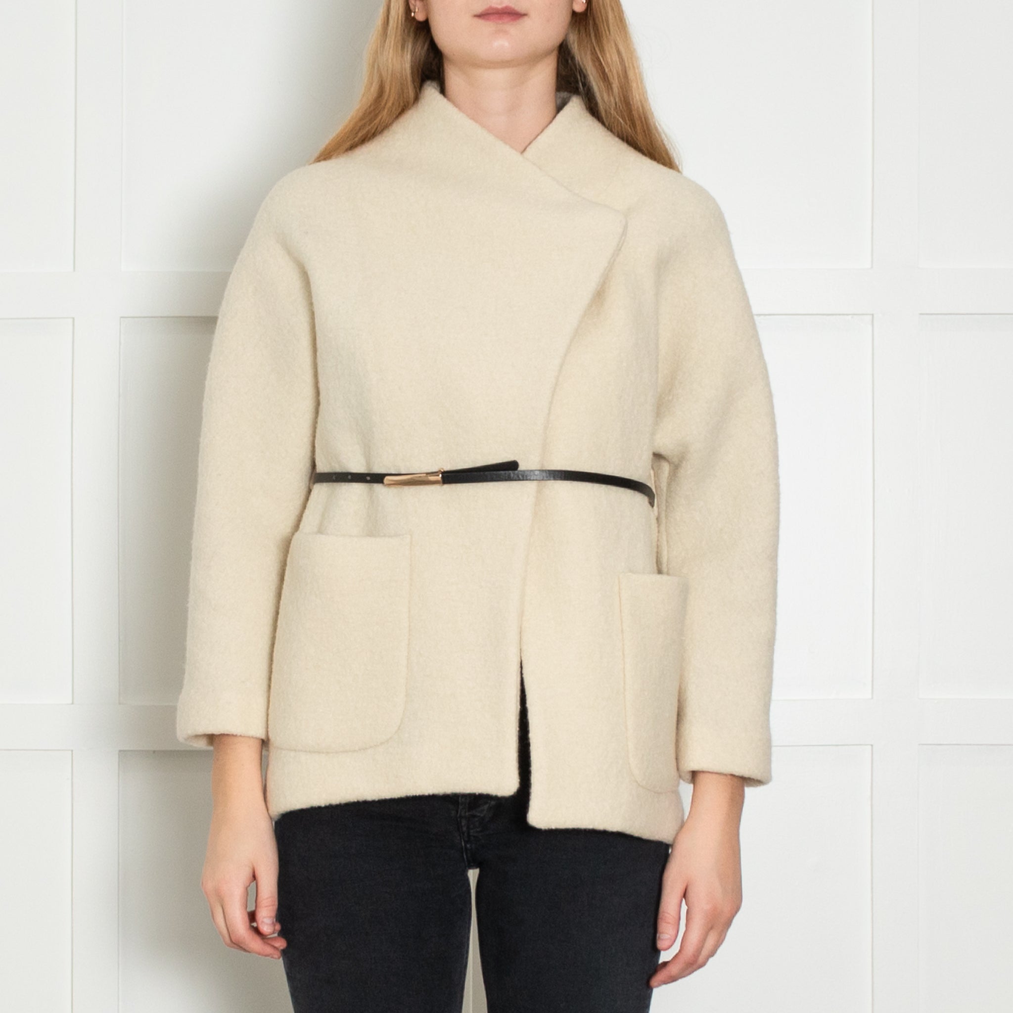 Ba&sh 'Lady Coat'. Cream textured wool and leather with a black leather belt to the waist. Crossover neckline and two symmetrical open pockets to the front.