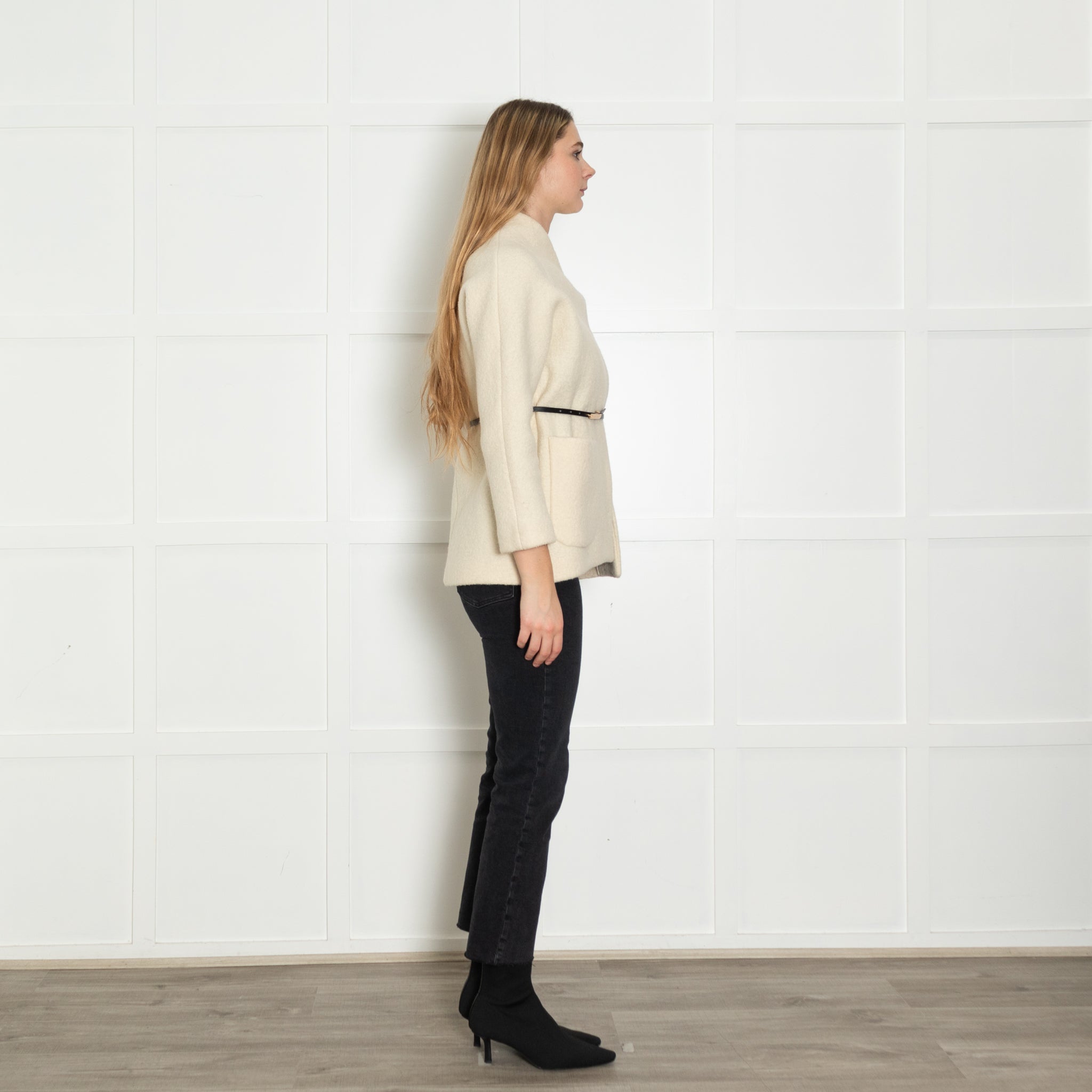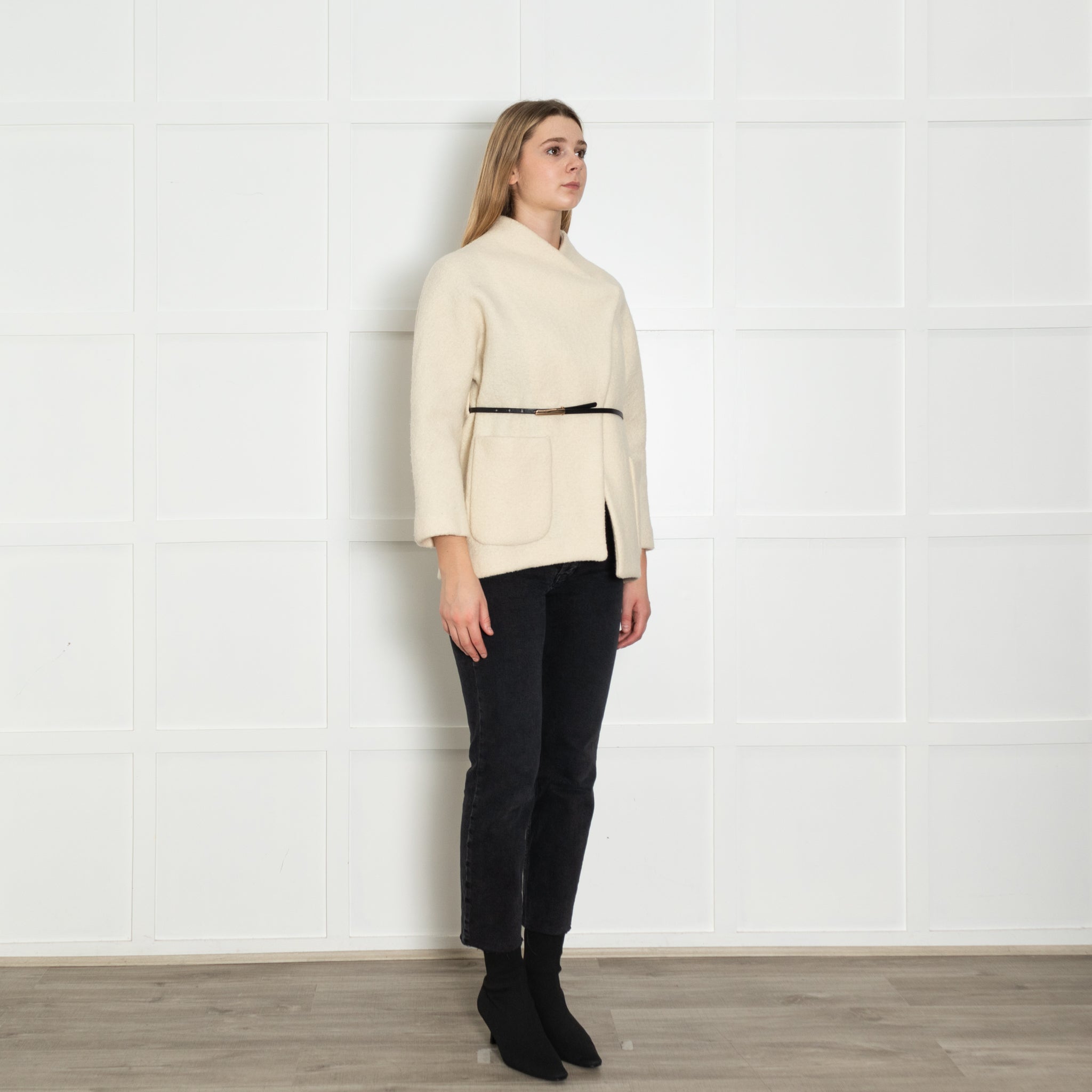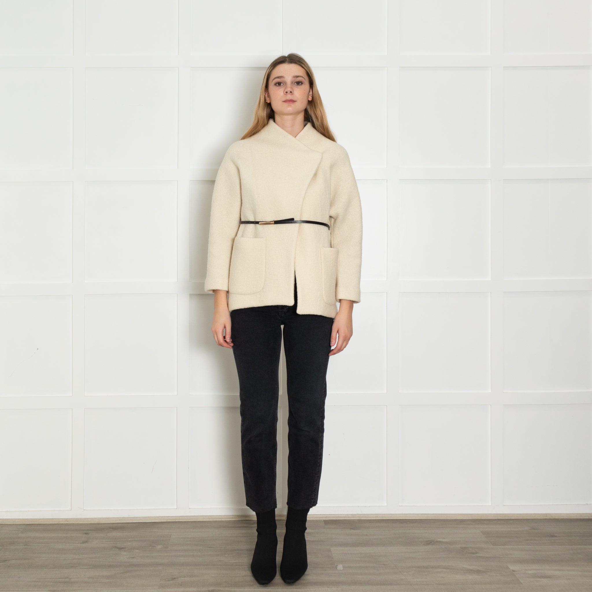 Ba&sh 'Lady Coat'. Cream textured wool and leather with a black leather belt to the waist. Crossover neckline and two symmetrical open pockets to the front.
