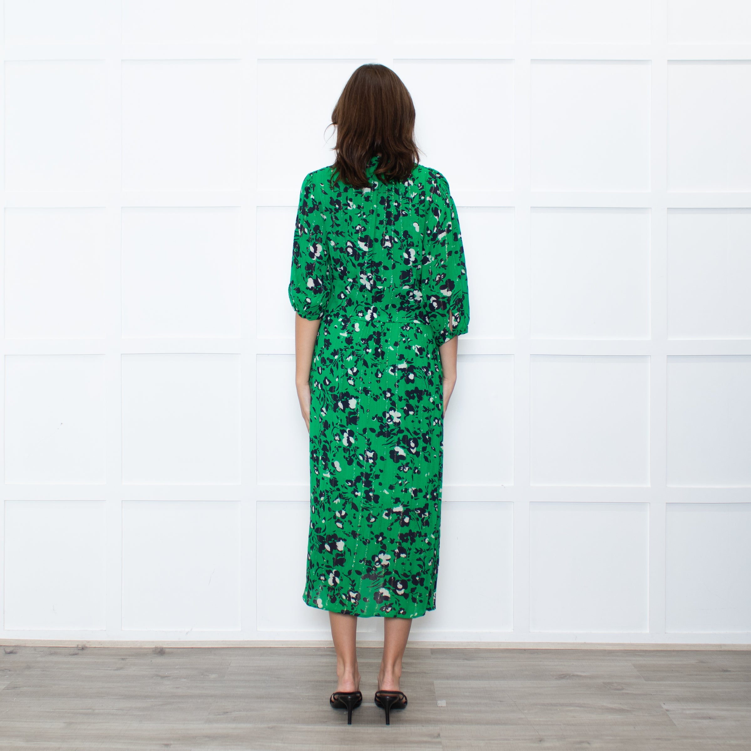 Ba&sh green and black floral print midi dress with a silver lurex thread running through the pattern, a button-up front, and cropped sleeves.