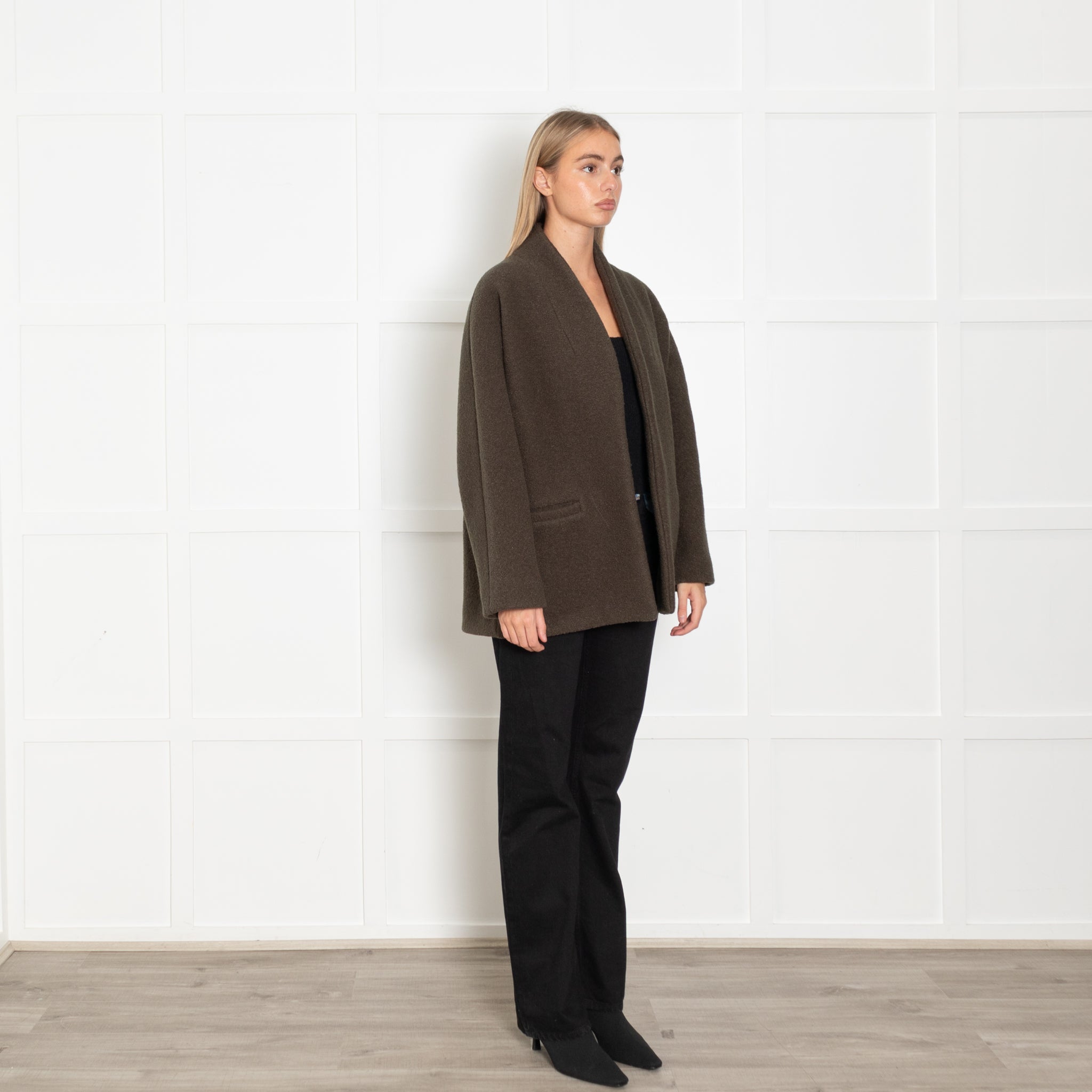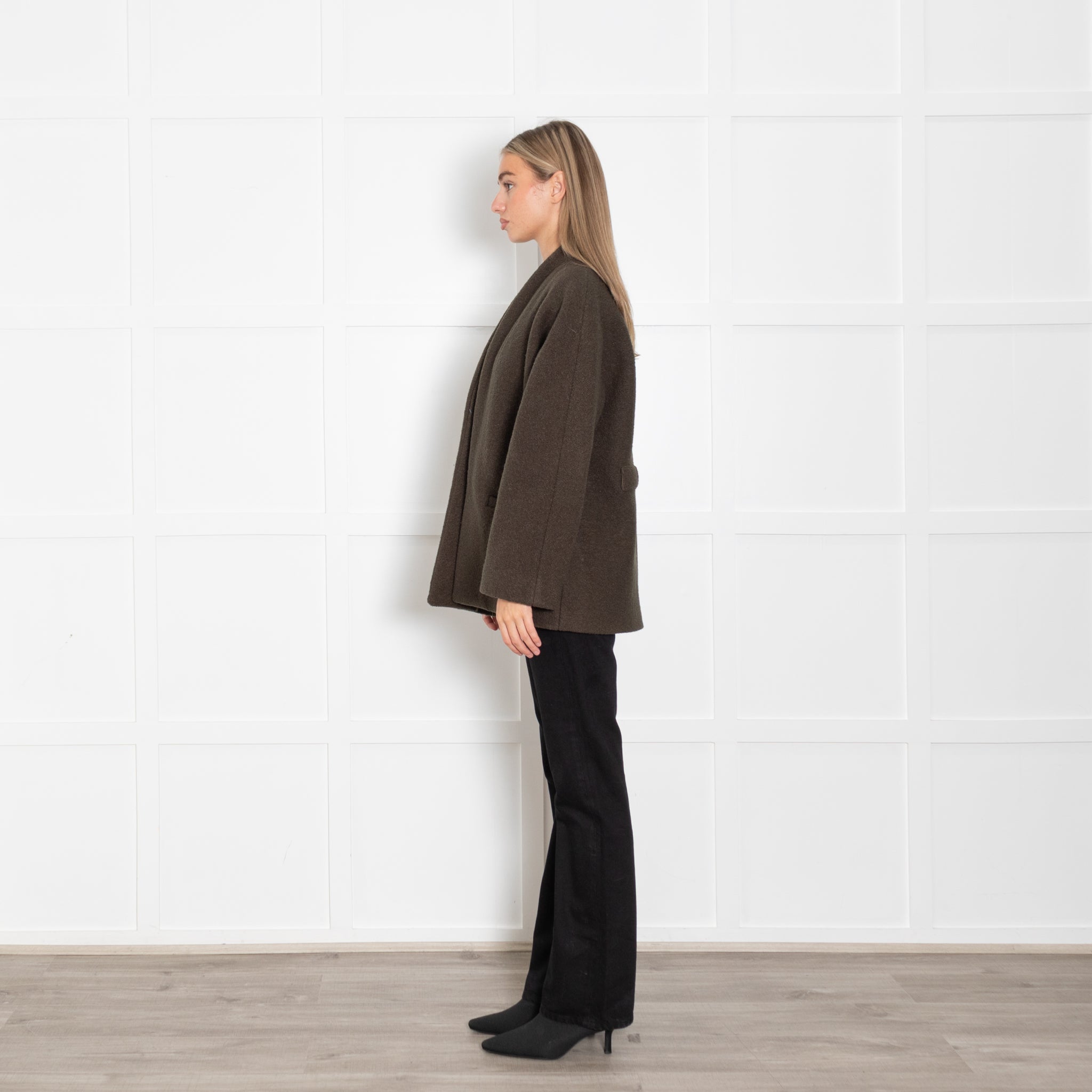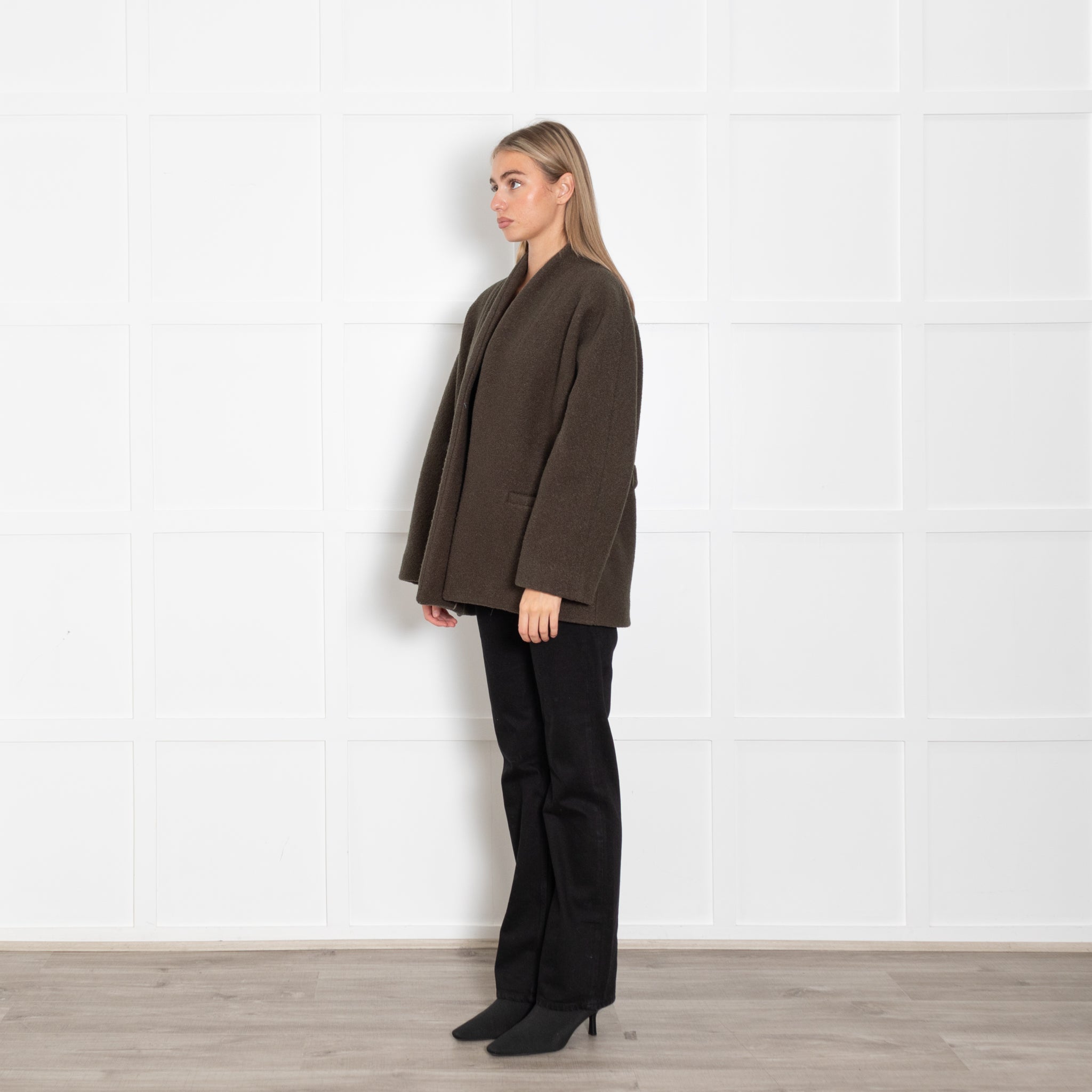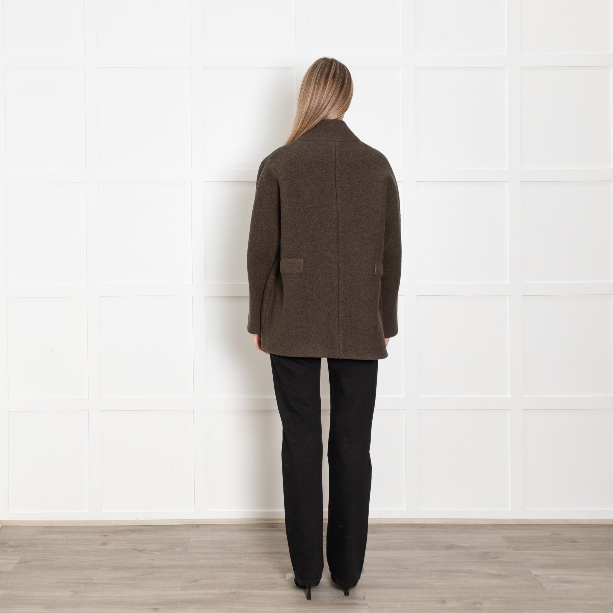 Ba&sh green long-sleeve coat, crafted with a soft wool mix fabric, featuring a hini short design with an open front, a large classic collar, and two spacious front pockets.
