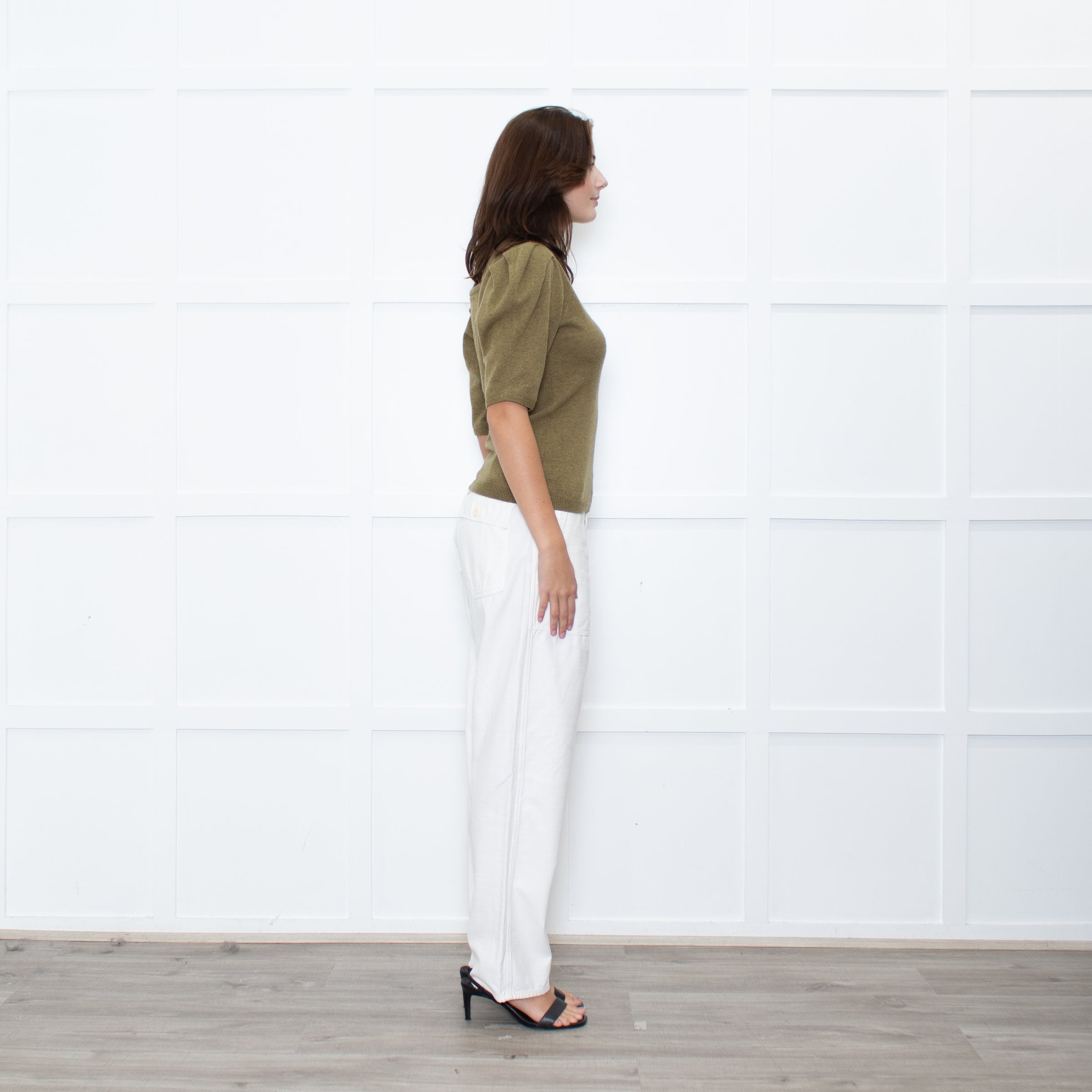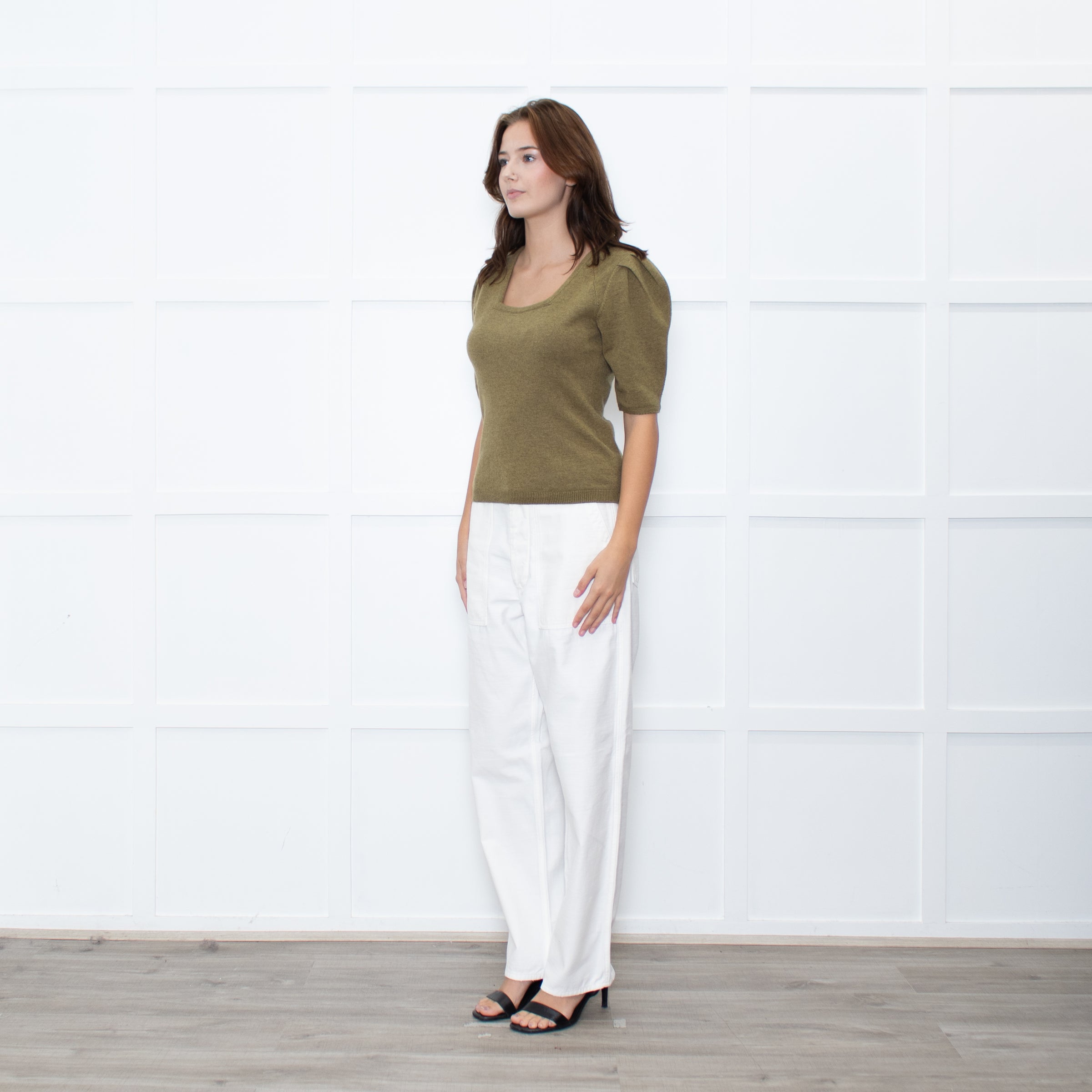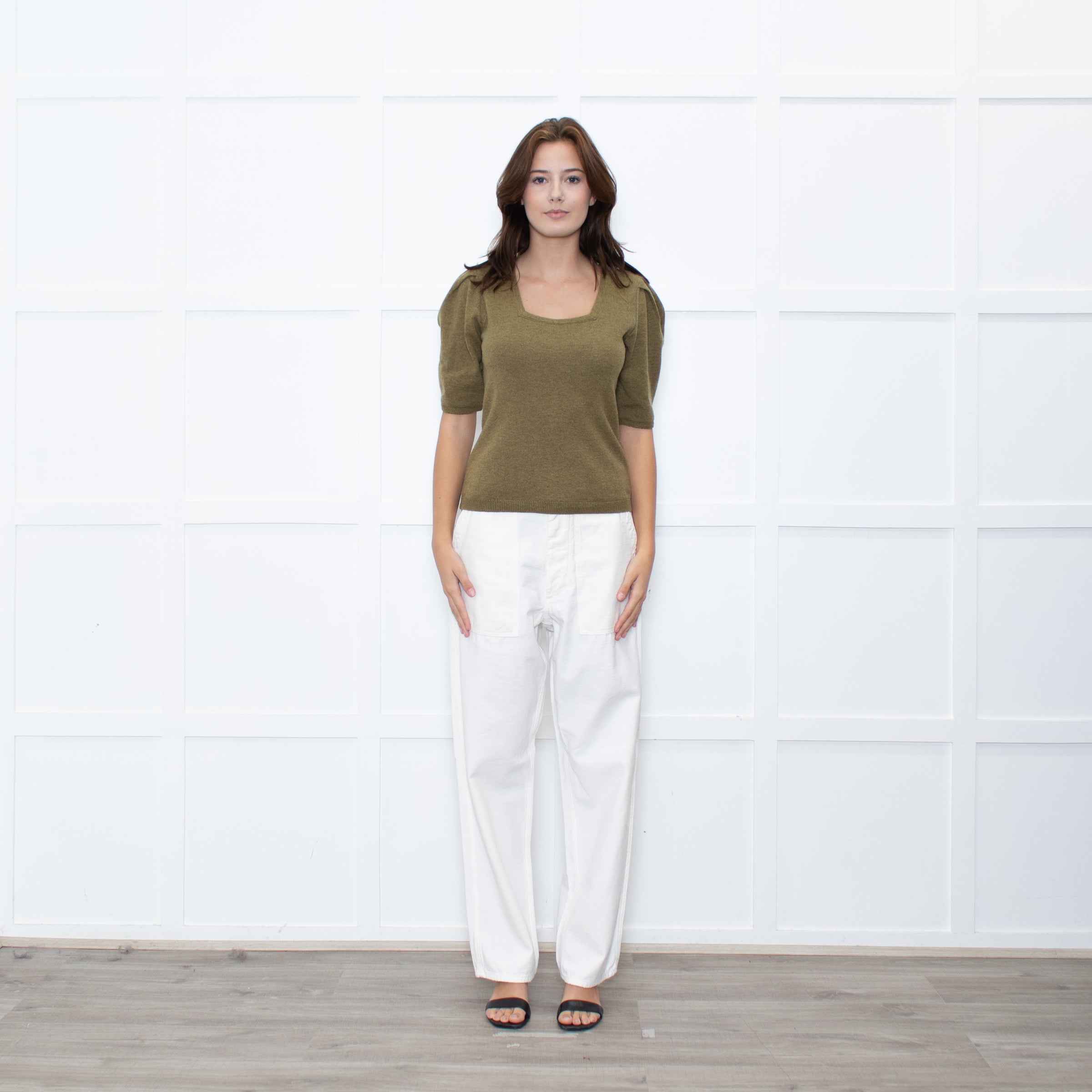 Ba&Sh olive green short-sleeve jumper crafted from wool. Designed with a square neckline, ribbed waist, and a relaxed yet flattering fit.