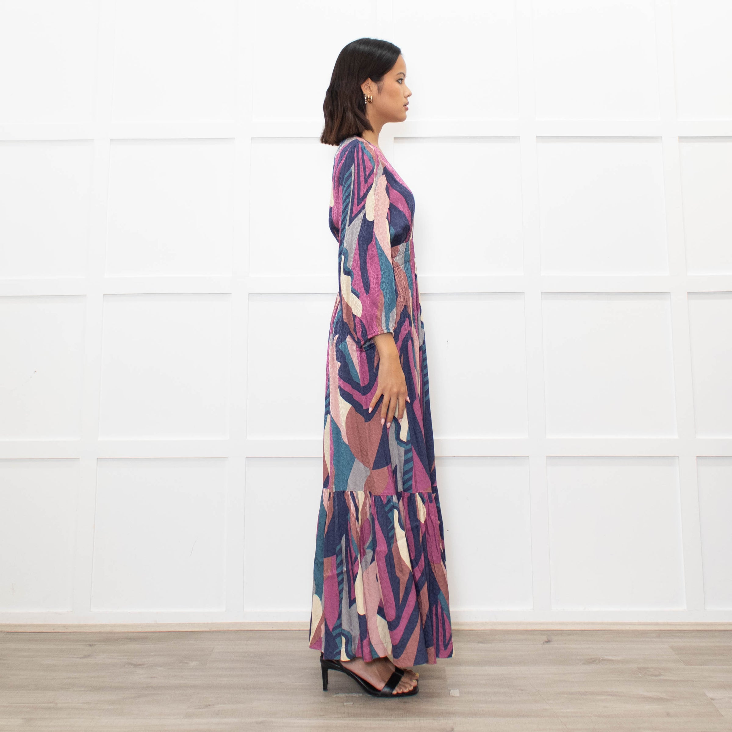 Ba&Sh purple blue V-necked long dress with elasticated sleeve cuffs, and a pleated hem.