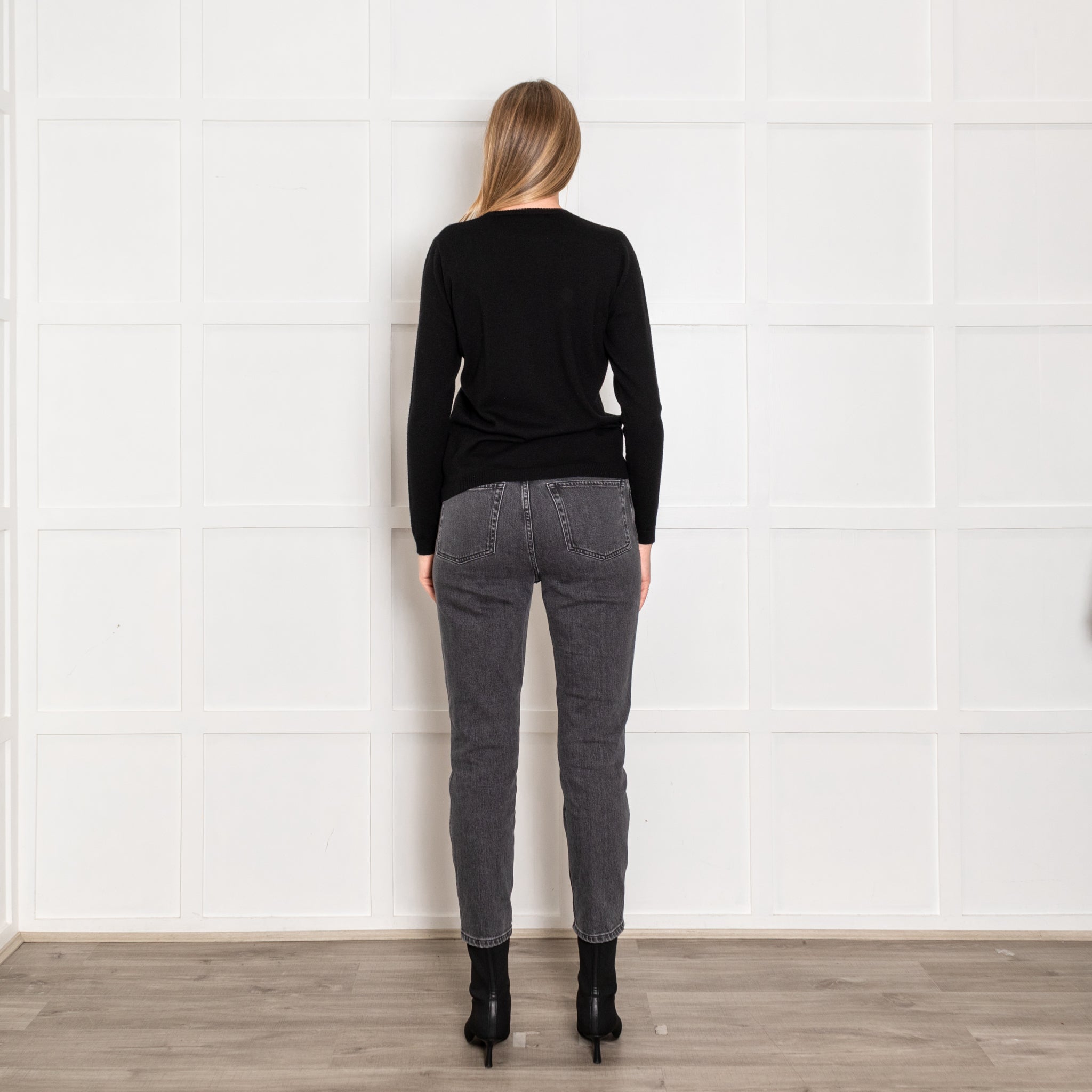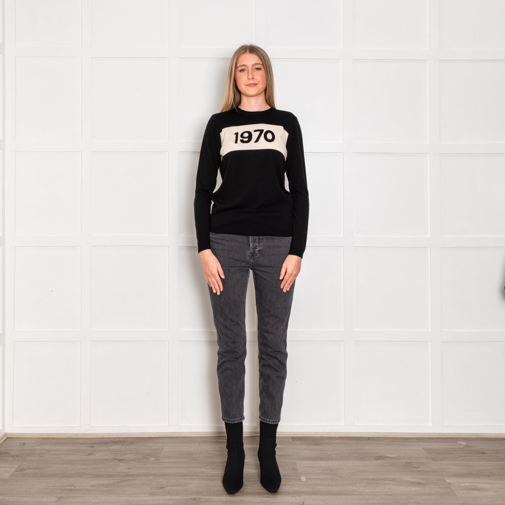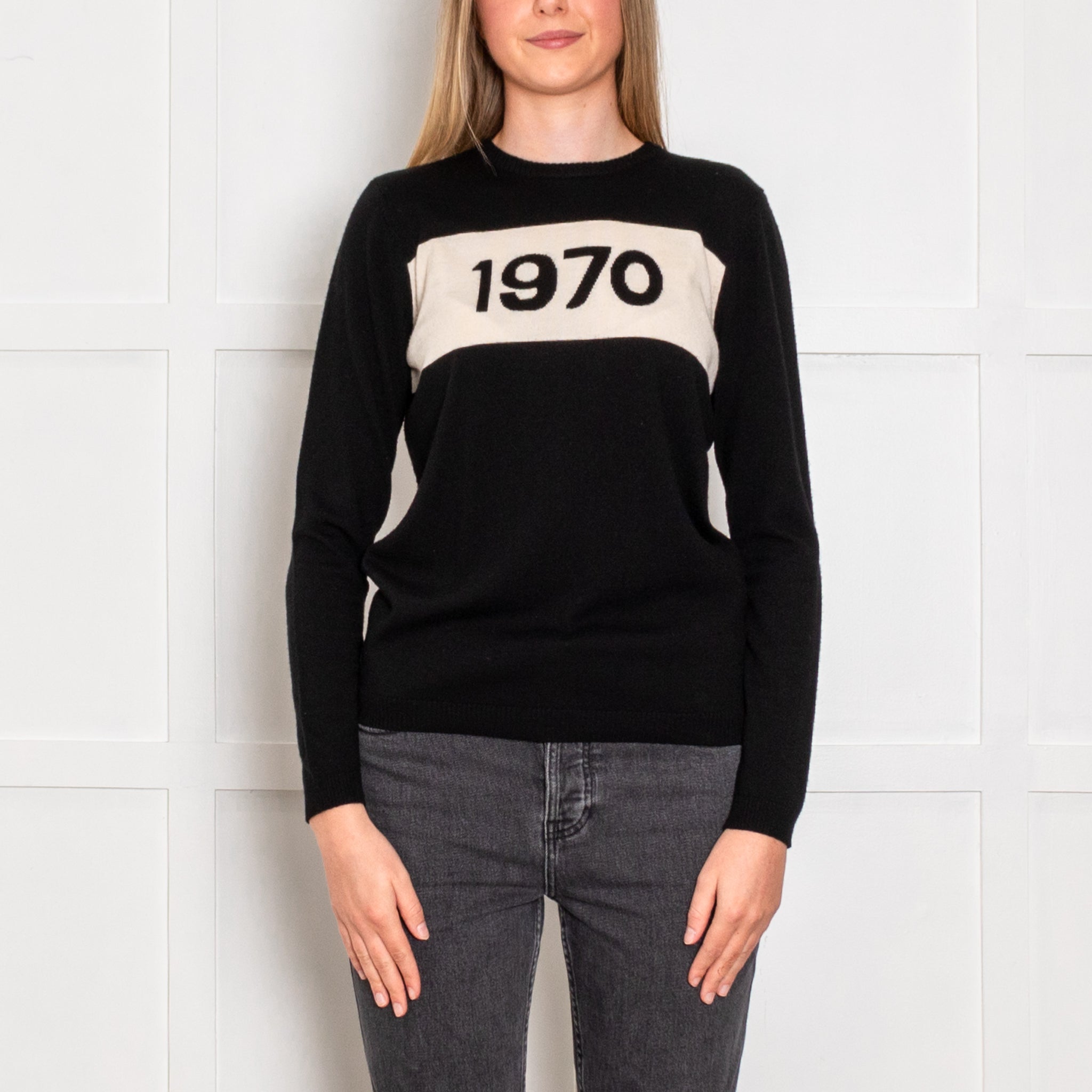 Bella Freud black and cream 1970 merino wool jumper with a rounded neckline and ribbed trim detailing.