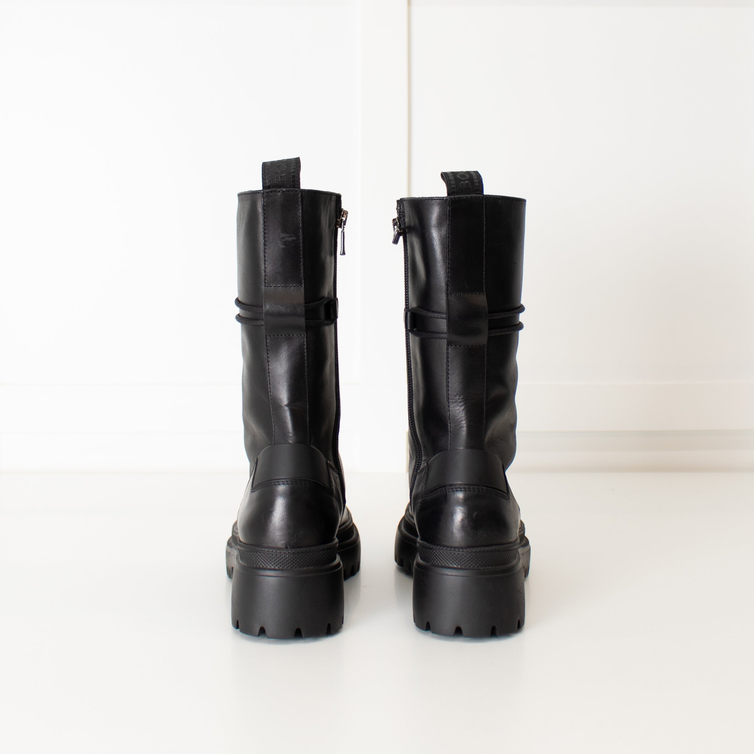 Bogner black smooth leather high boots with lace-up fronts, an internal zip for ease, a rounded toe, chunky rubber cleated soles, and a pull tab at the back of the ankle.
