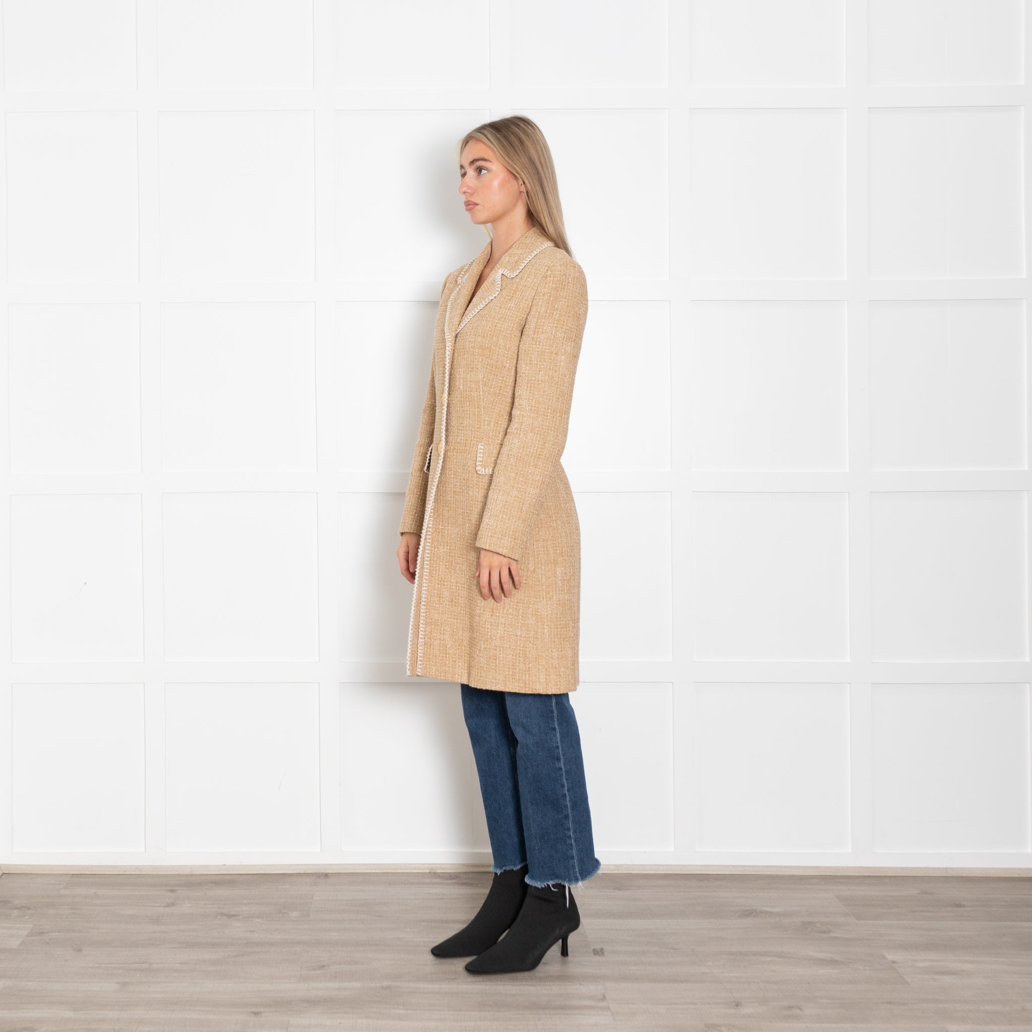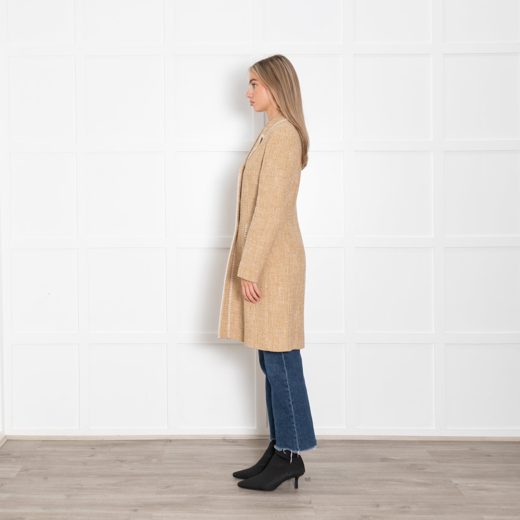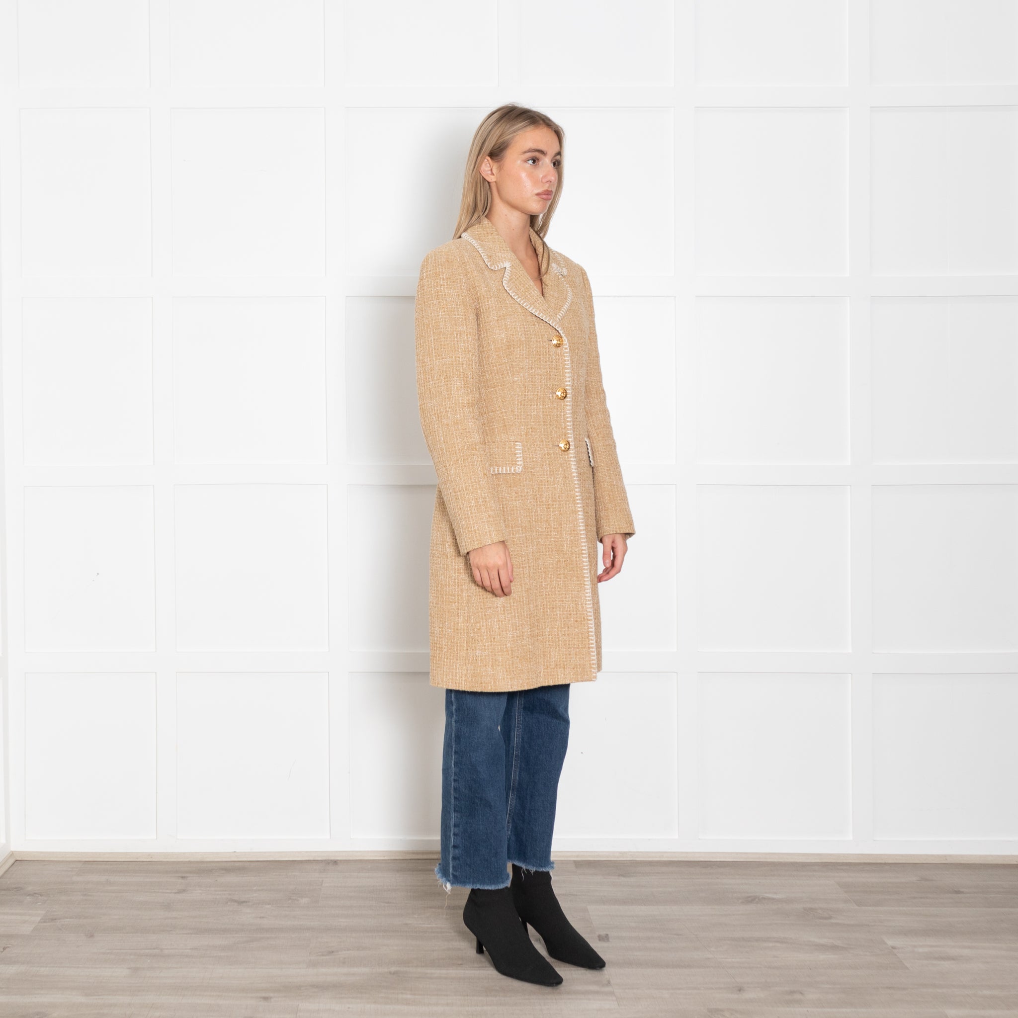 Boutique Moschino long sleeve beige boucle coat, with a stunning white stitch edge detailing, a large classic collar, with a gold button up front closure, and a two front flap pocket design.