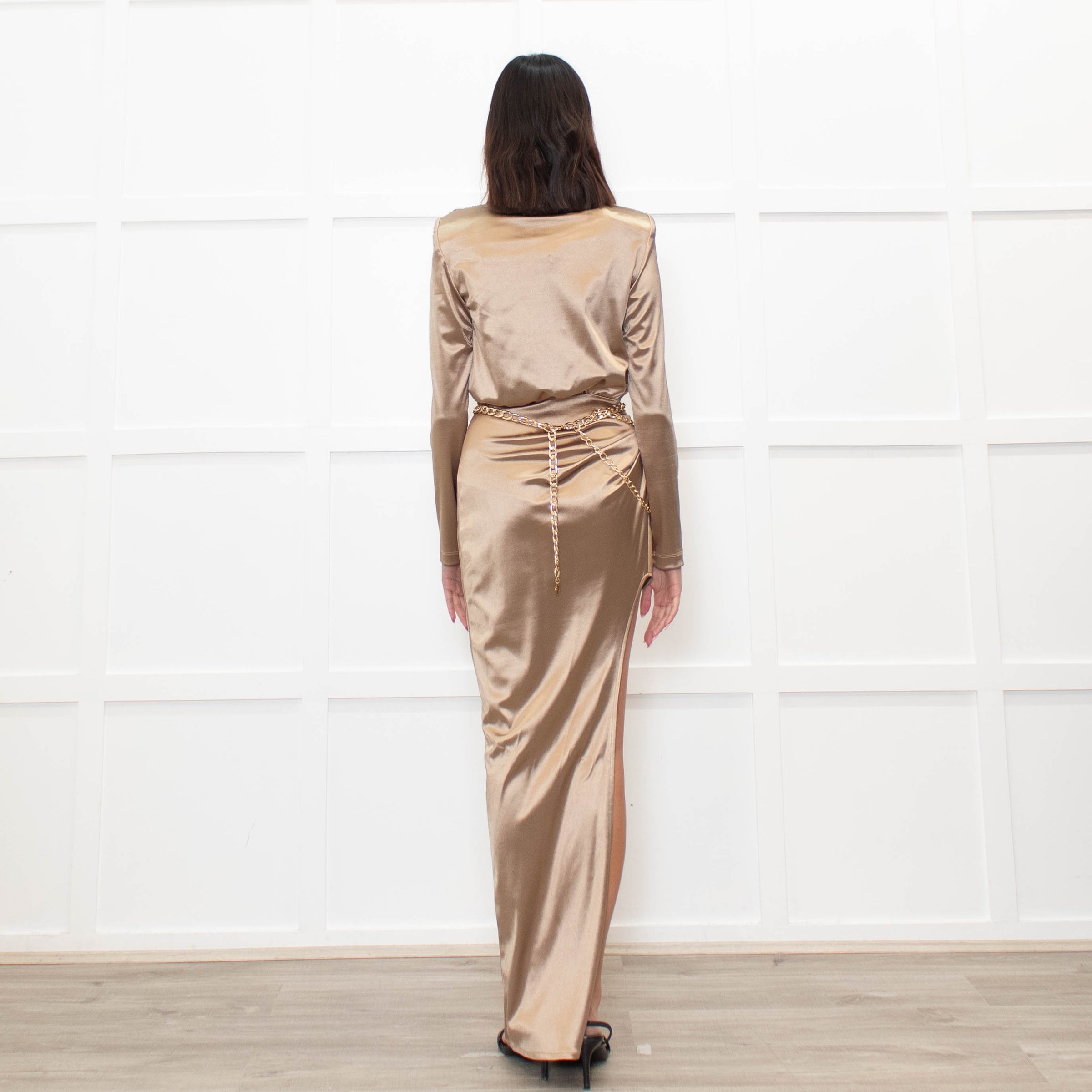 Bronx & Banco gold satin ruched maxi dress with side leg split and gold chain waist belt. This dress features exaggerated shoulder padding and is new with tags.