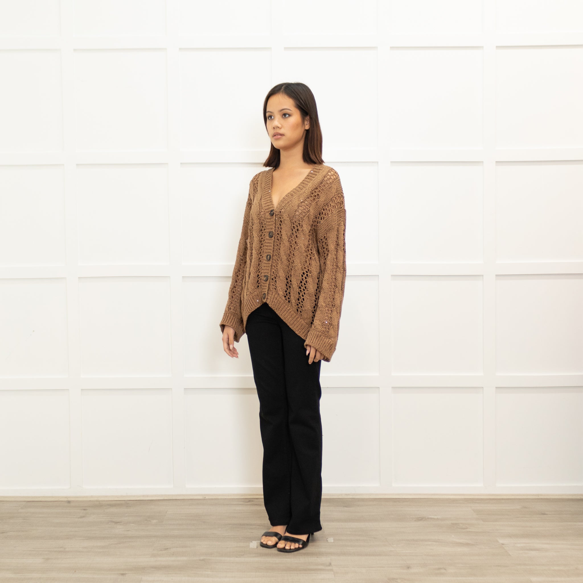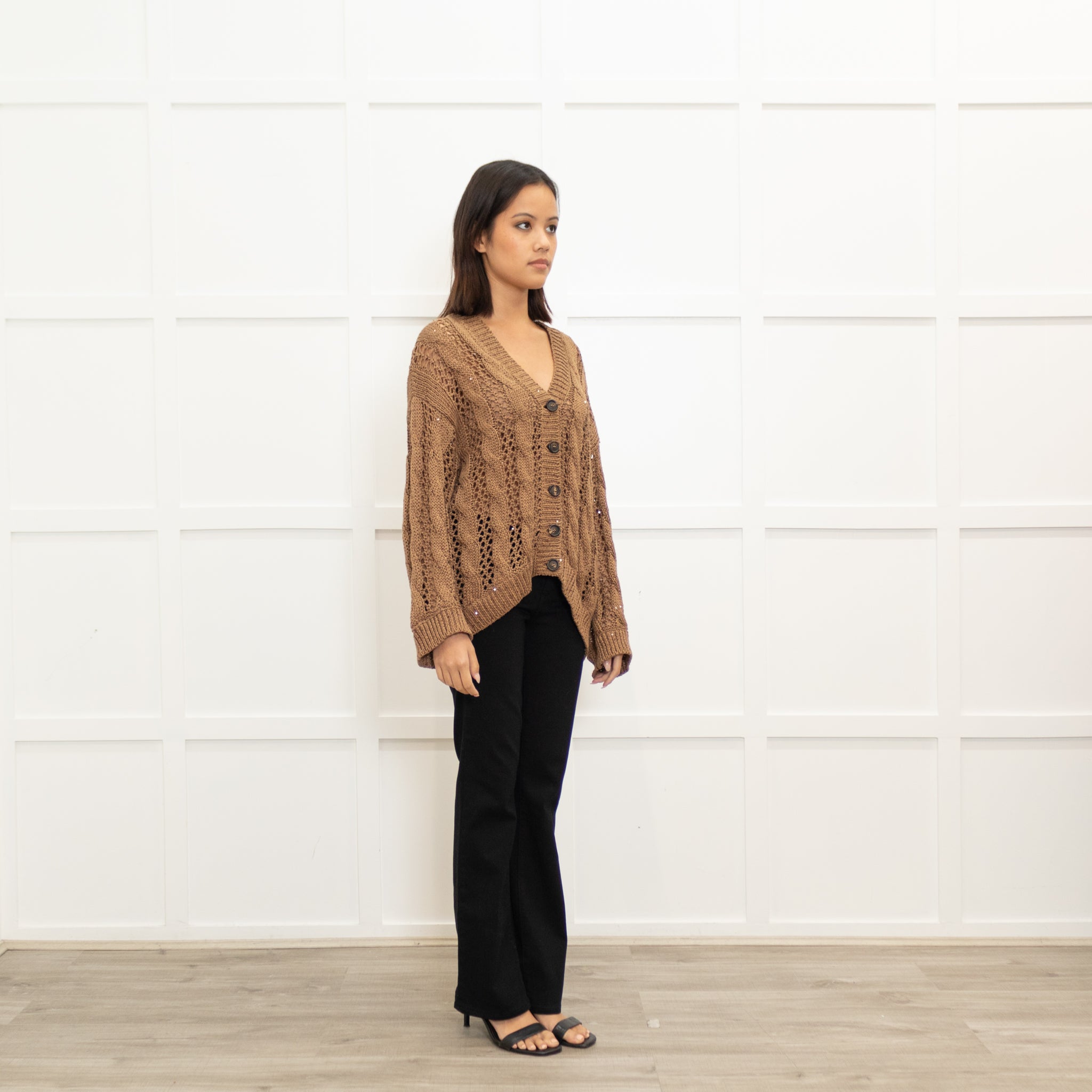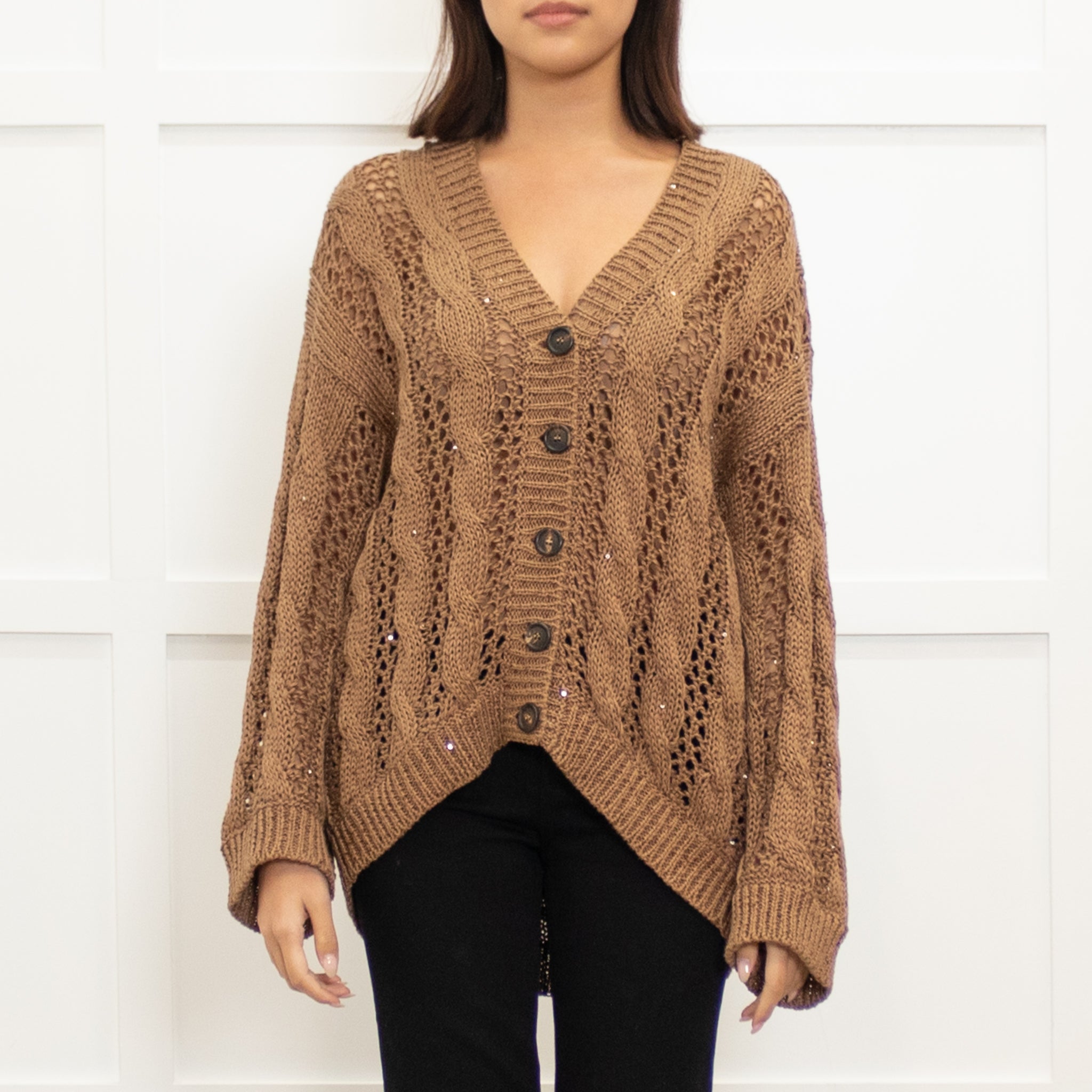 Brunello Cuccinelli brown loose knit v neck sequin cardigan with five buttons featuring an open knit pattern.