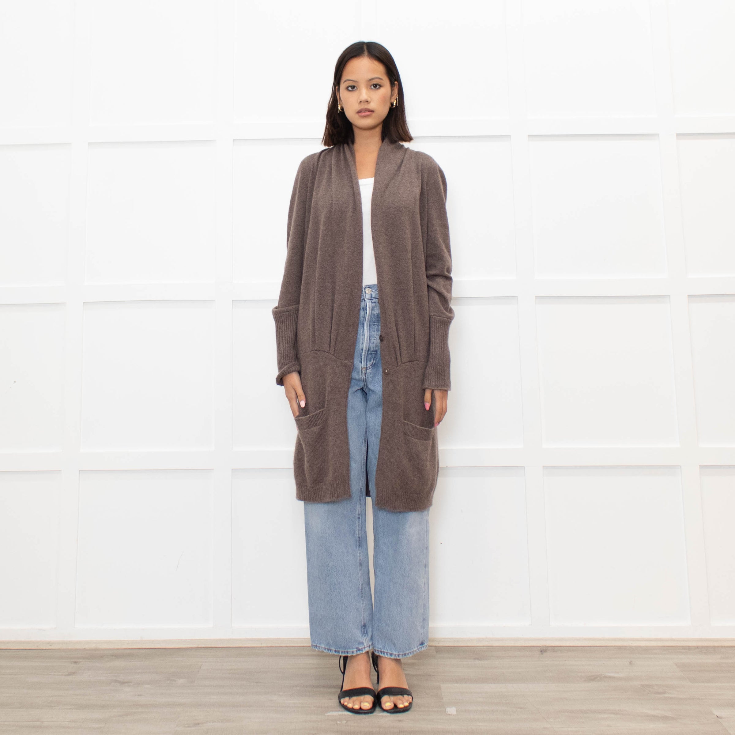 Brunello Cuccinelli brown popper front long cashmere cardigan with cinching into the hem, long sleeves, gathered detailing, deep ribbed trim, and side pockets.