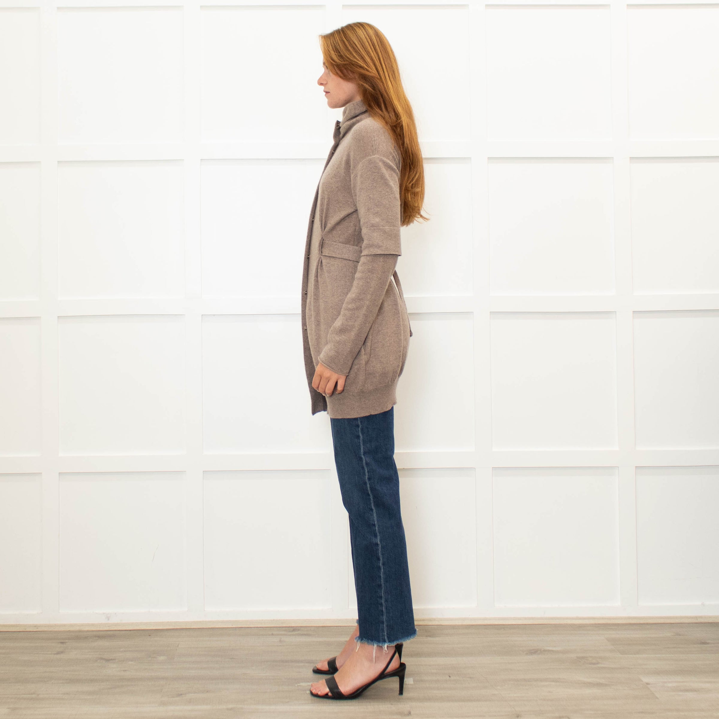 Brunello Cucinelli brown cashmere long zip front cardigan with tonal belt and cowl neck detailing.