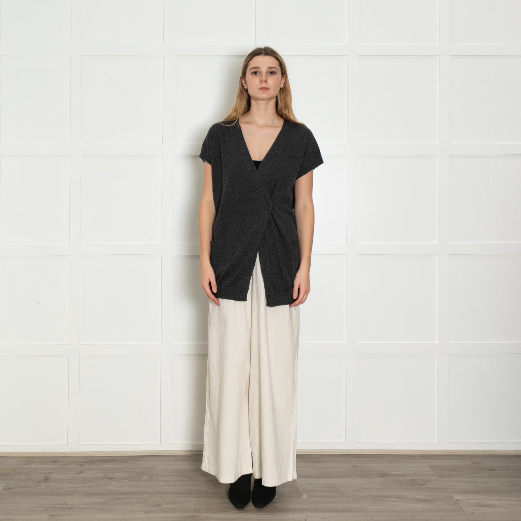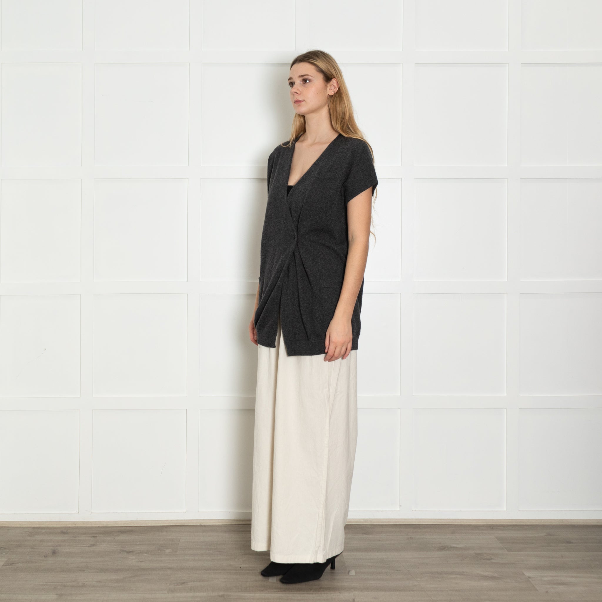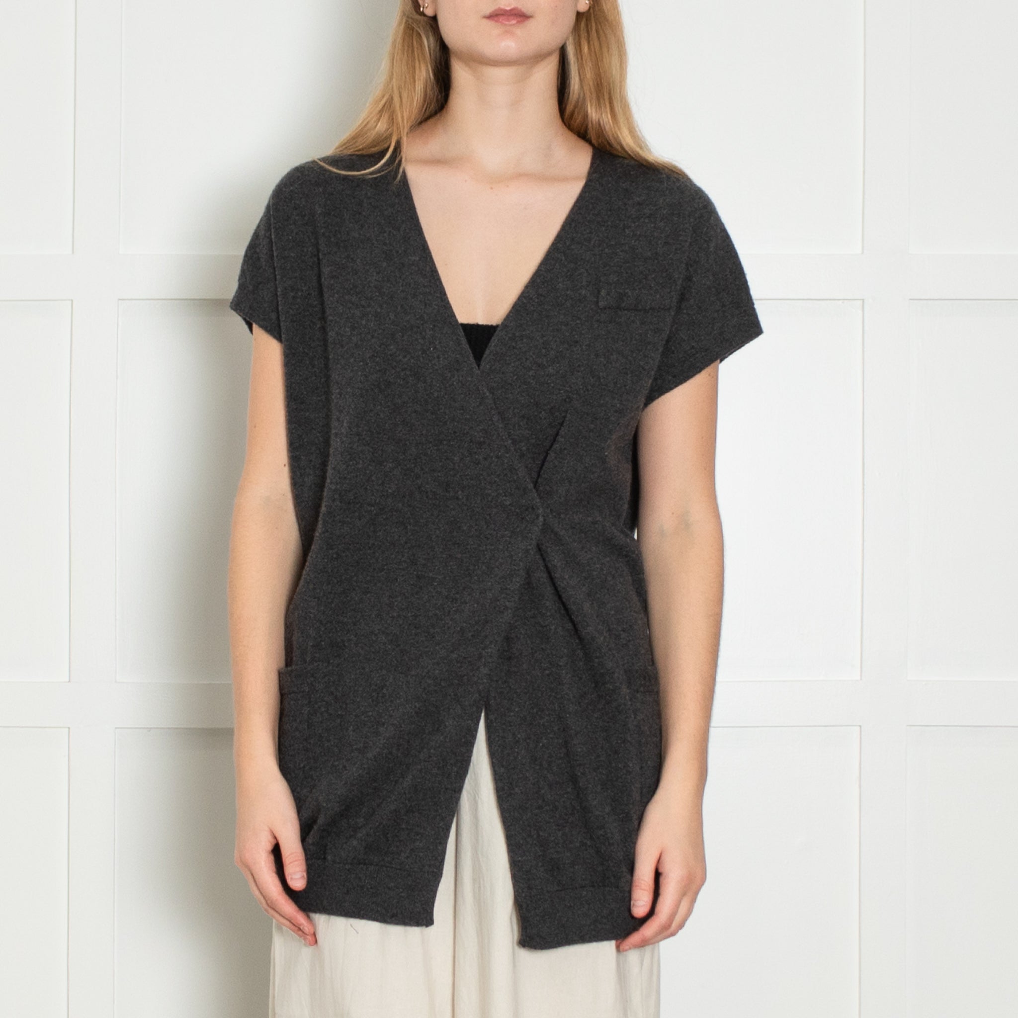 Brunello Cucinelli grey cashmere gilet. With a ribbed hemline and short capped sleeves. Symmetrical classic pockets at the hip.