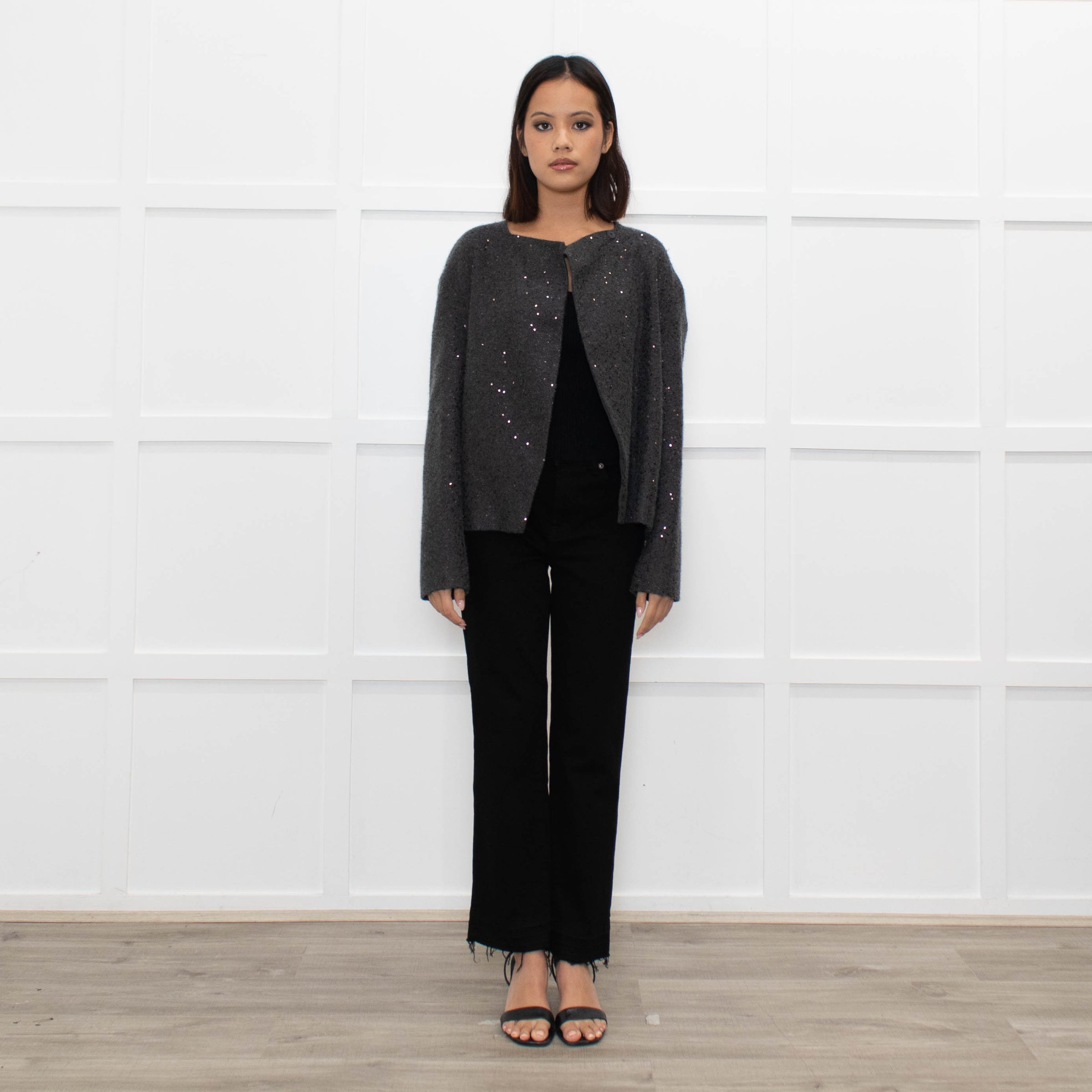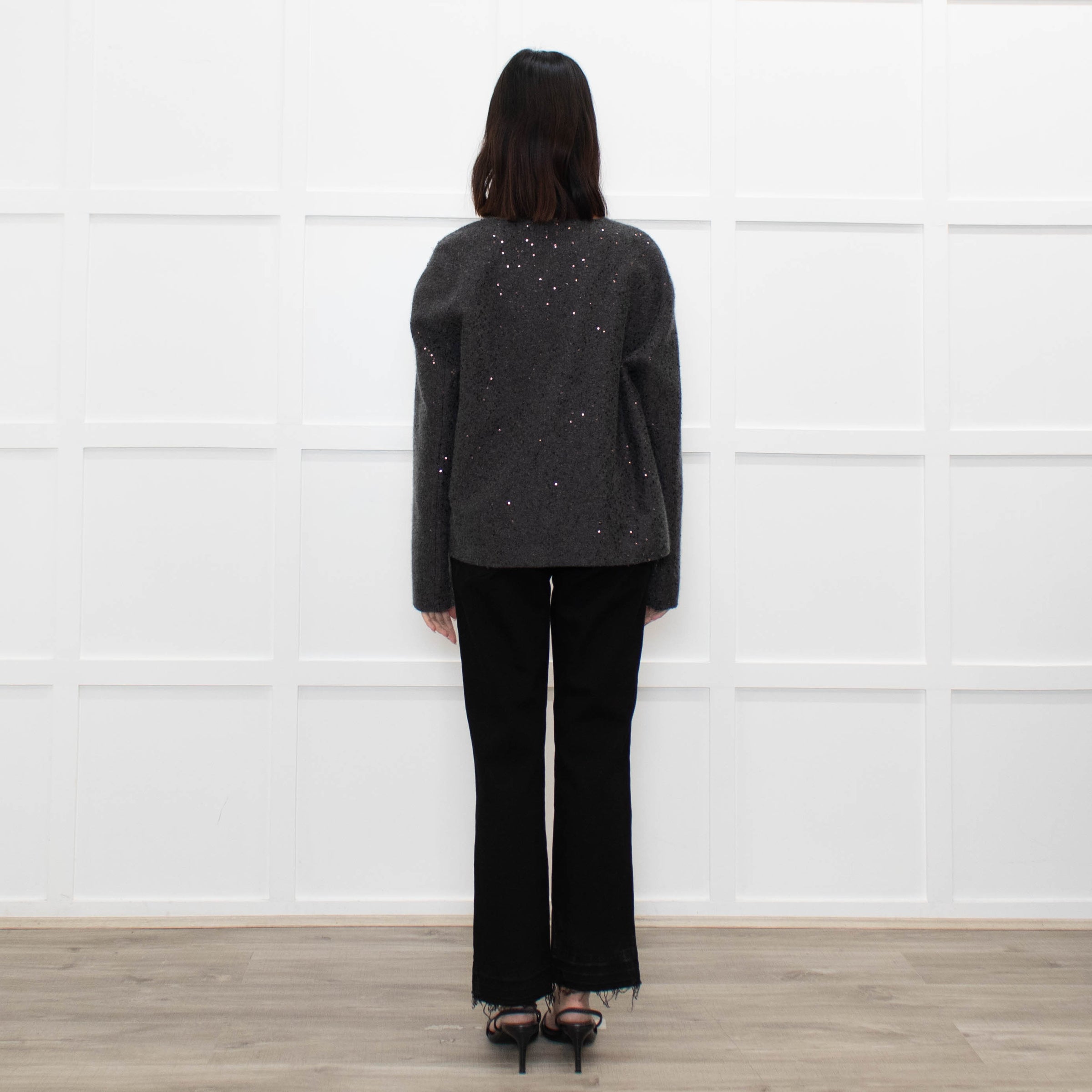 Brunello Cucinelli grey knitted open front cardigan with sequin embellishments, a silk crepe lining, and popper fasteners at the neck.