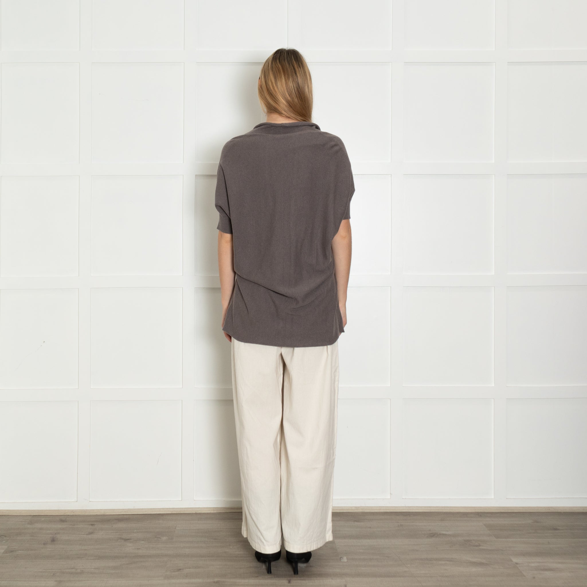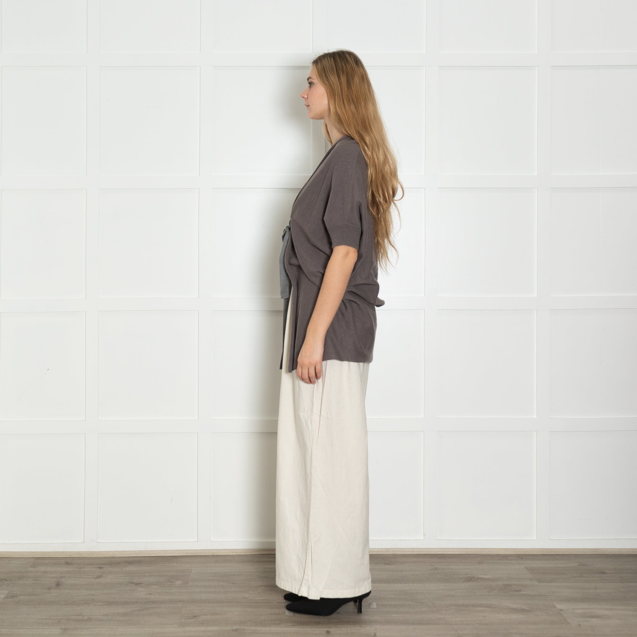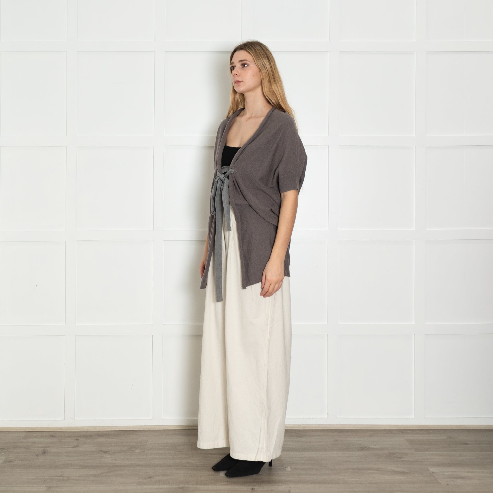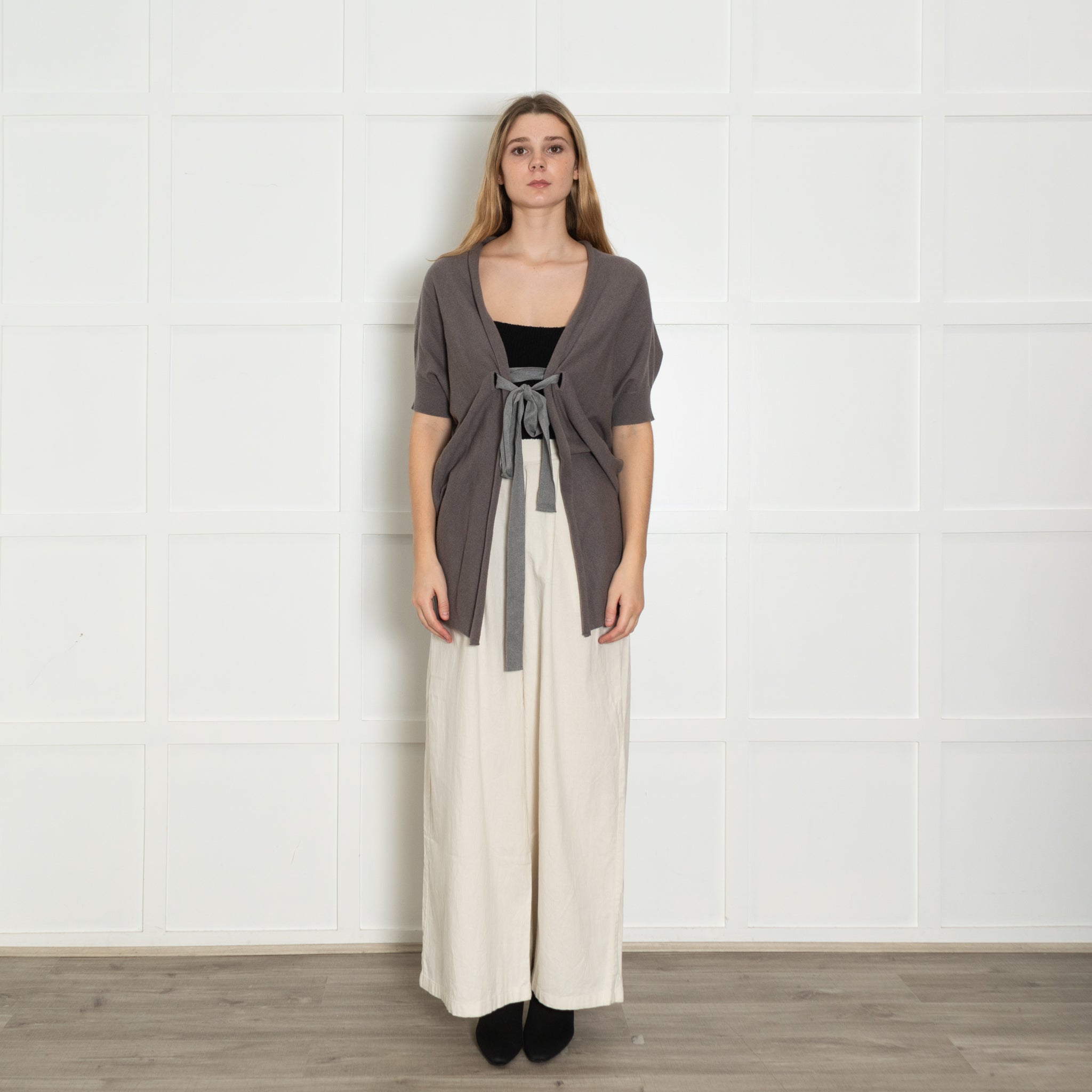 Brunello Cucinelli taupe cashmere gilet with short sleeves and a tie-fastening at the waist.