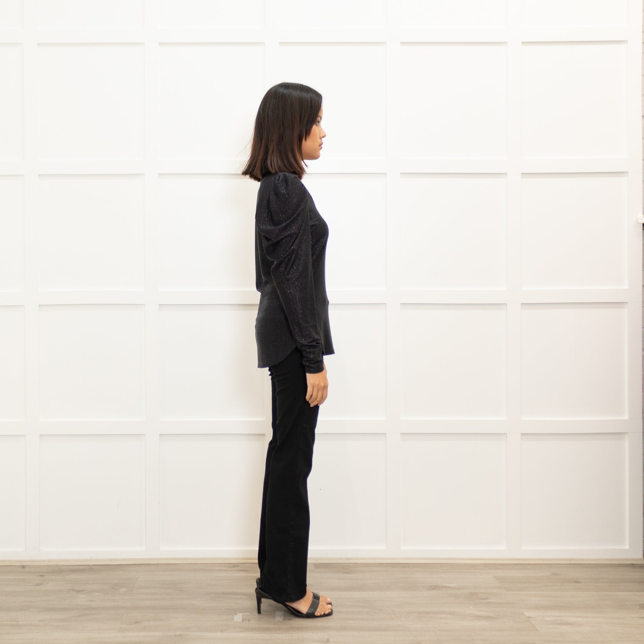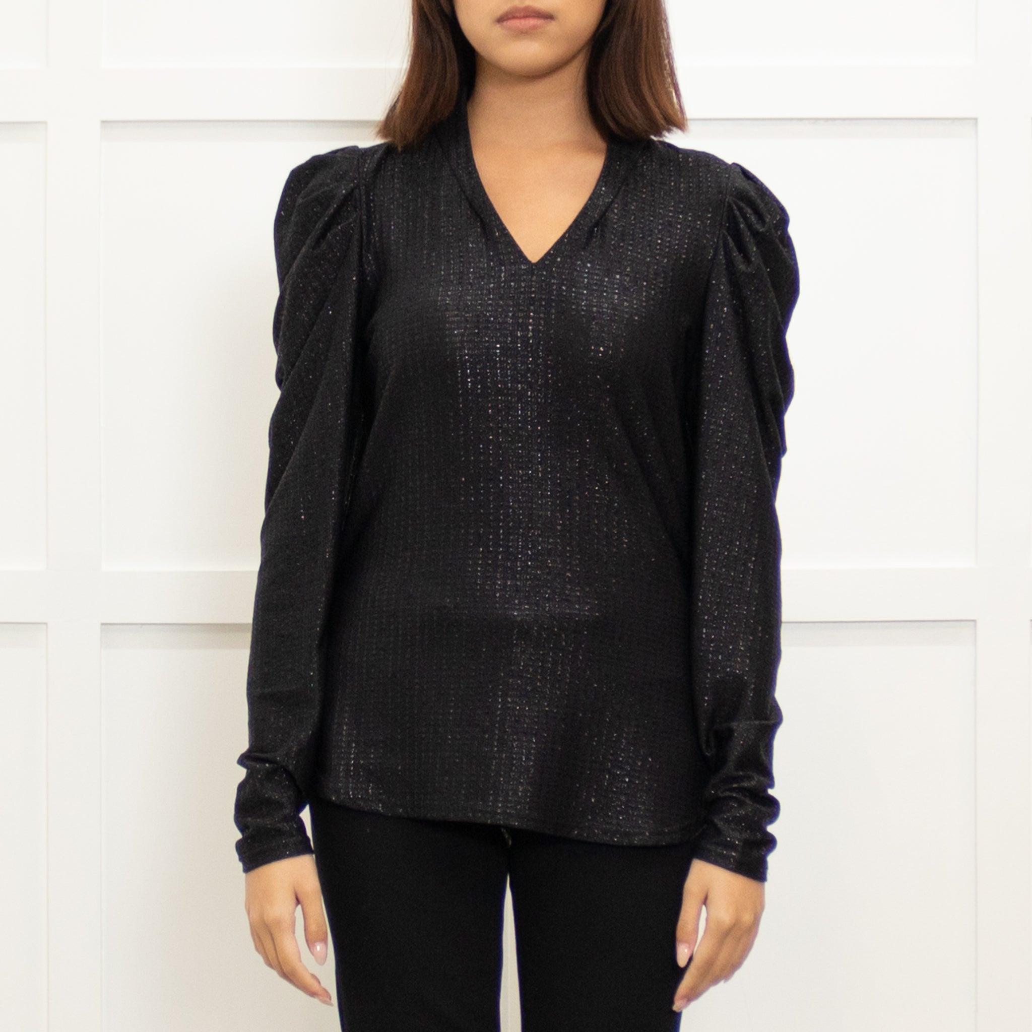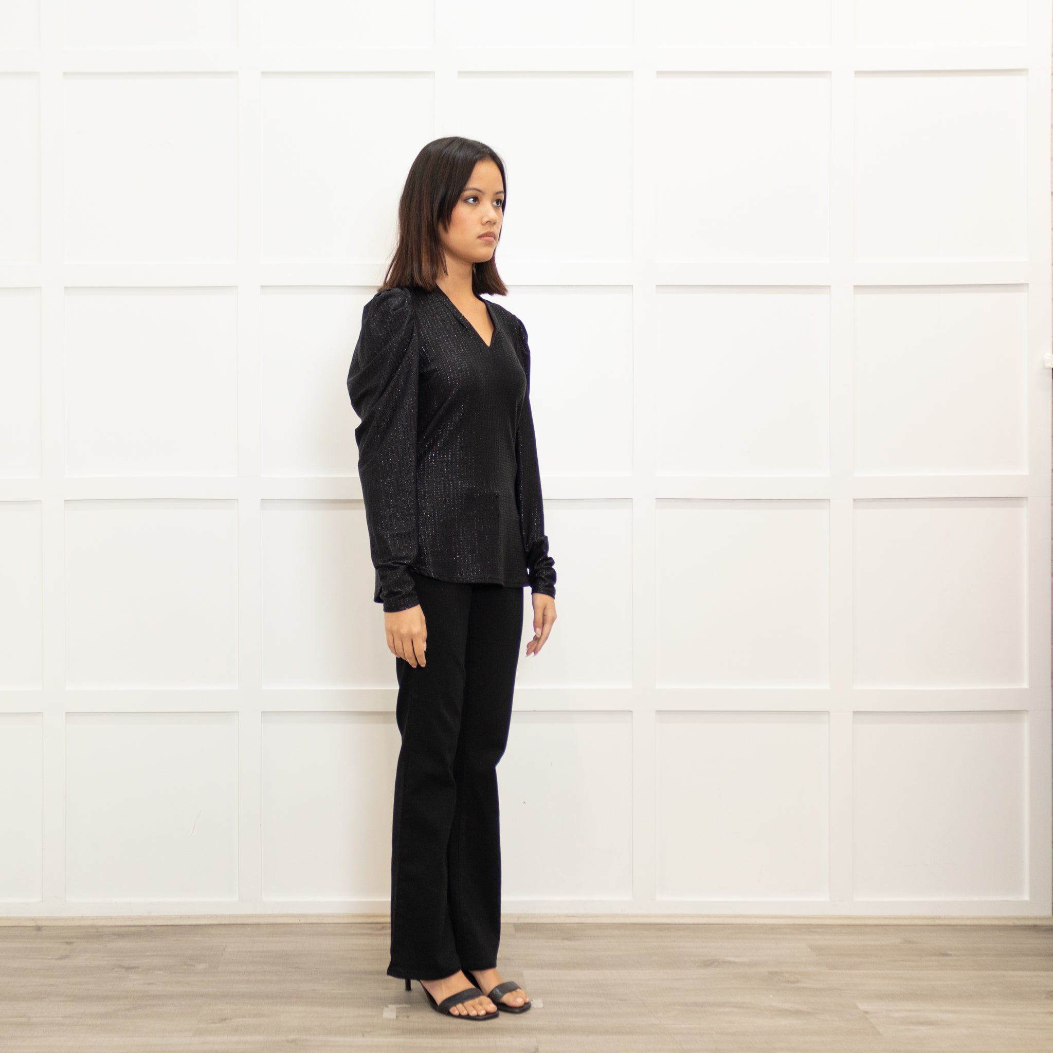 Bruuns Bazaar black and silver top with pleated long sleeves and a V-shaped neckline.