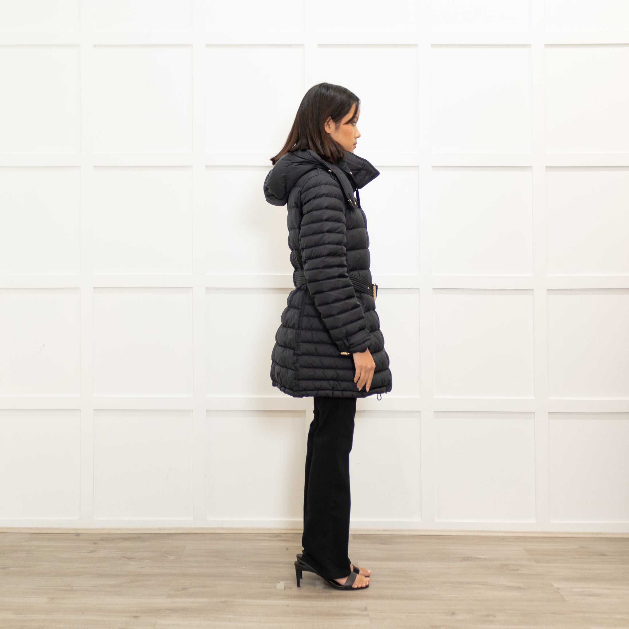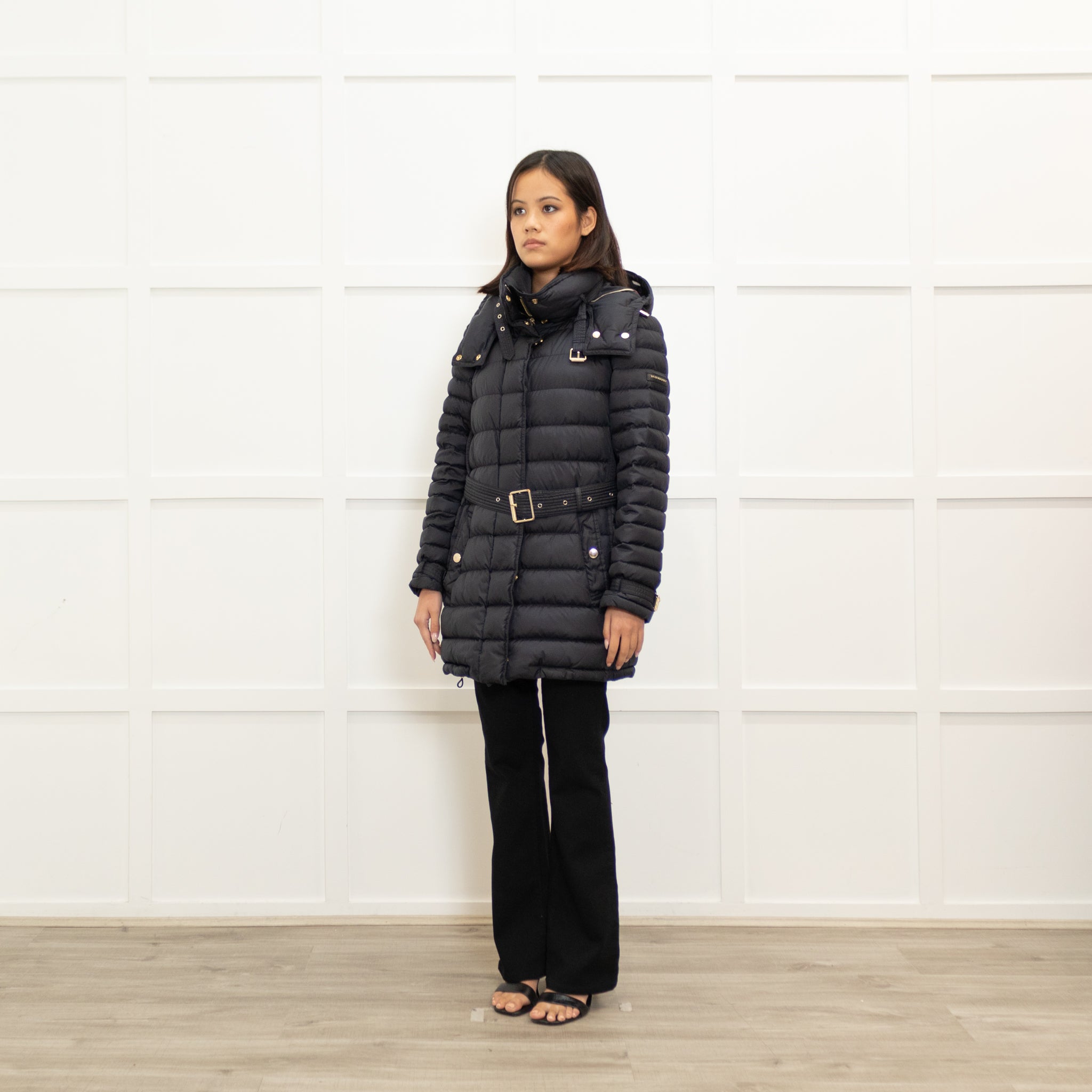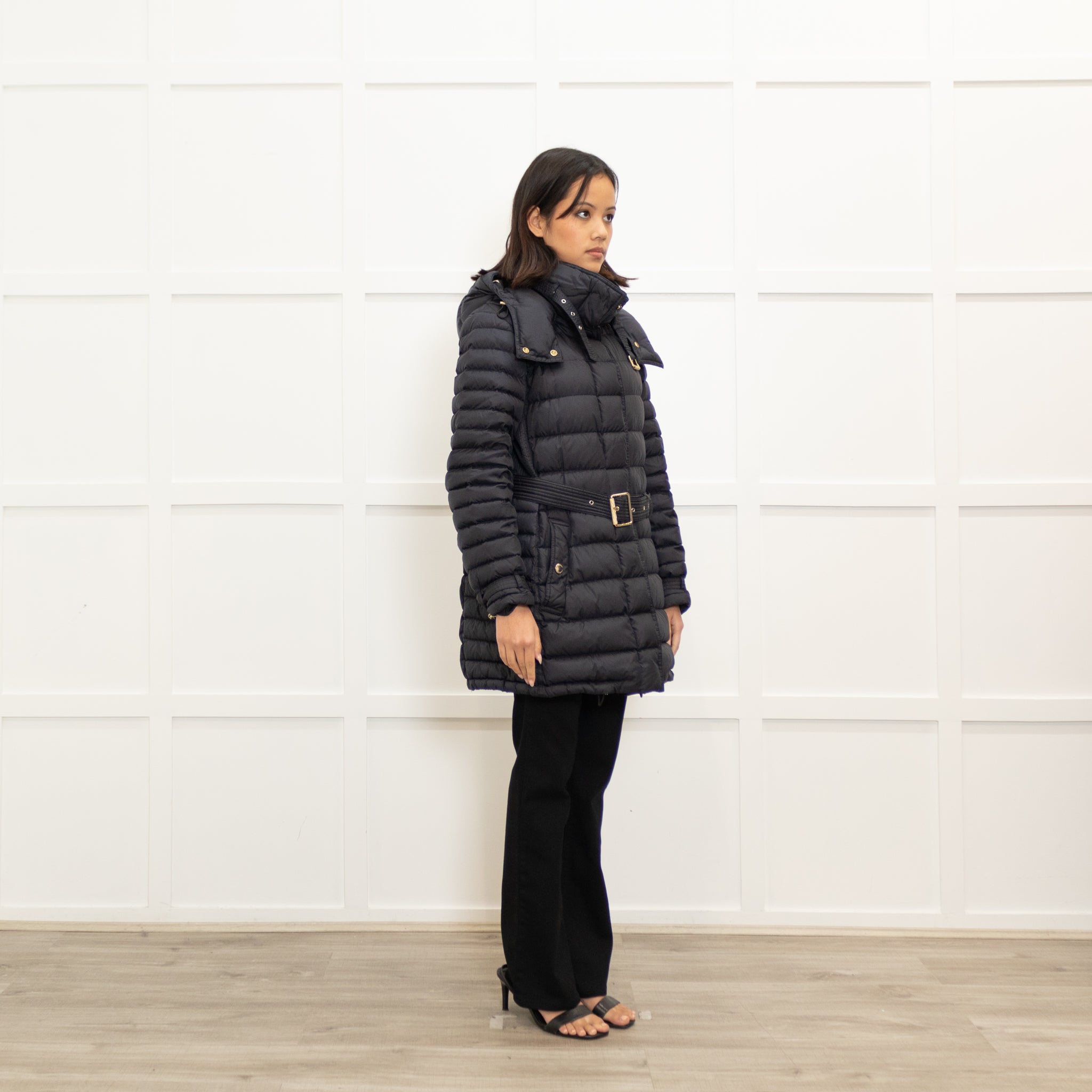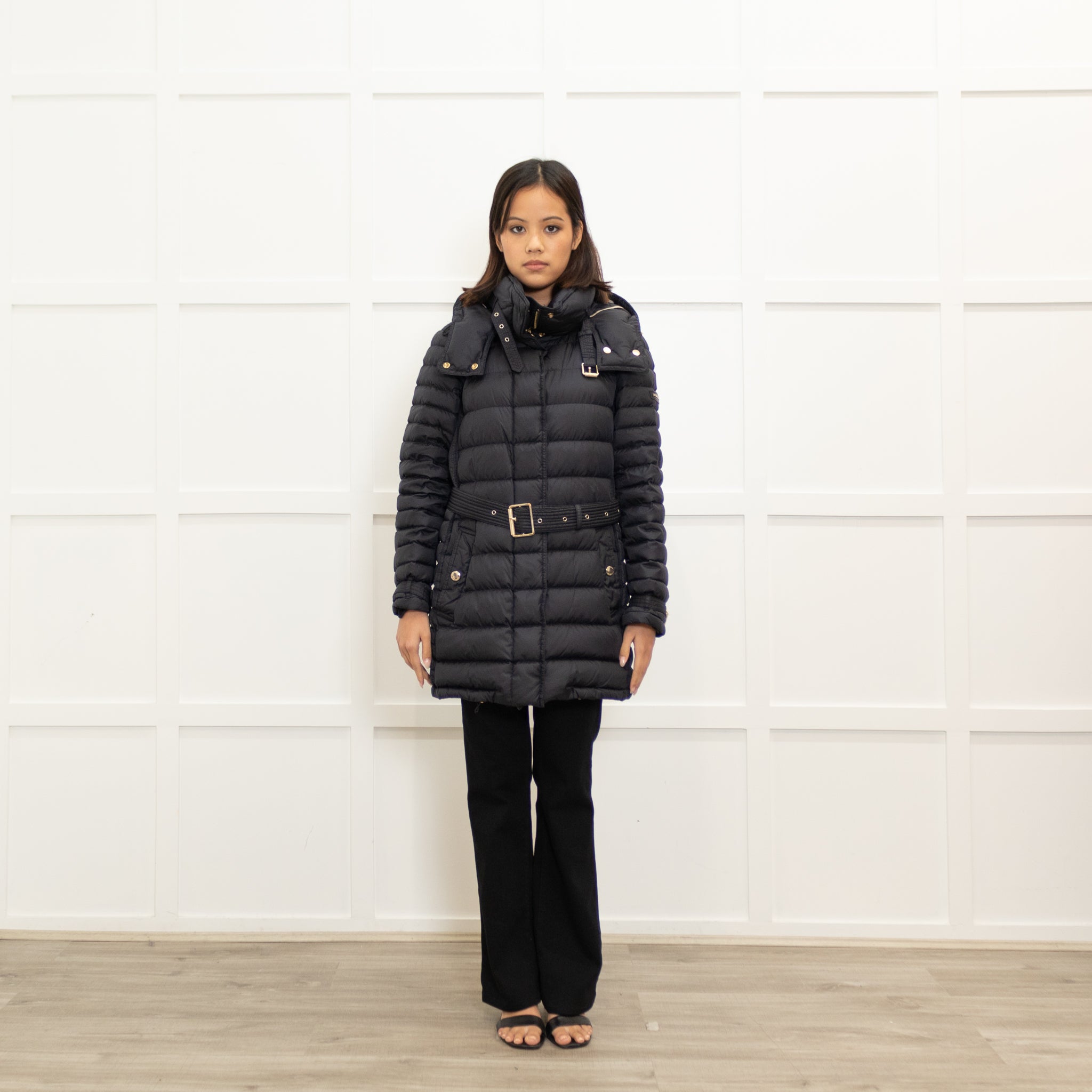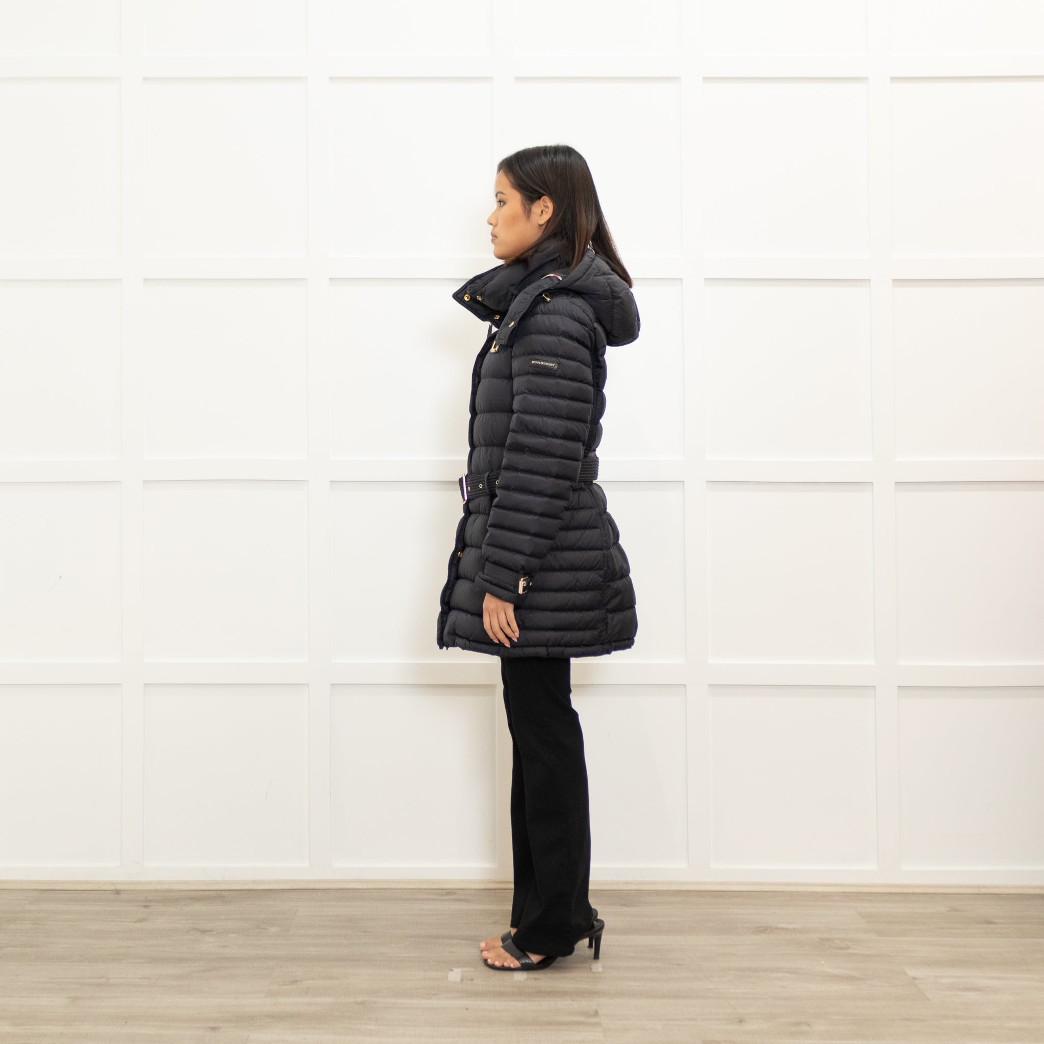 Burberry long-sleeve, long black coat, with a stunning padded design, featuring a belt and hood, with gold accent pieces, gold button-up front closure, two large spacious front pockets, and a classic Burberry interior lining.