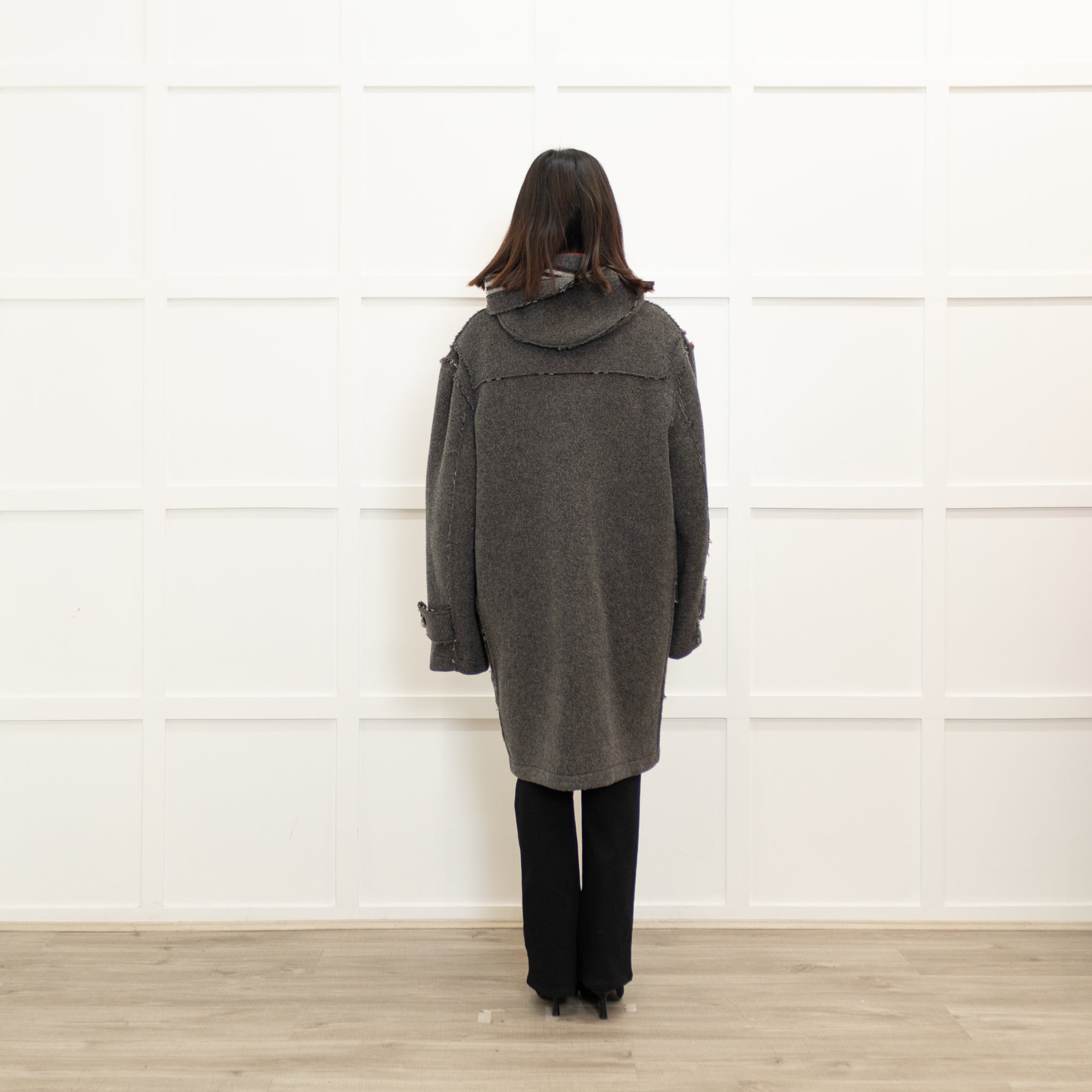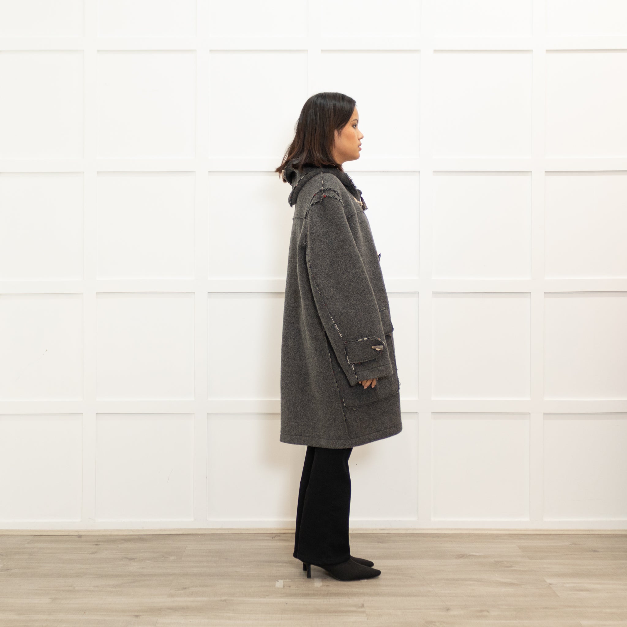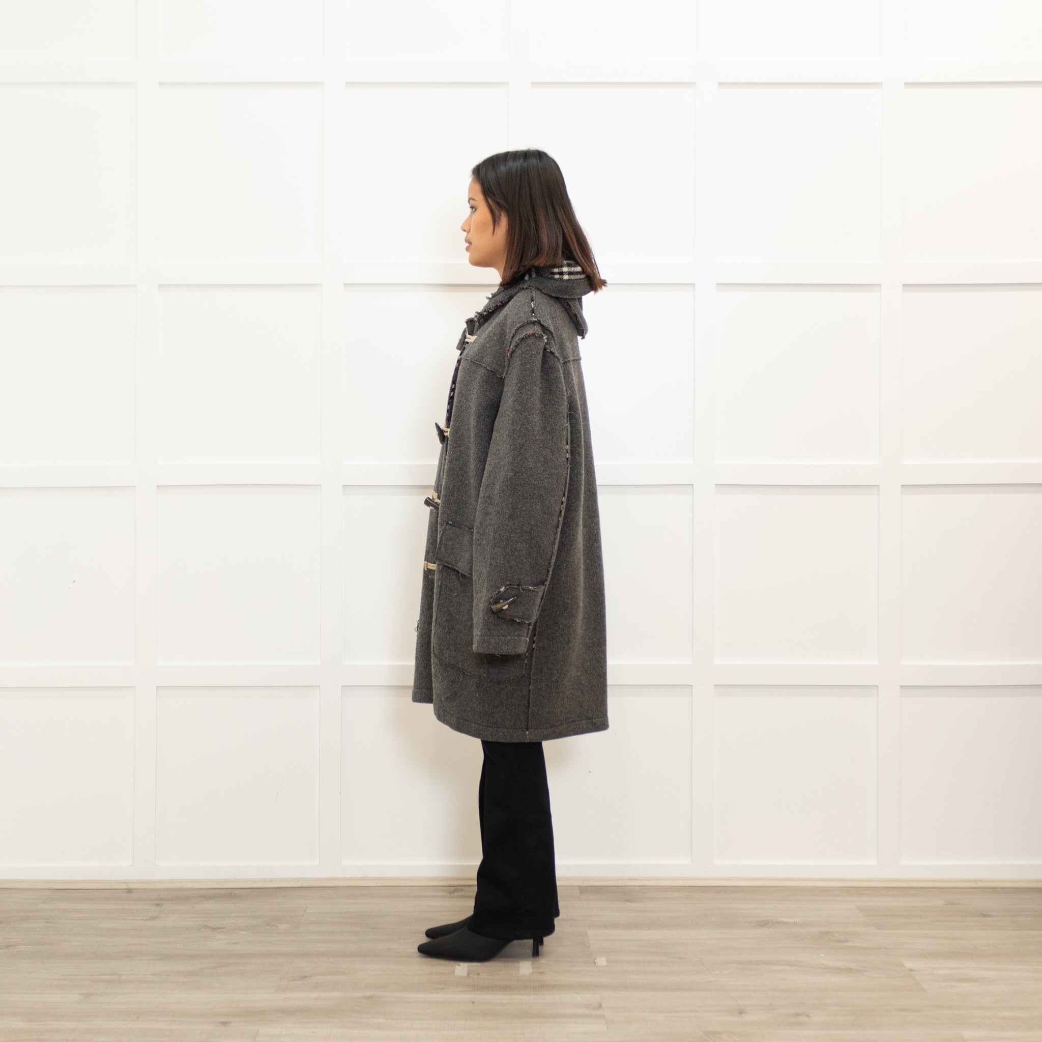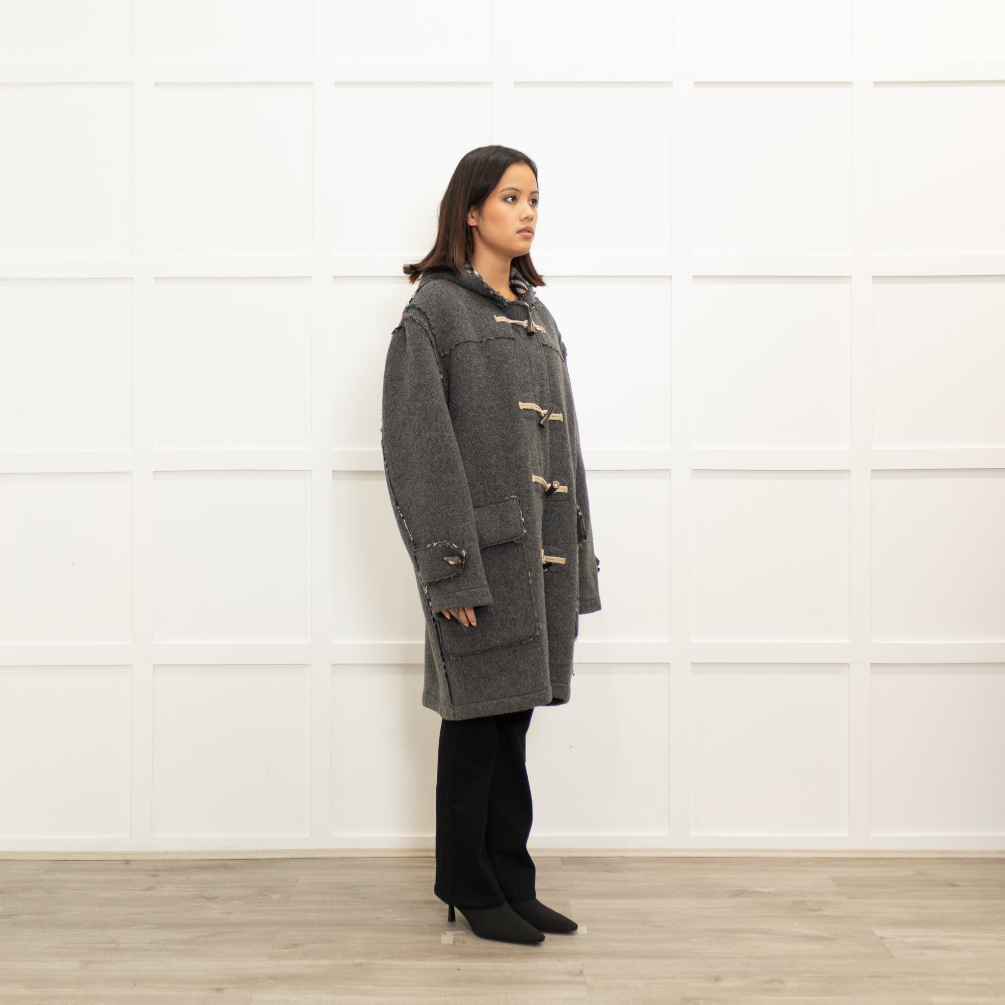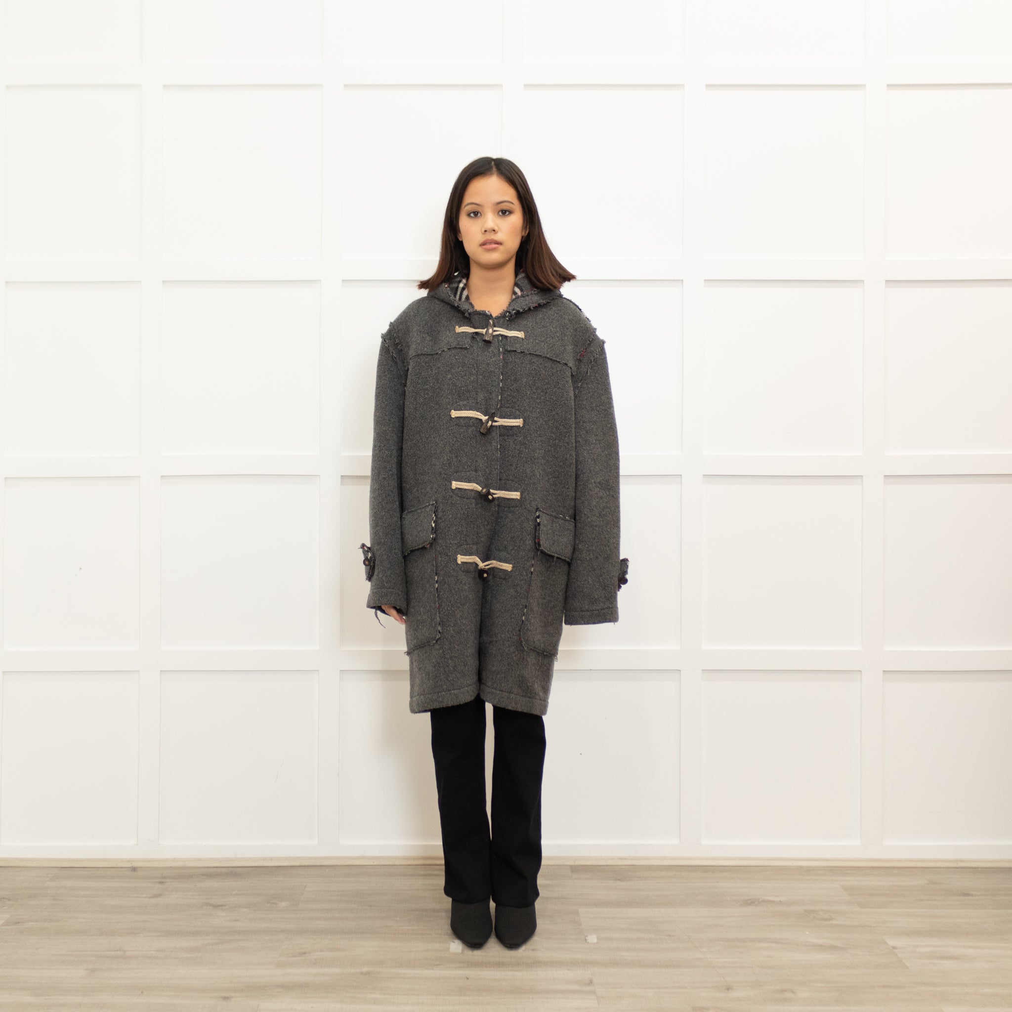 Burberry long-sleeve grey duffle coat featuring a stunning classic Burberry interior lining with two large front flap spacious pockets. Features logo-engraved front toggles in the shape of the B shield.