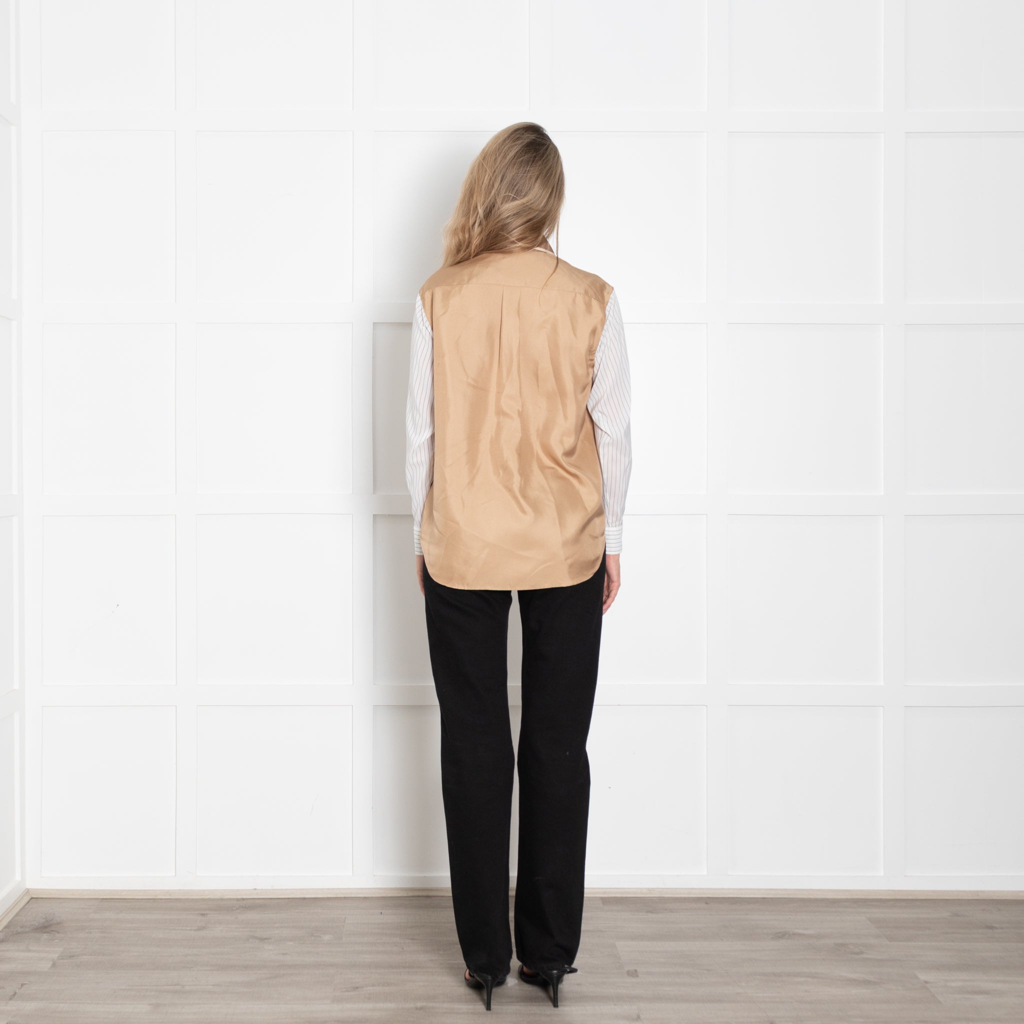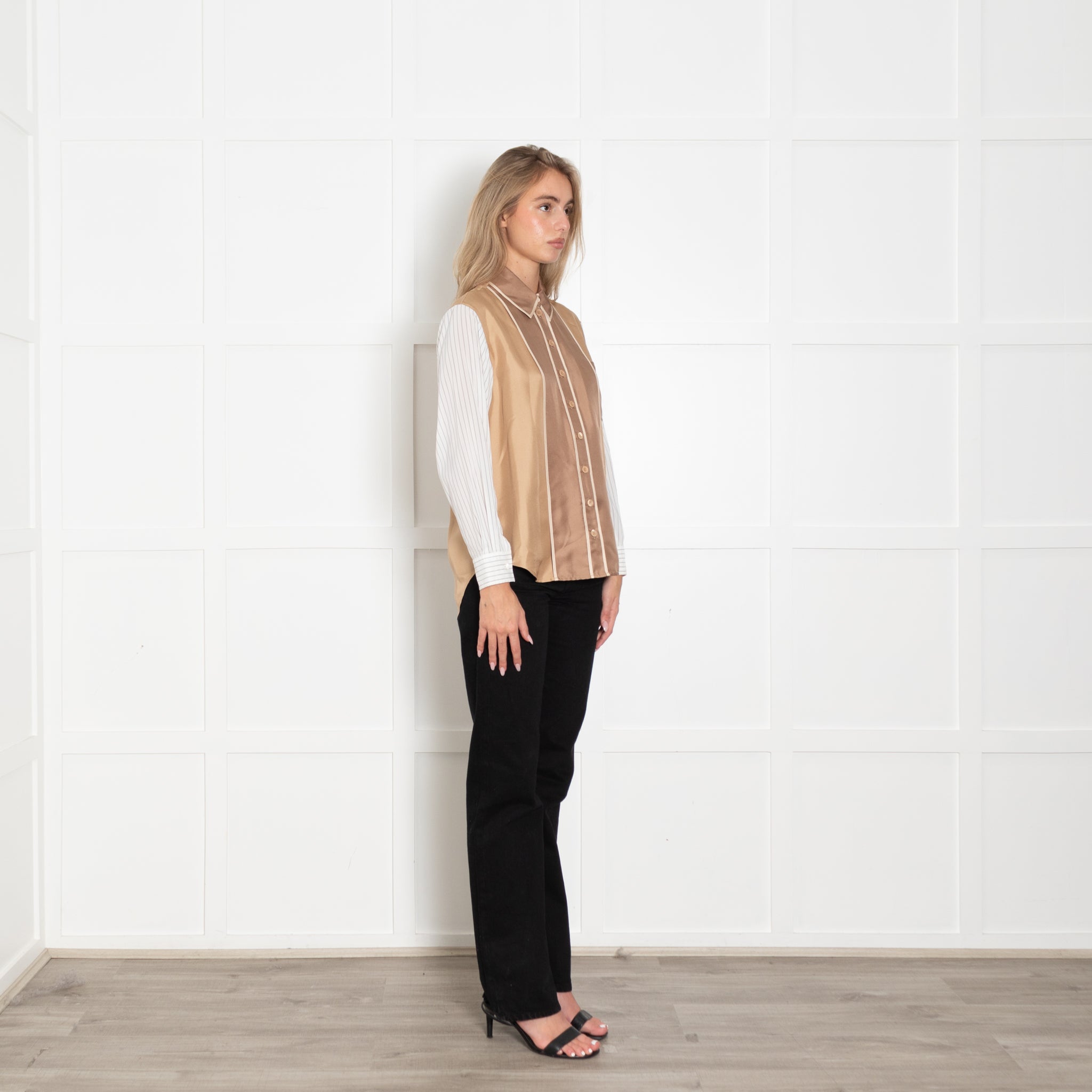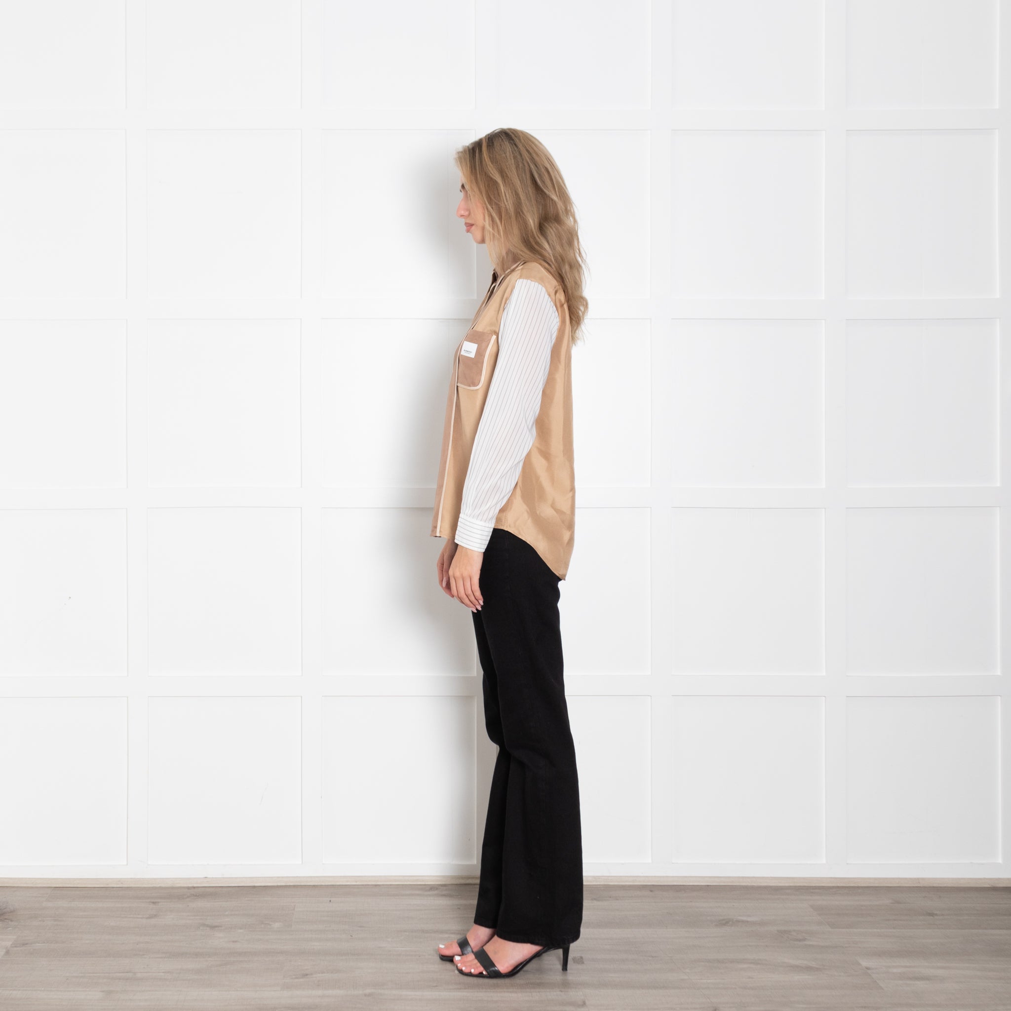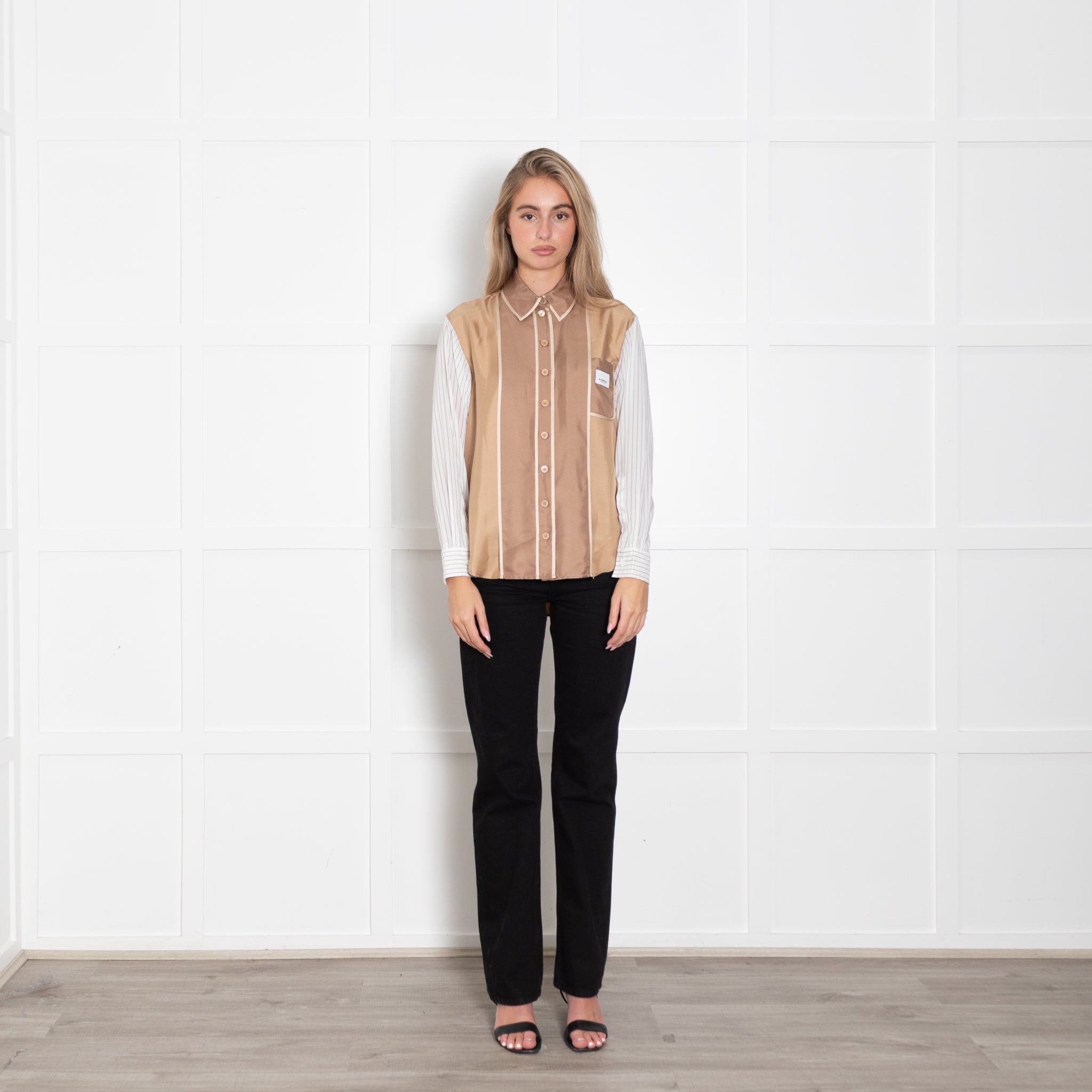 Beautiful beige and white shirt from Burberry. Crafted from silk, this garment fastens with buttons and features a chest pocket, logo patch and long pinstriped sleeves with button cuffs.