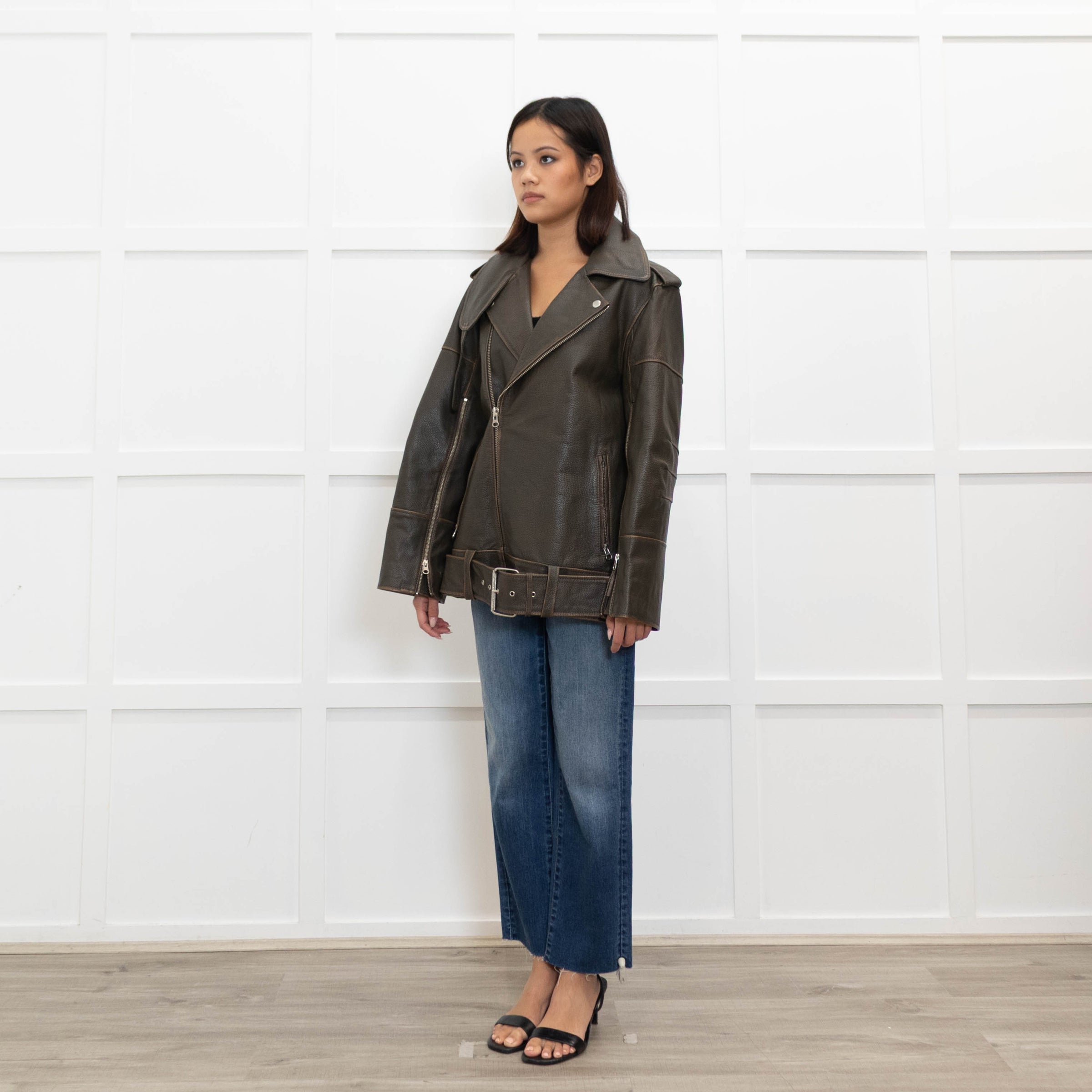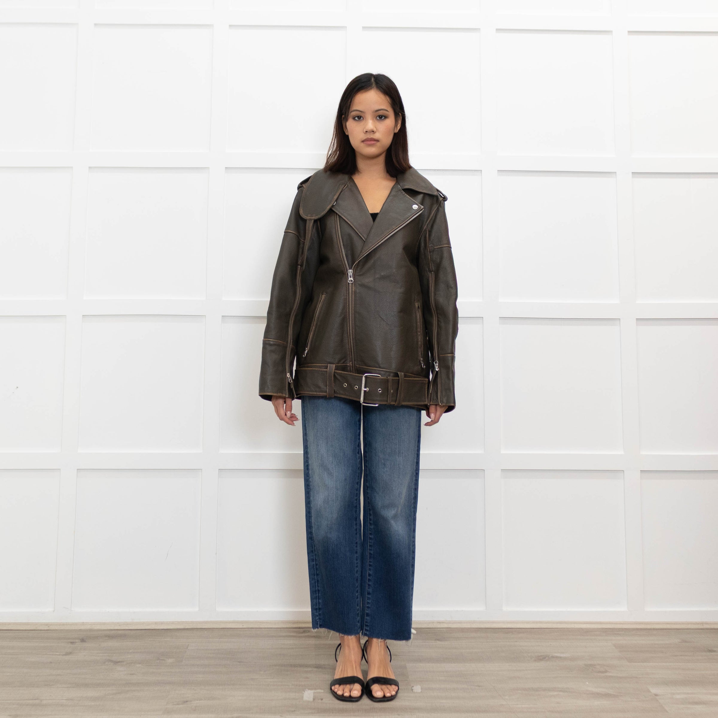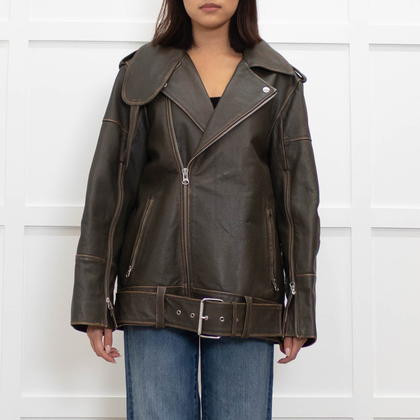 By Malene Birger, brown cow leather aviator jacket, featuring a gorgeous oversized design with two front zipped pockets, a single front zippered closure, and a large collar, with an adjustable waist belt.