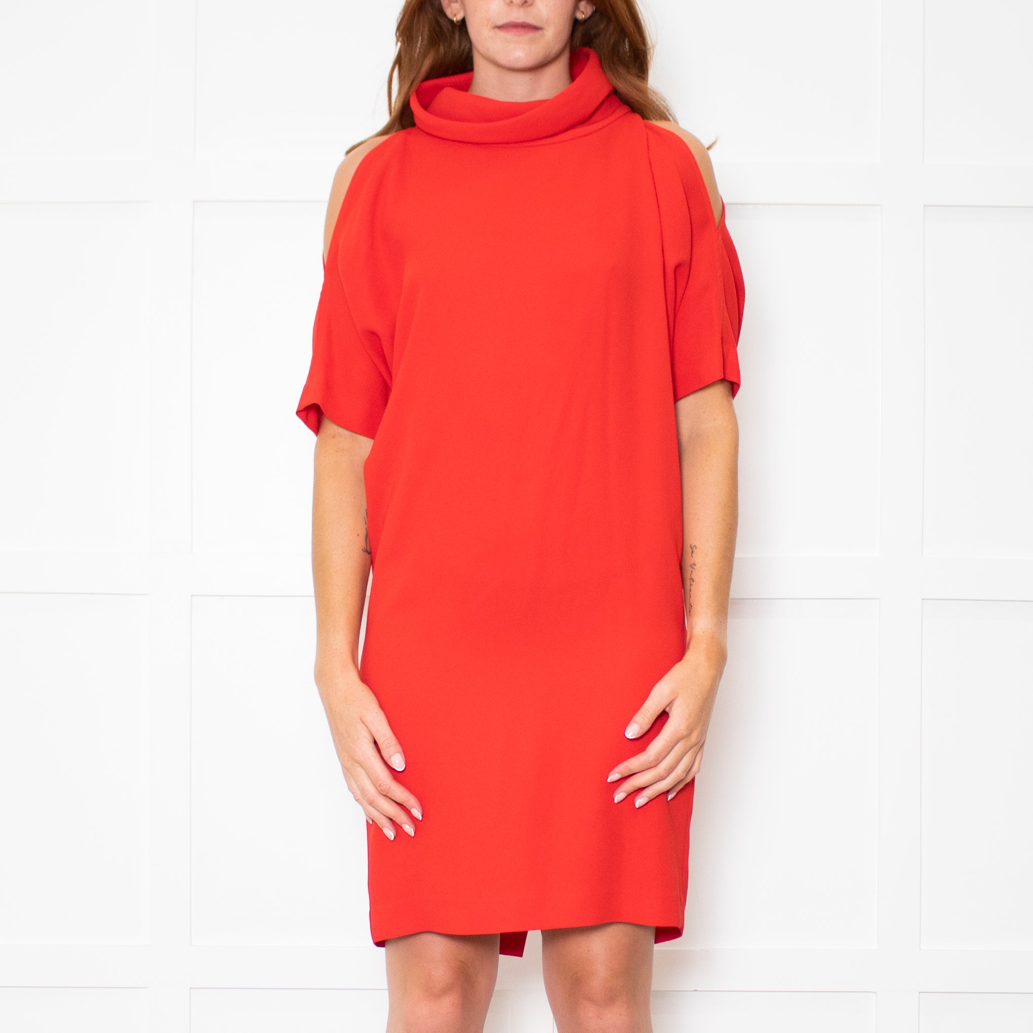 Carla Zampatti red short-sleeve shift dress crafted in a crepe fabric with shoulder cut-out detailing, a high cowl neck, and a small rear hem split.