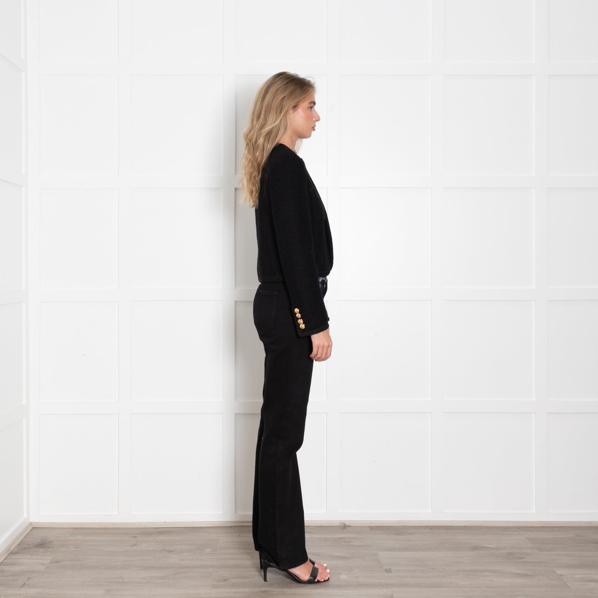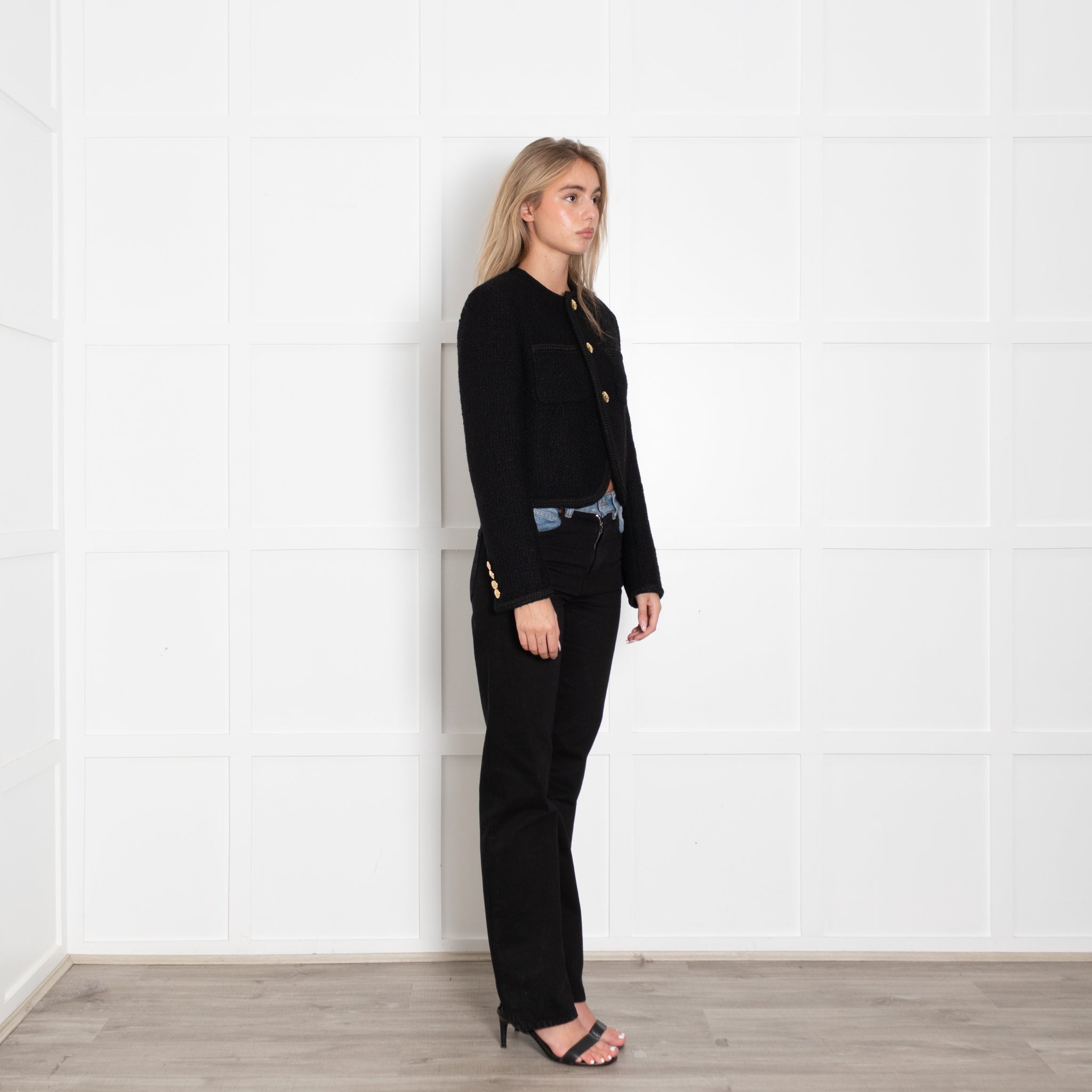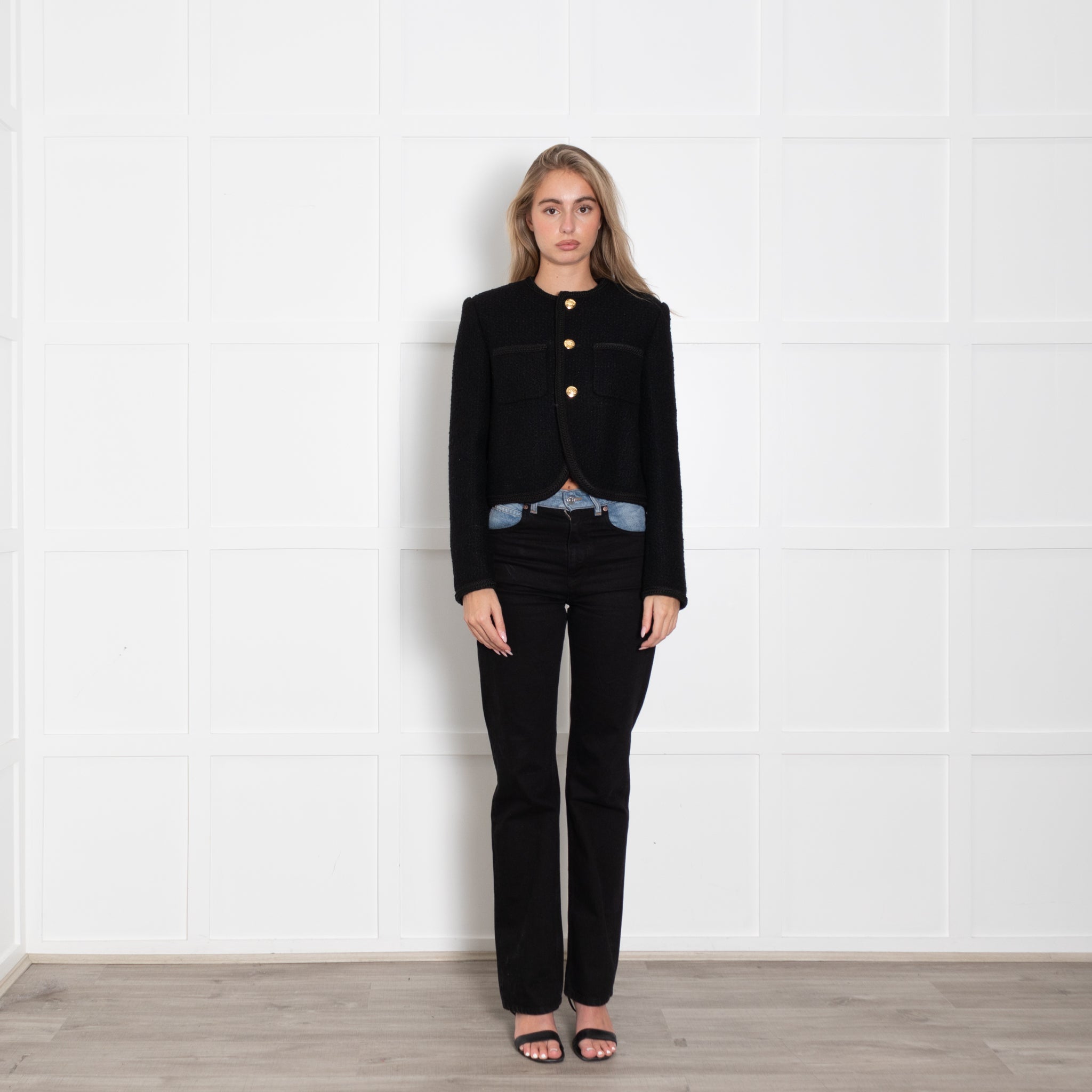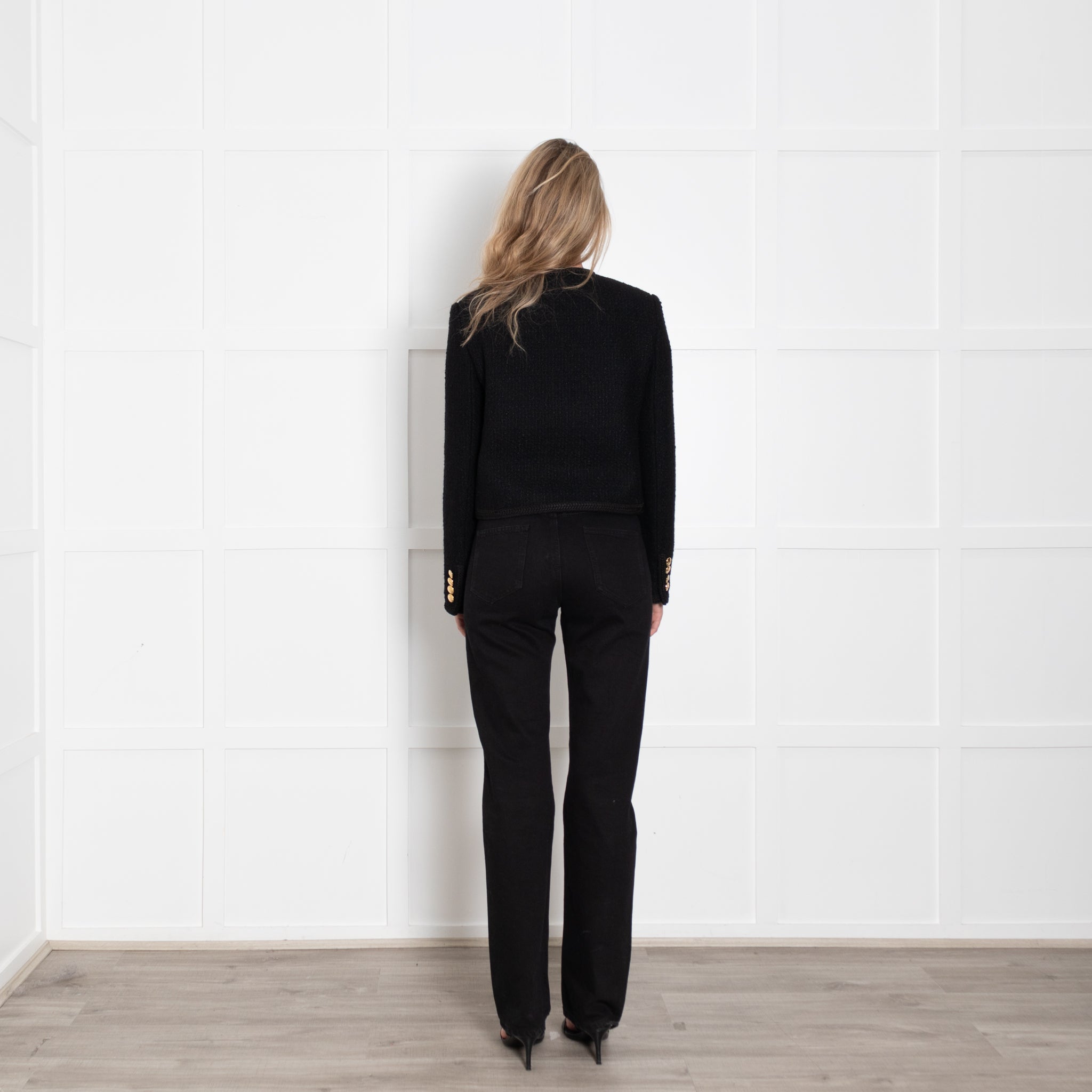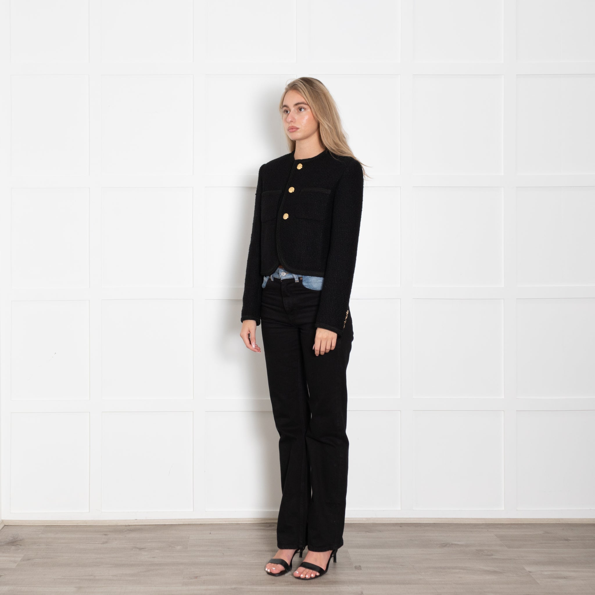 Celine cropped black chasseur jacket. Features 3 gold buttons to the front engraved with the Celine logo. Braided piping in bouclé tweed and 2 faux symmetrical pockets.