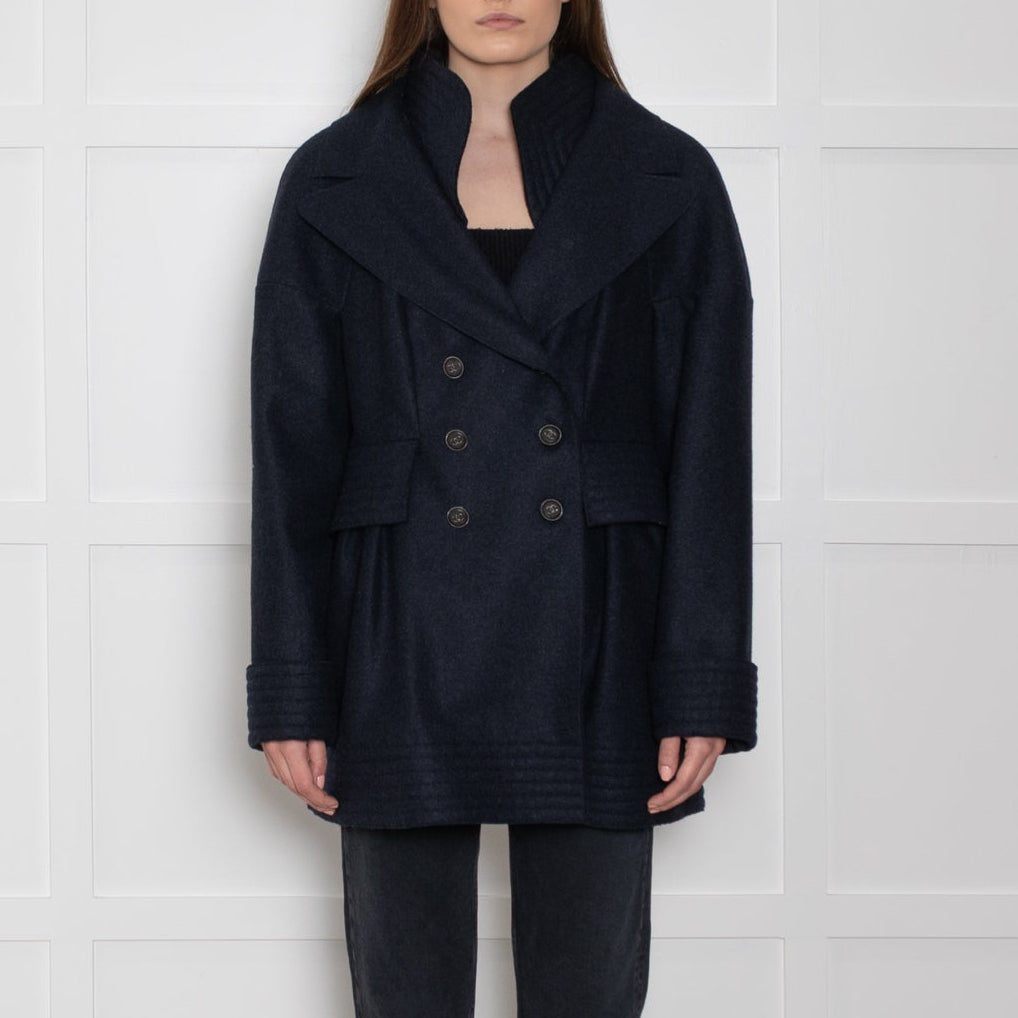 Chanel long-sleeve stunning navy blue short coat, featuring a waist-length design, with a wool mix fabric, two pleated front flaps, a classic large collar, and three gorgoues Chanel logo buttons.