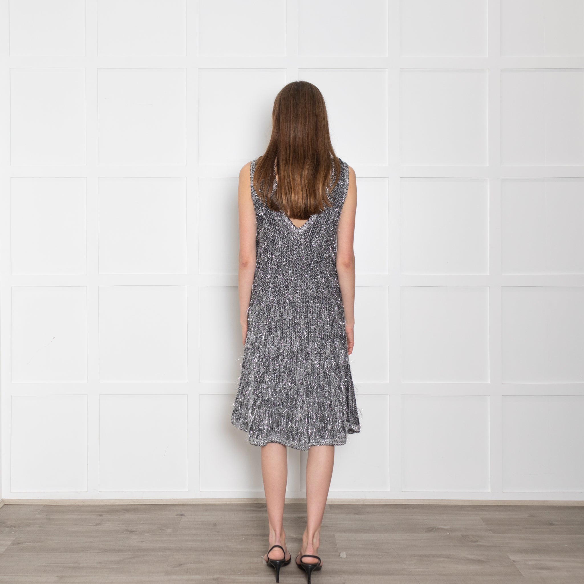 Chanel silver sleeveless shift dress, featuring a stunning thread, silk, and cotton knit design, with a rounded neckline, and cotton lining.
