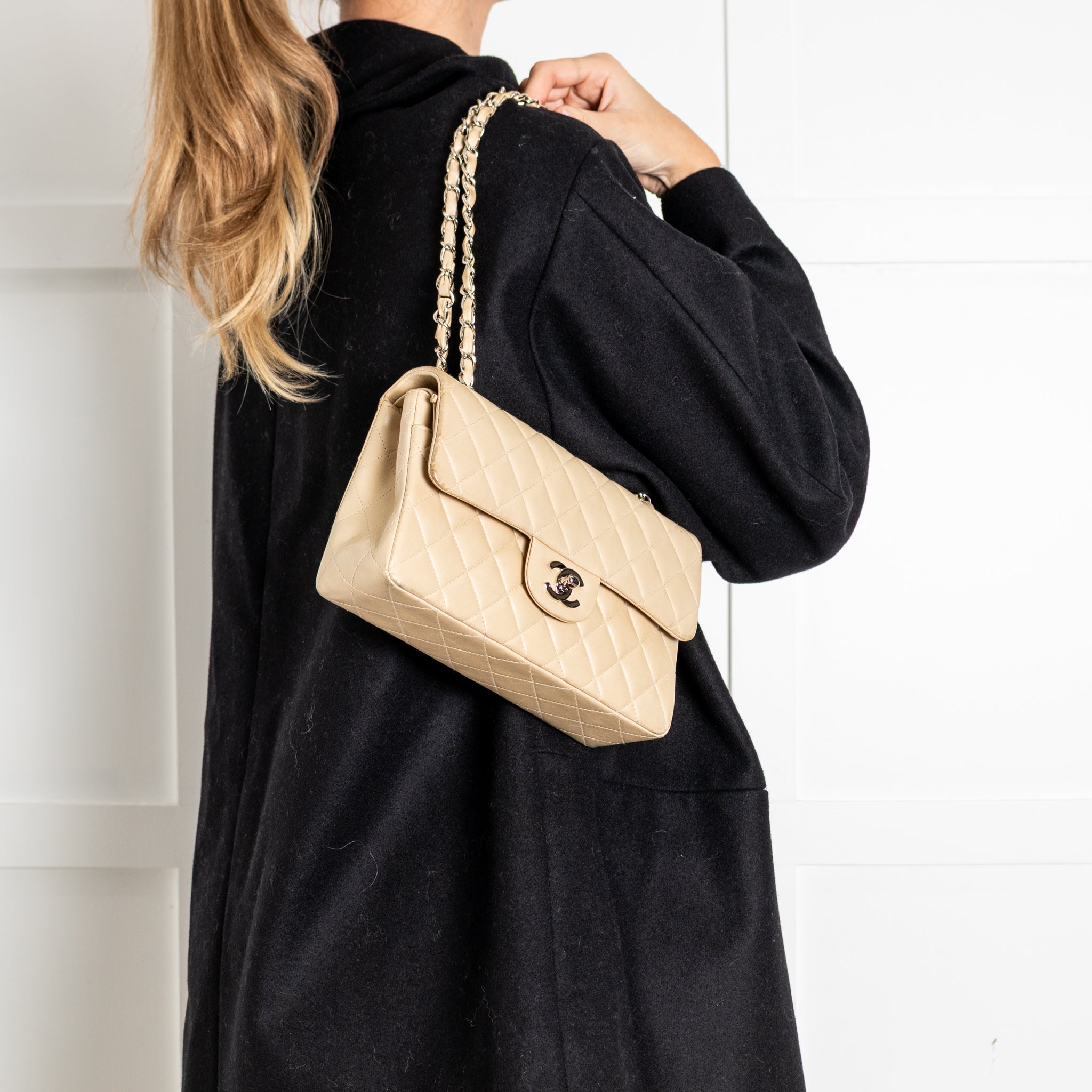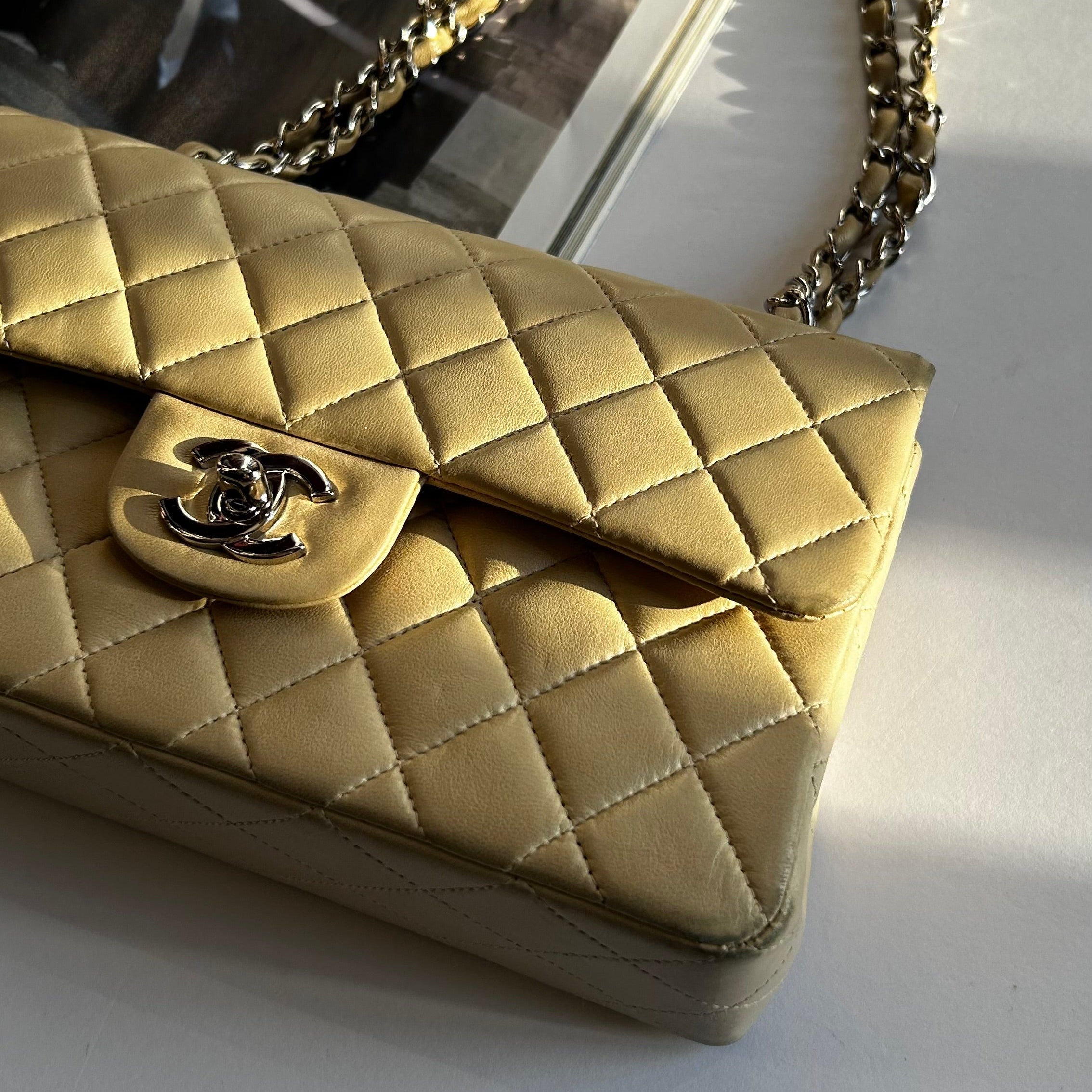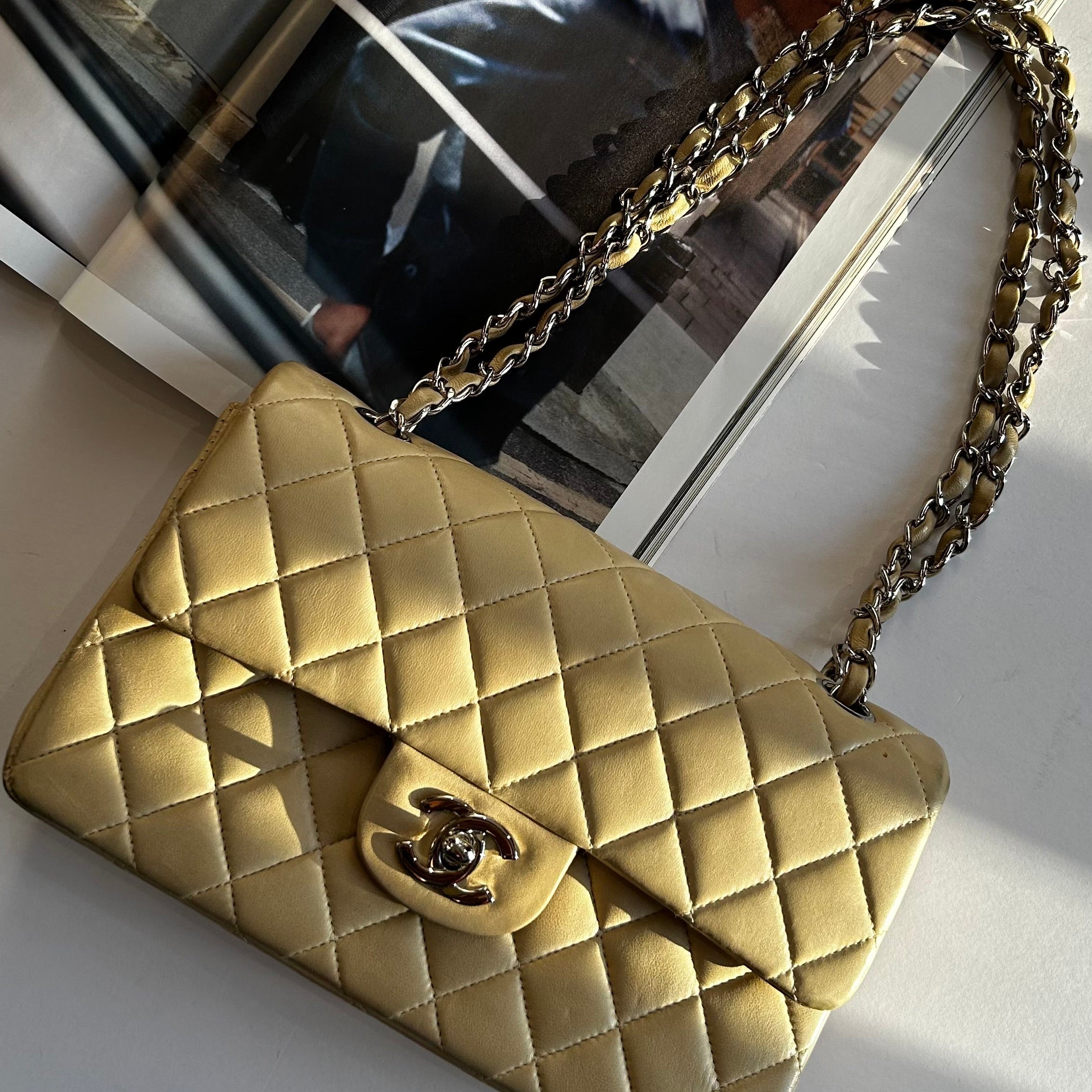 Chanel (1997-1999) vintage small classic double-flap bag in beige quilted lambskin leather with silver-tone hardware. This bag features an exterior back slip pocket, woven chain straps, double front flaps, an interlocking CC logo twist lock closure, and interior slip pockets. Original dust bag included.