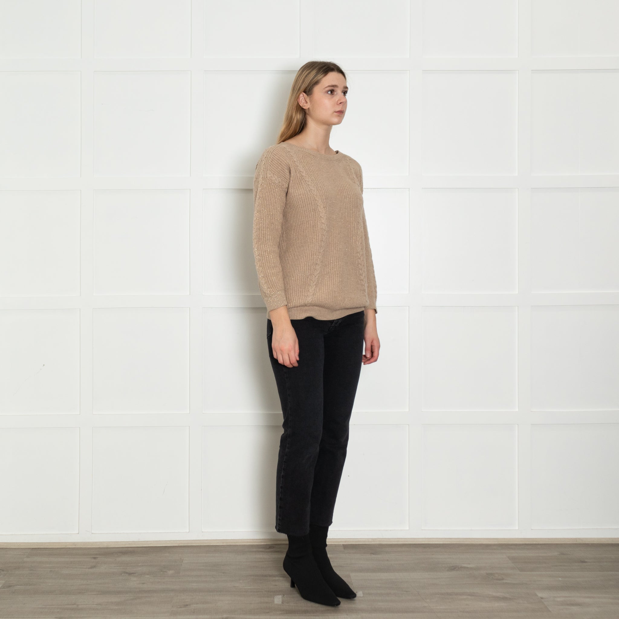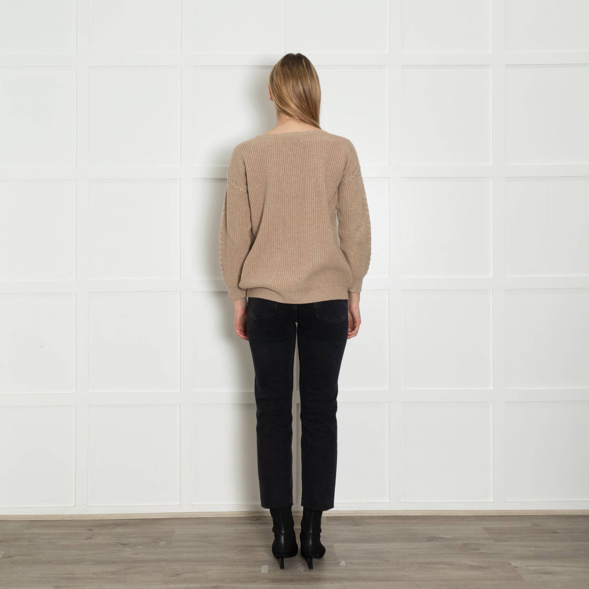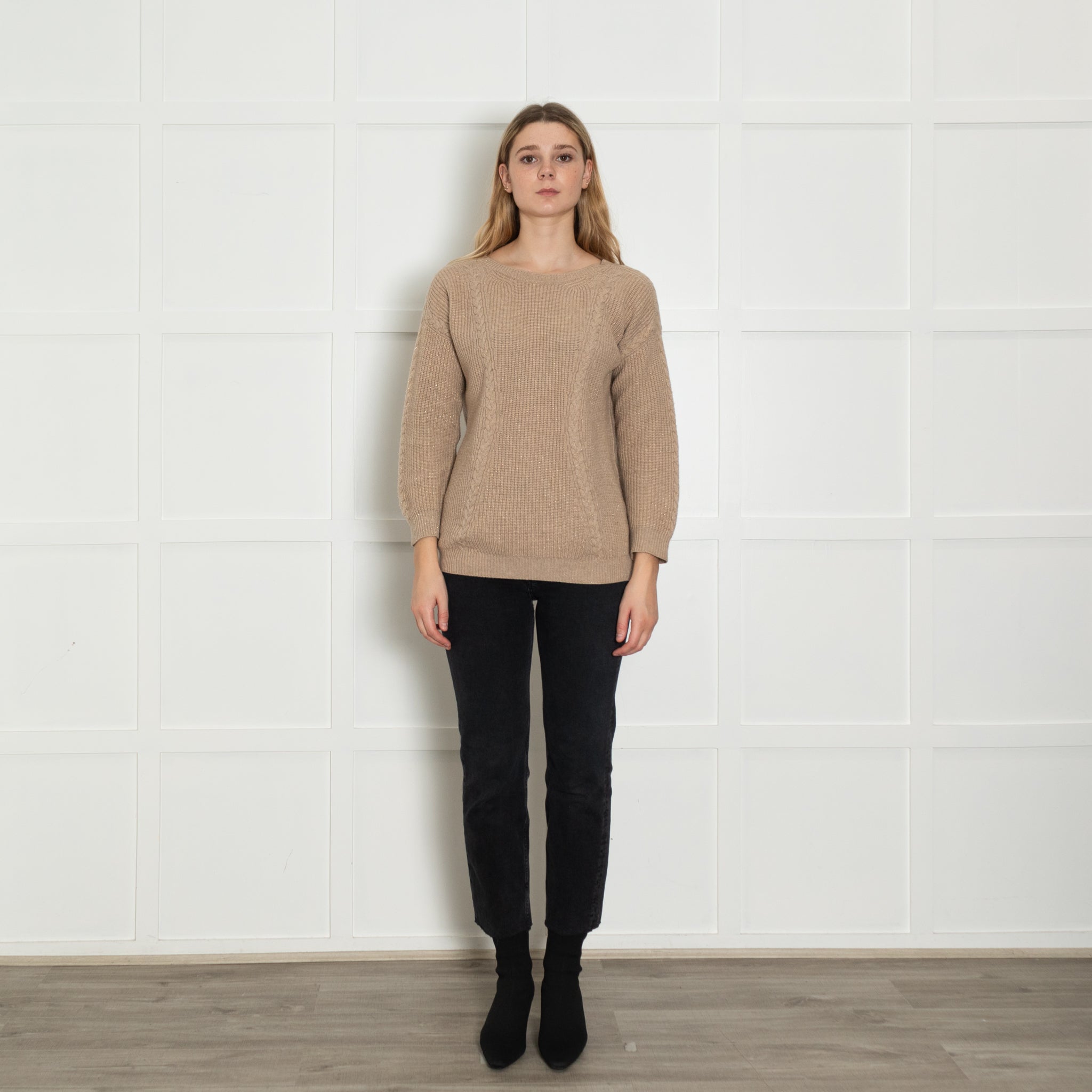 Chinti & Parker long-sleeve beige sweater, crafted with a stunning wool-blend cashmere fabric, a gold ribbed design, and a rounded neckline.