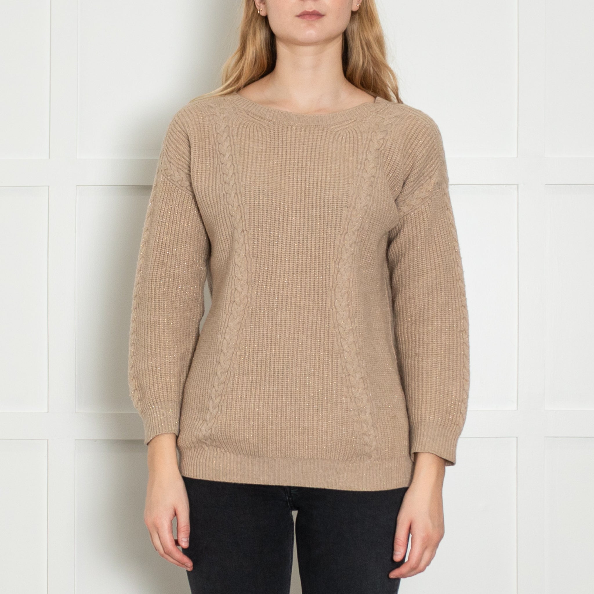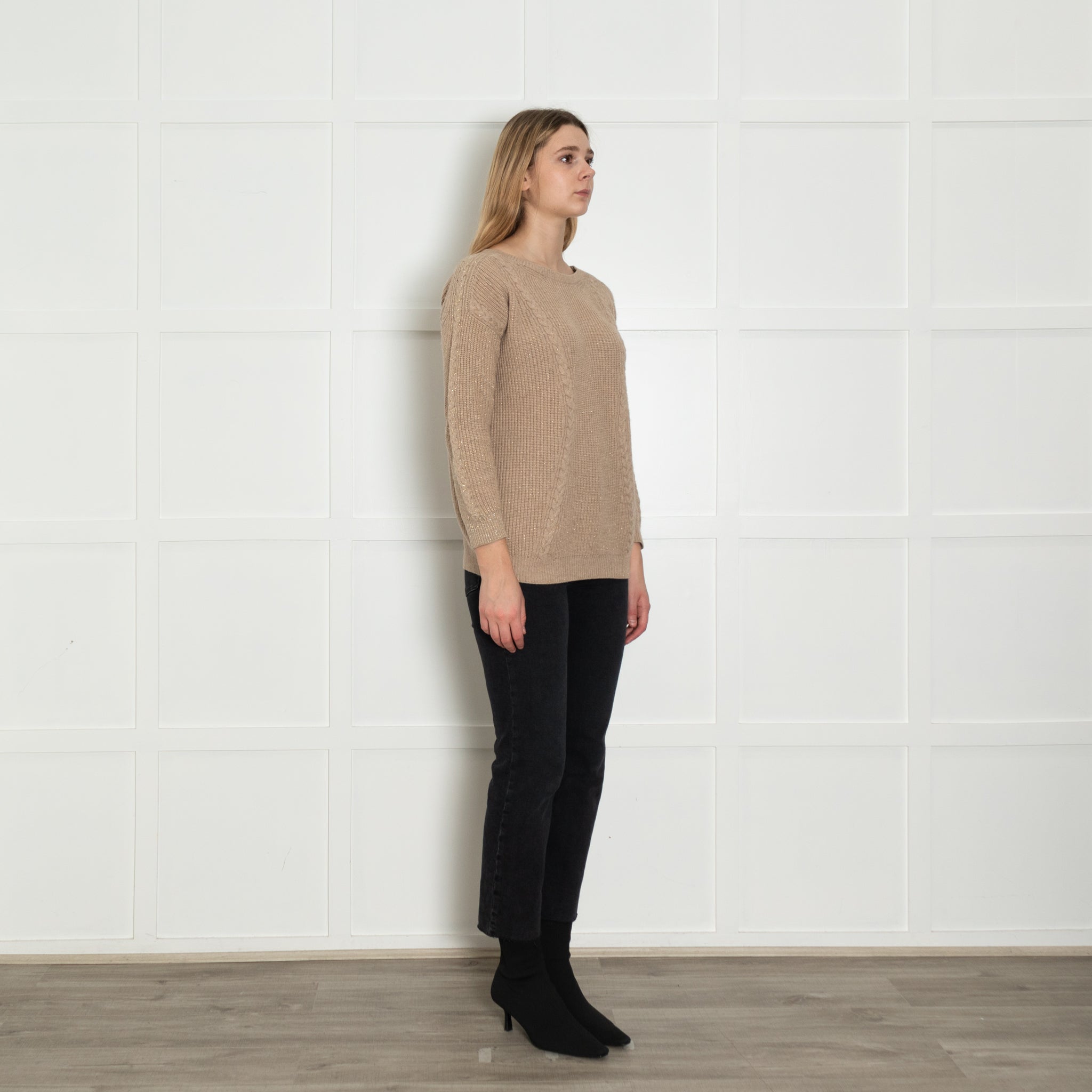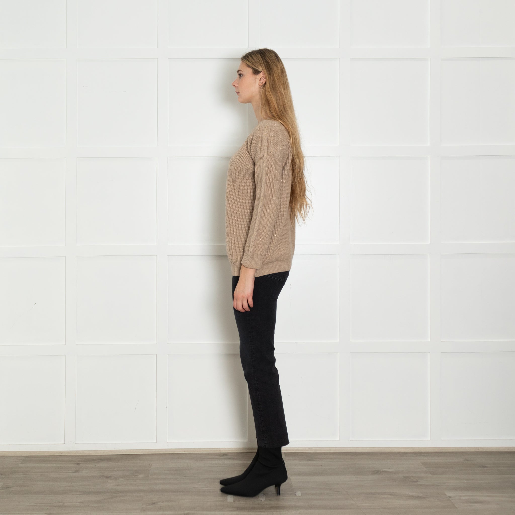 Chinti & Parker long-sleeve beige sweater, crafted with a stunning wool-blend cashmere fabric, a gold ribbed design, and a rounded neckline.