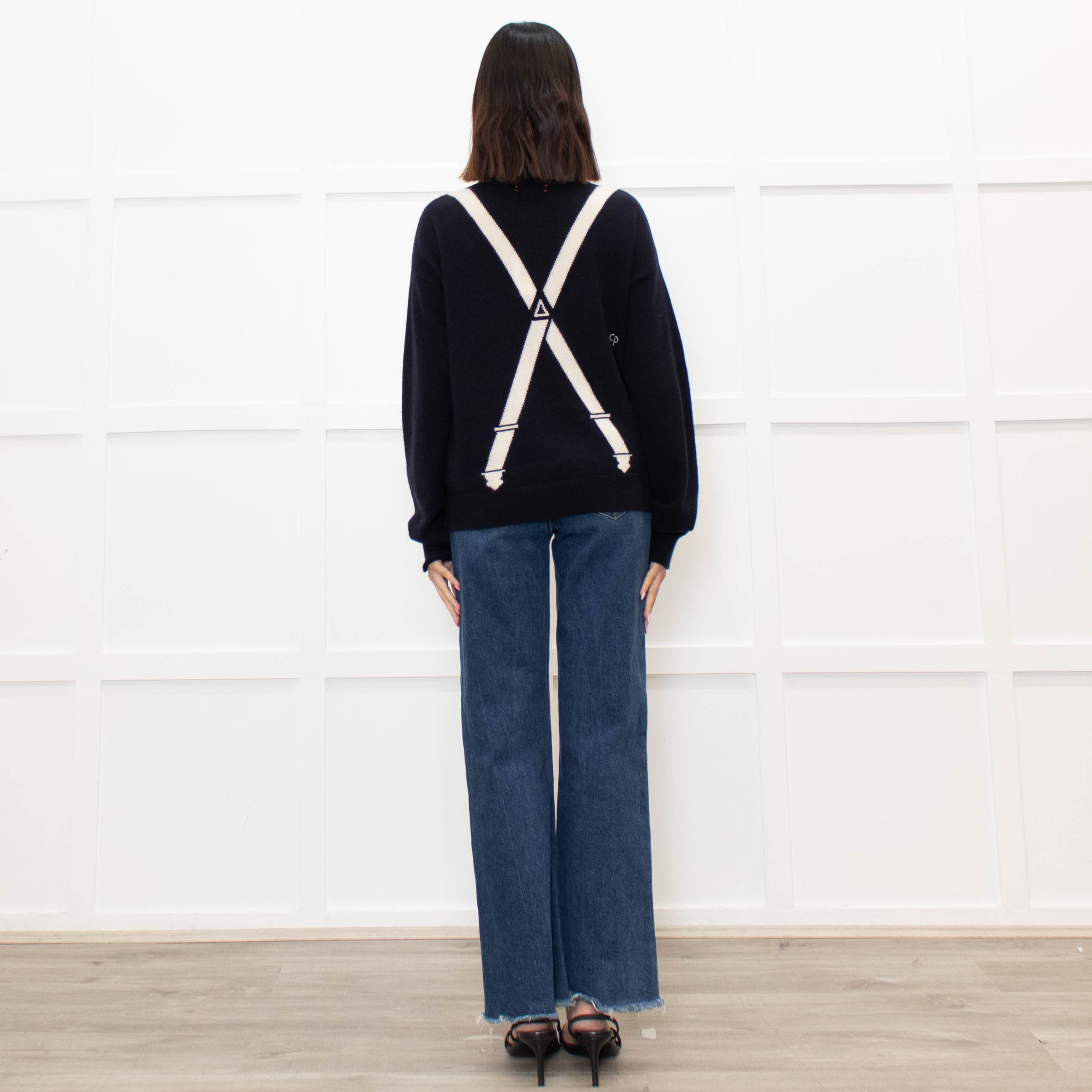 Chinti & Parker navy blue and cream cashmere cardigan with an intarsia knit pattern of braces/ suspenders and a small collar.