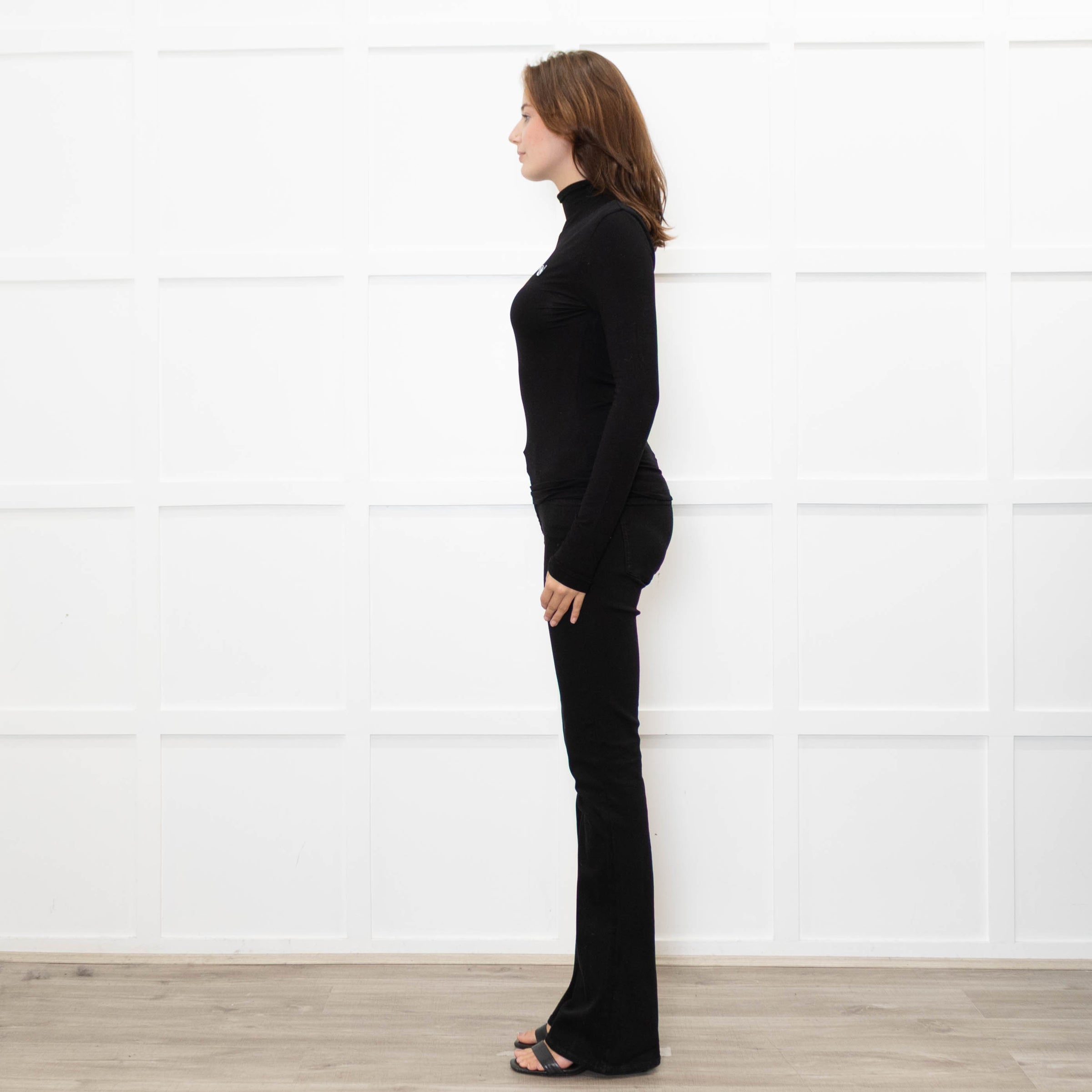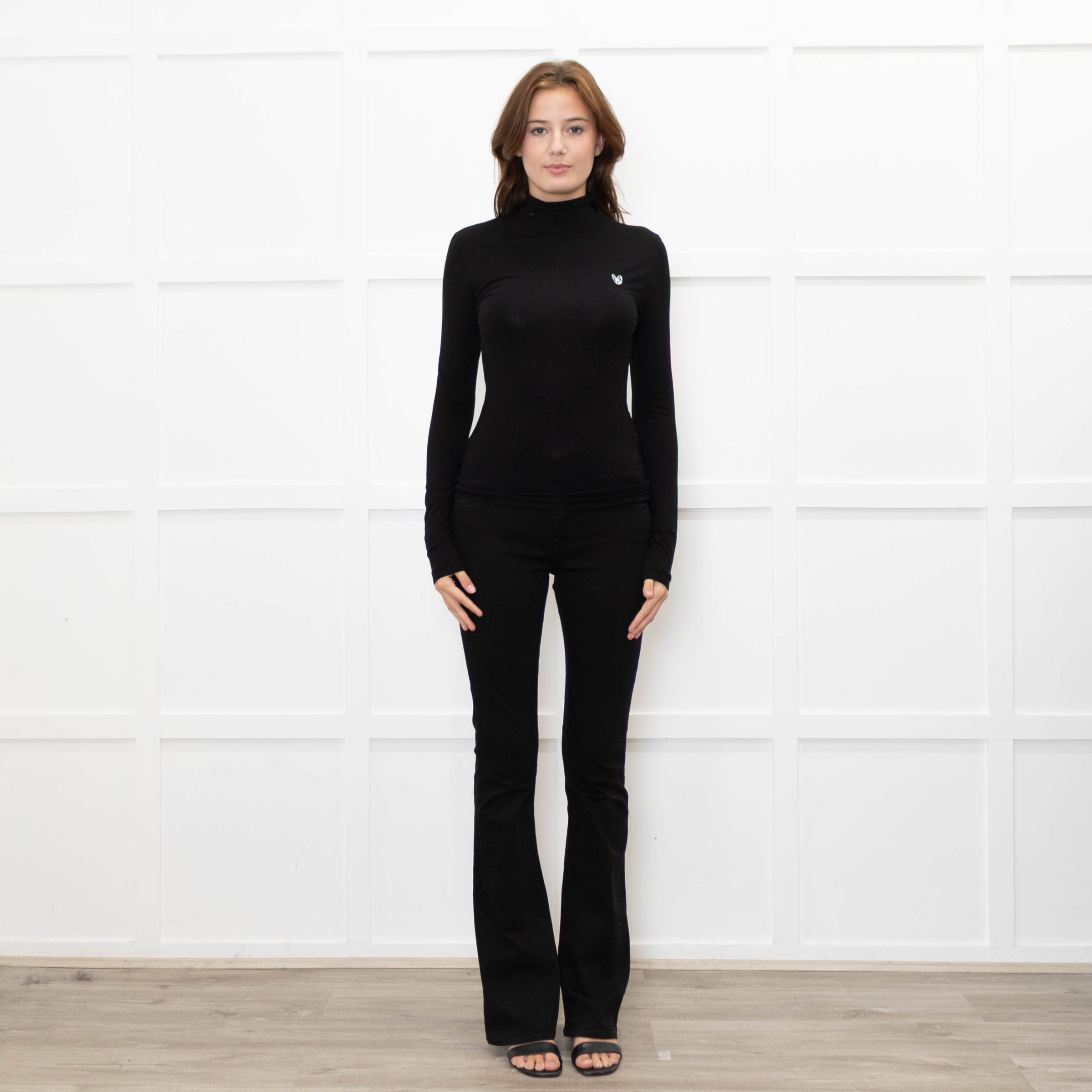 Claudie Pierlot black stretch bulldog emblem top with a turtleneck.