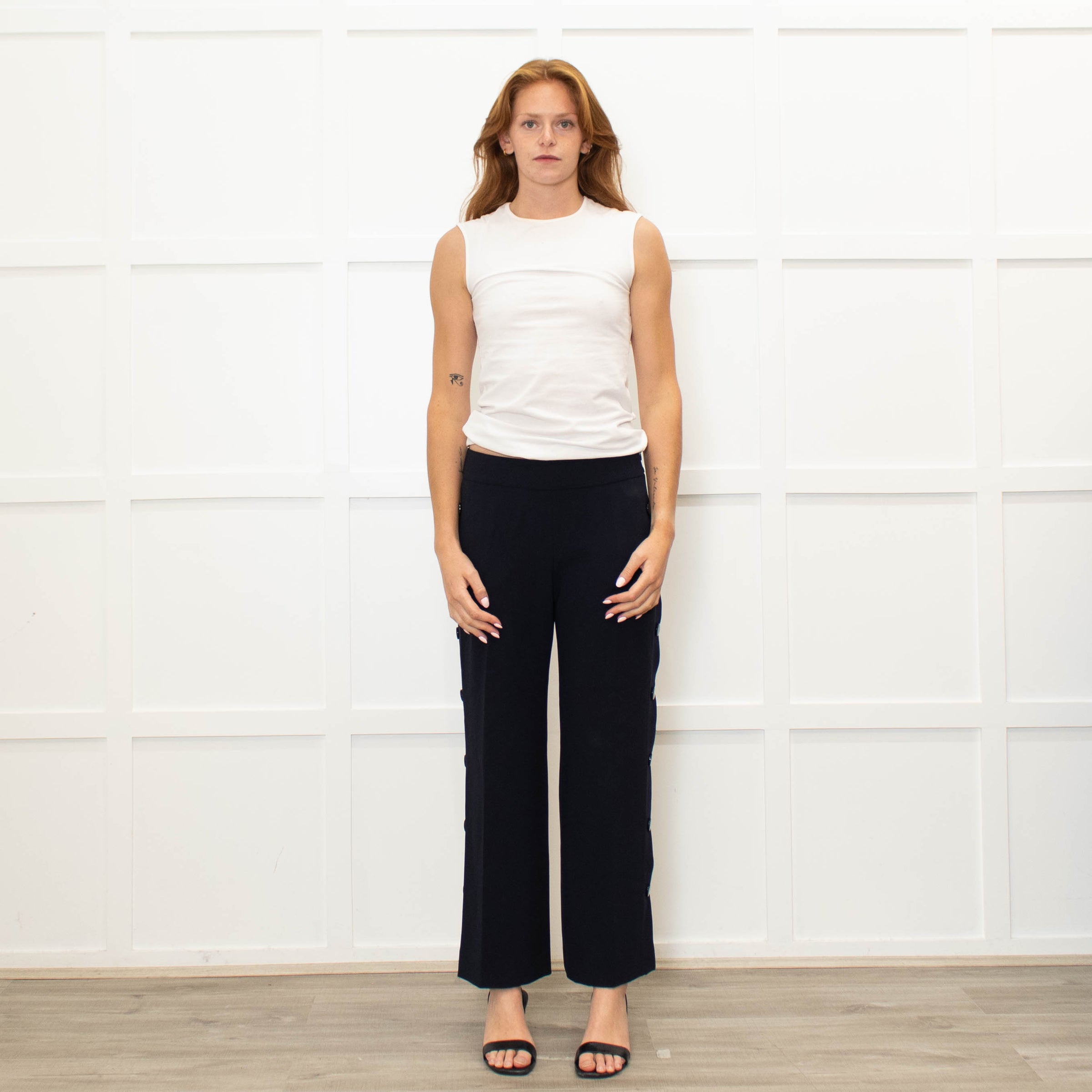 Claudie Pierlot navy trousers with buttons on the sides, two side slip pockets, and two rear patch pockets.