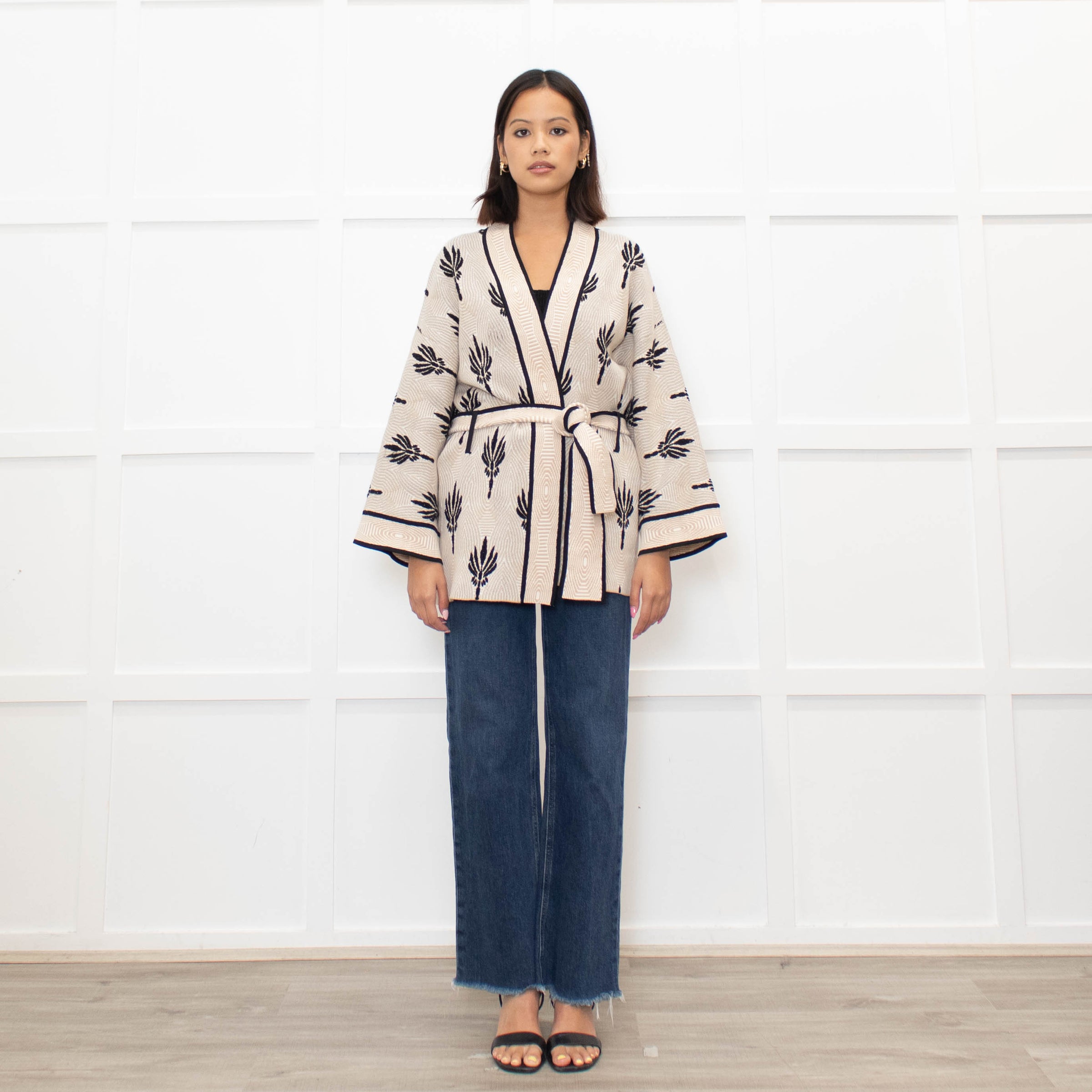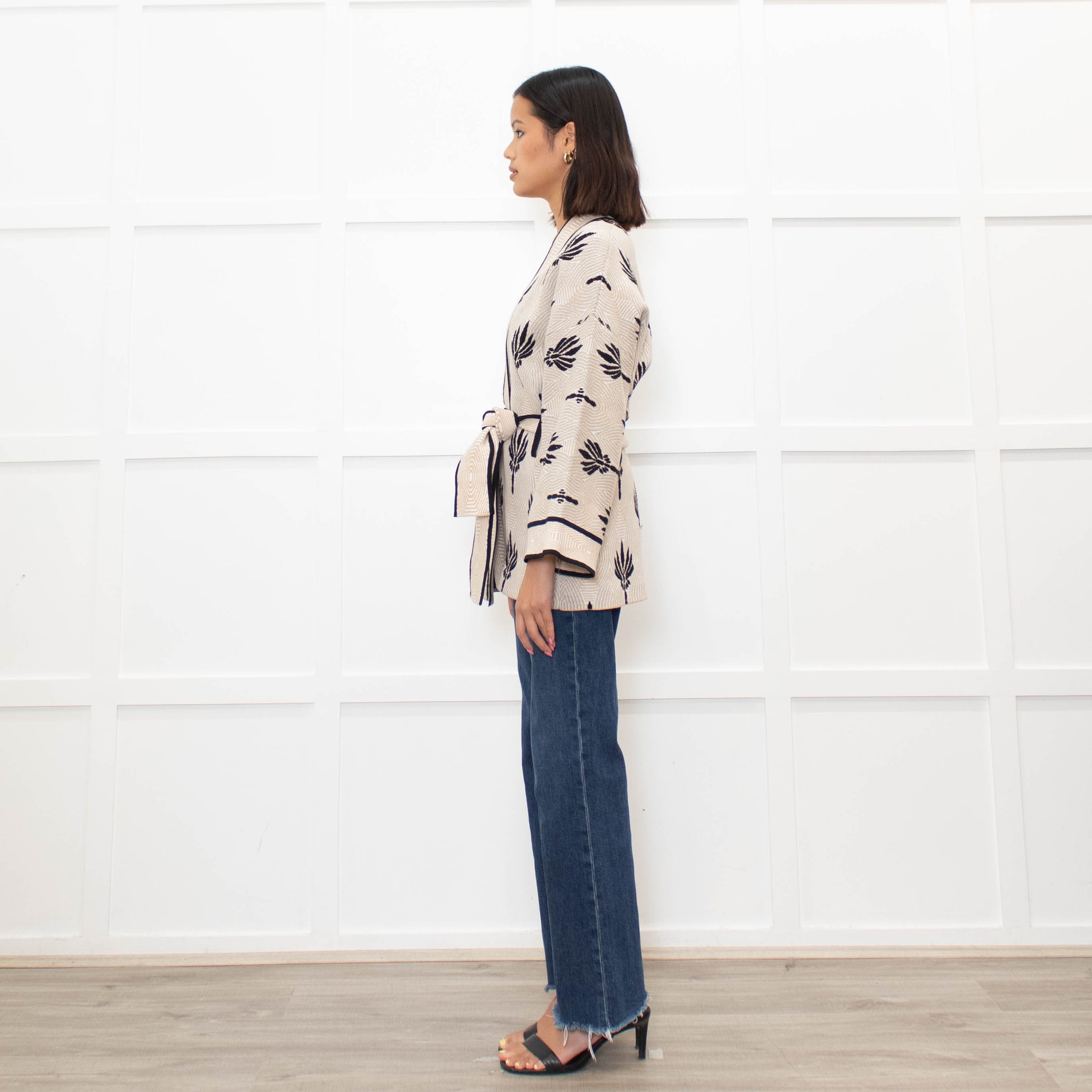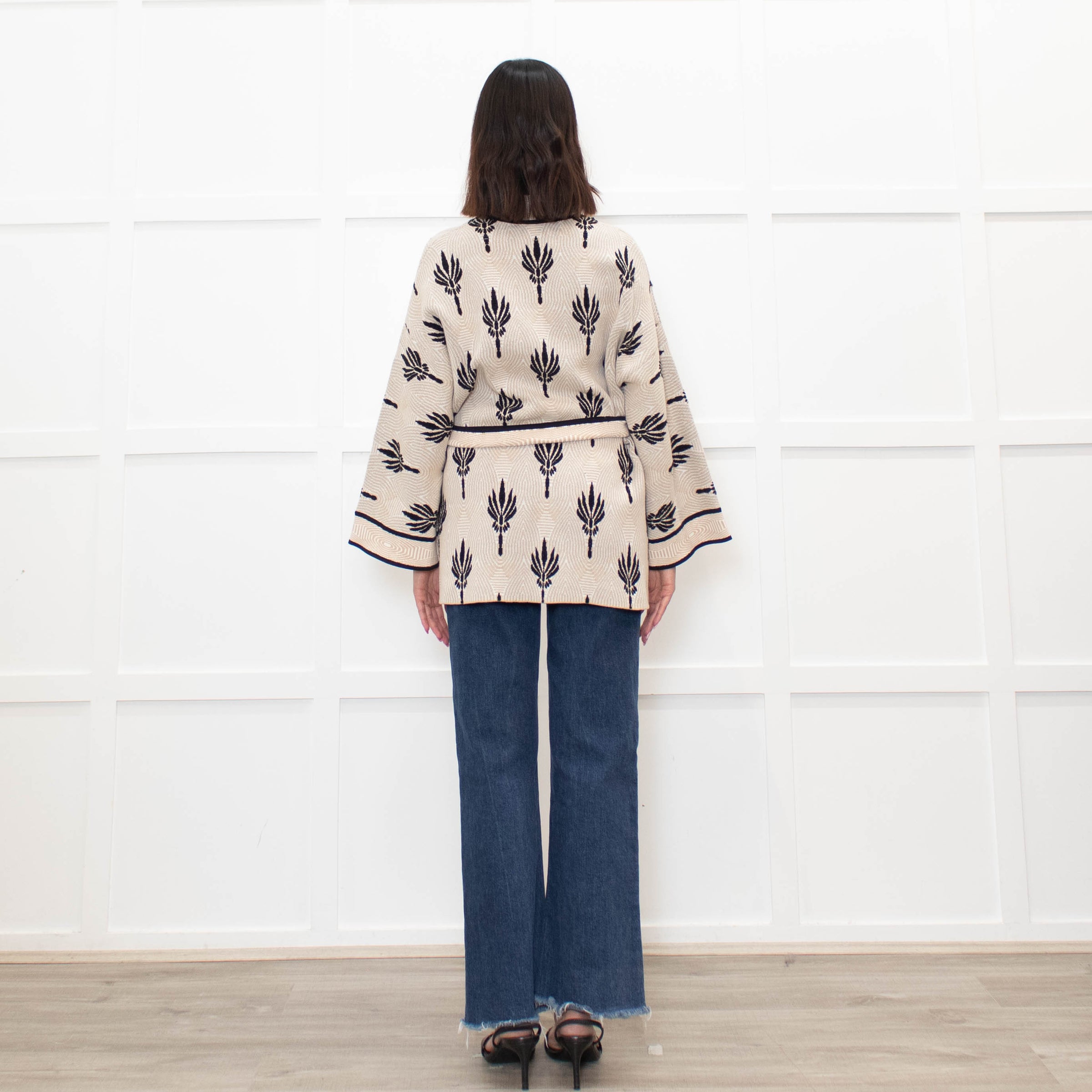Claudie Pierlot beige, cream, and black palm pattern intarsia textured knit cardigan with an open front, wide cut sleeves, and a tied belt.