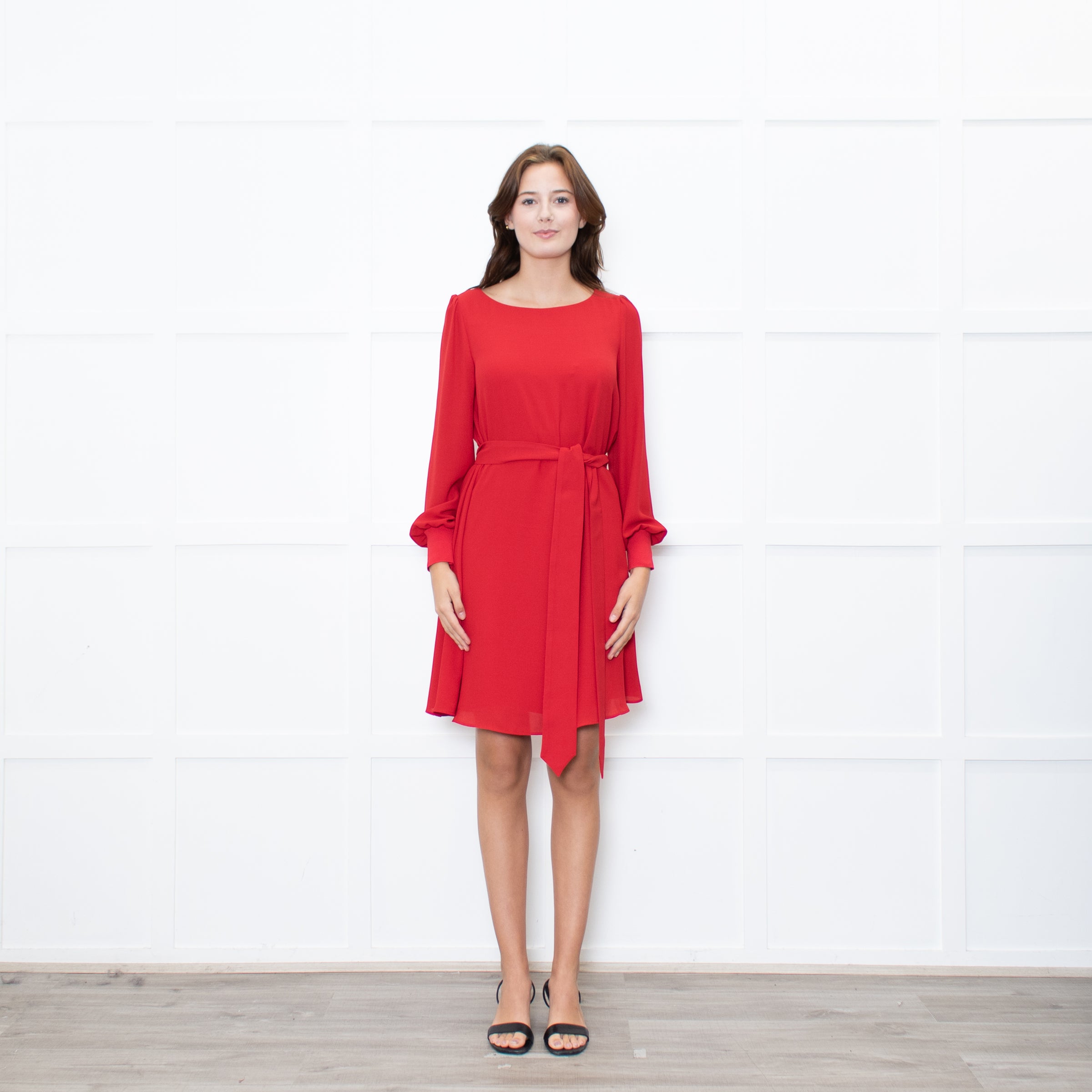 Claudie Pierlot red long-sleeve shift dress with a rounded neckline, balloon cuff sleeves, and a tonal belt.
