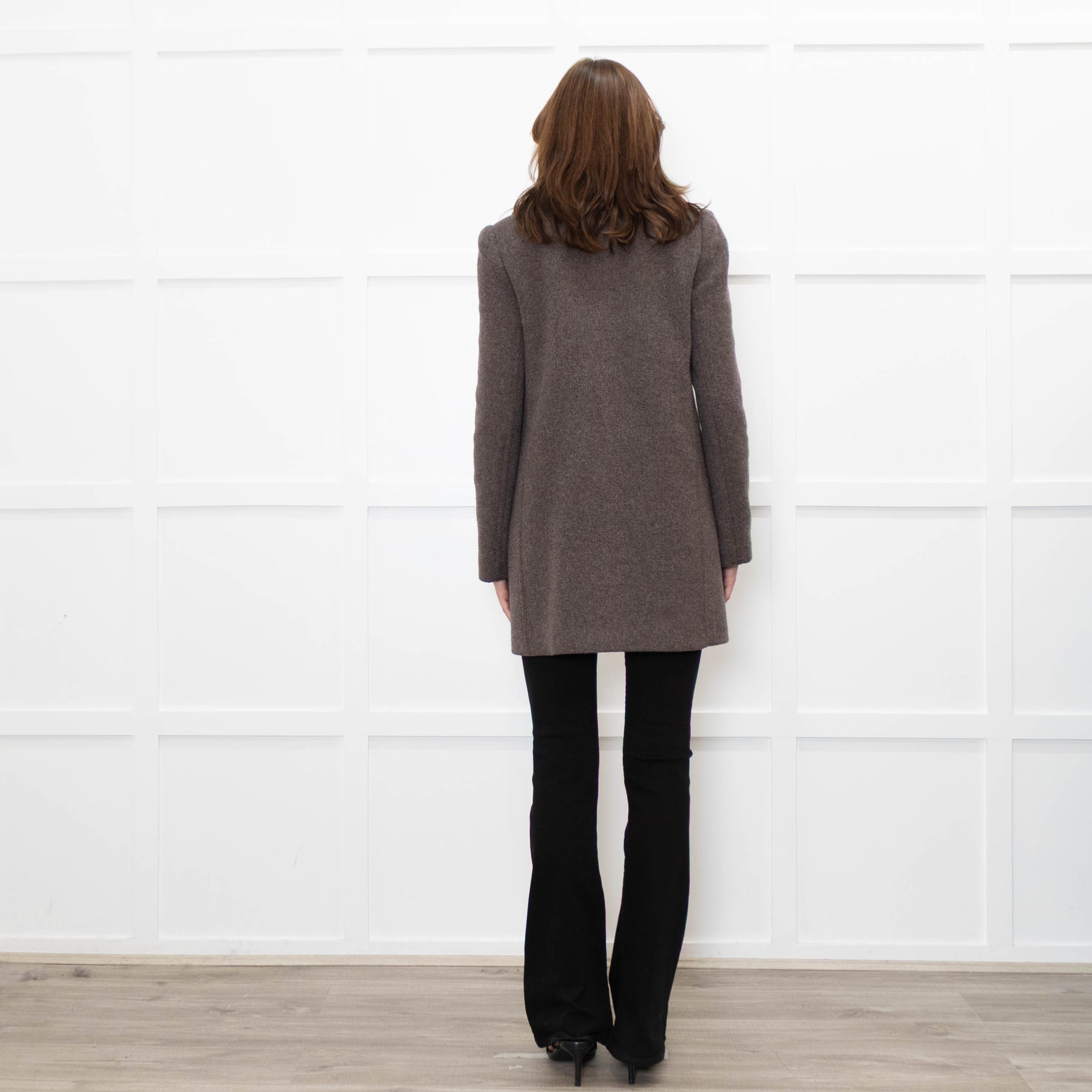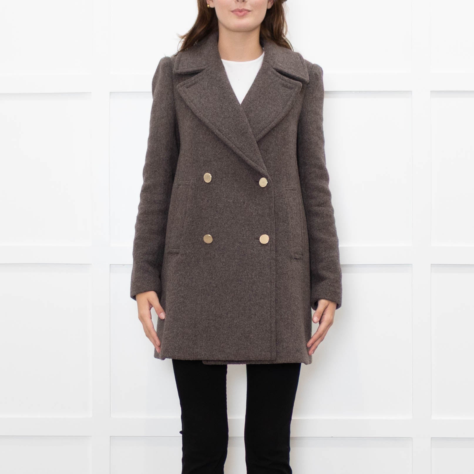Club Monaco brown double-breasted pea coat with symmetrical pockets and mirrored gold buttons.