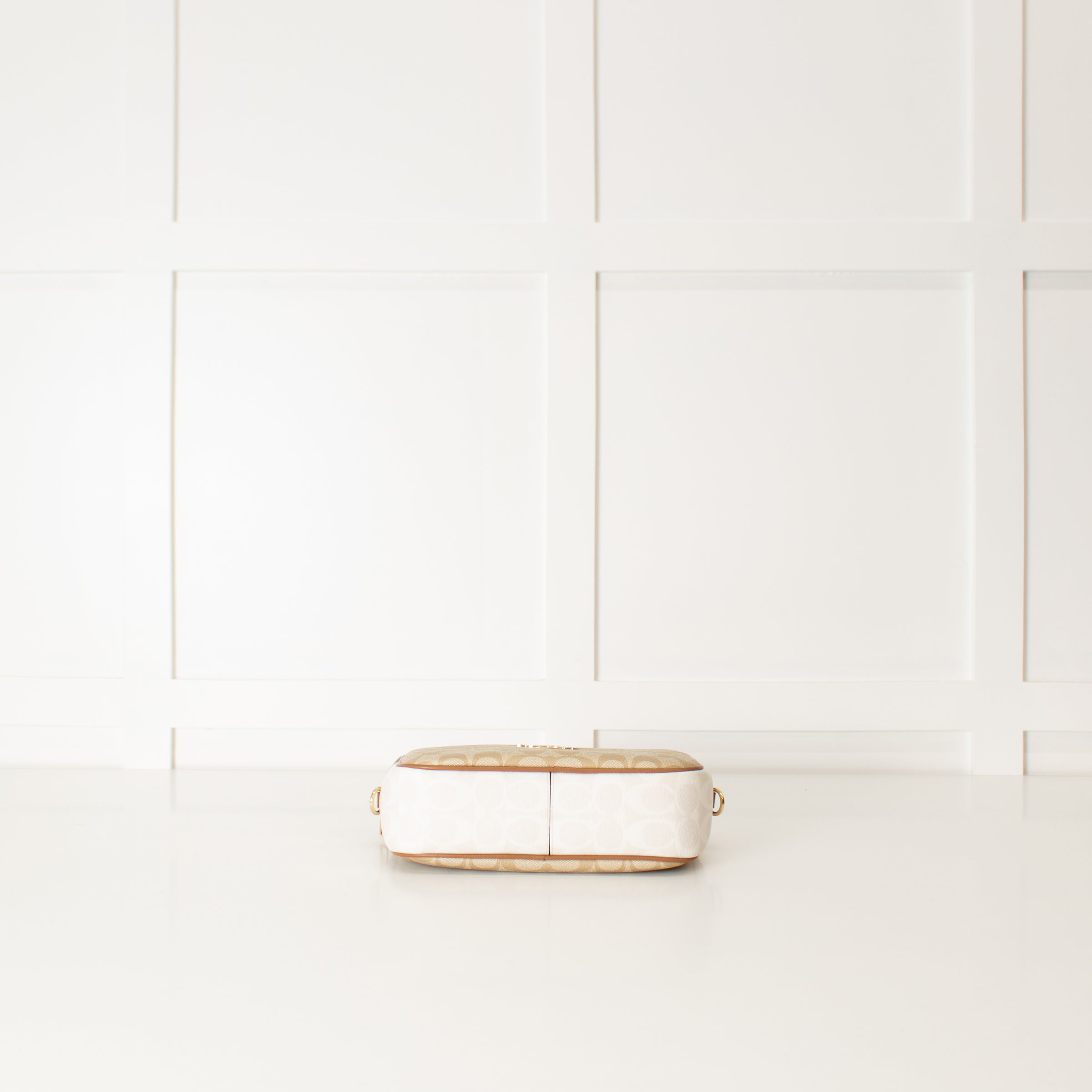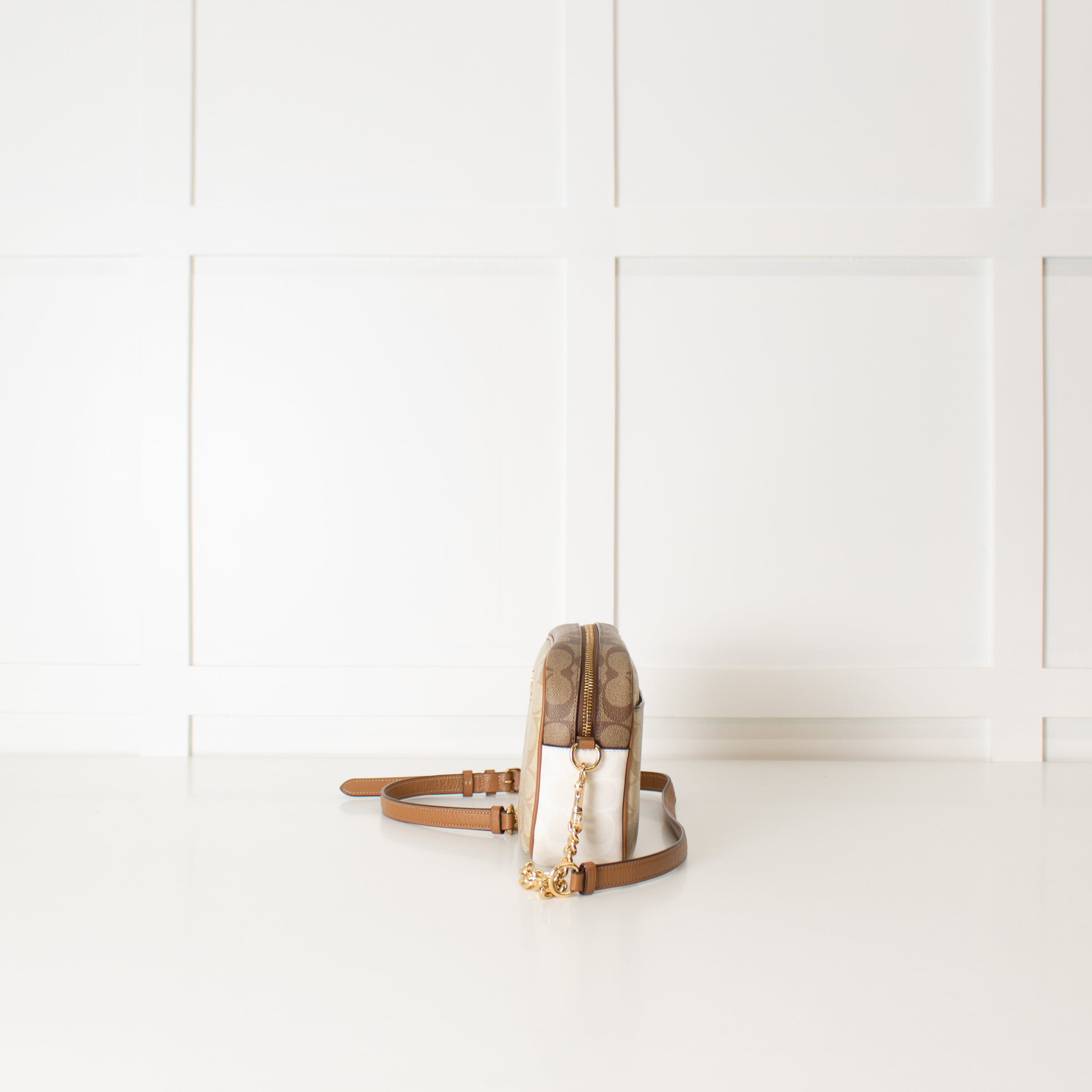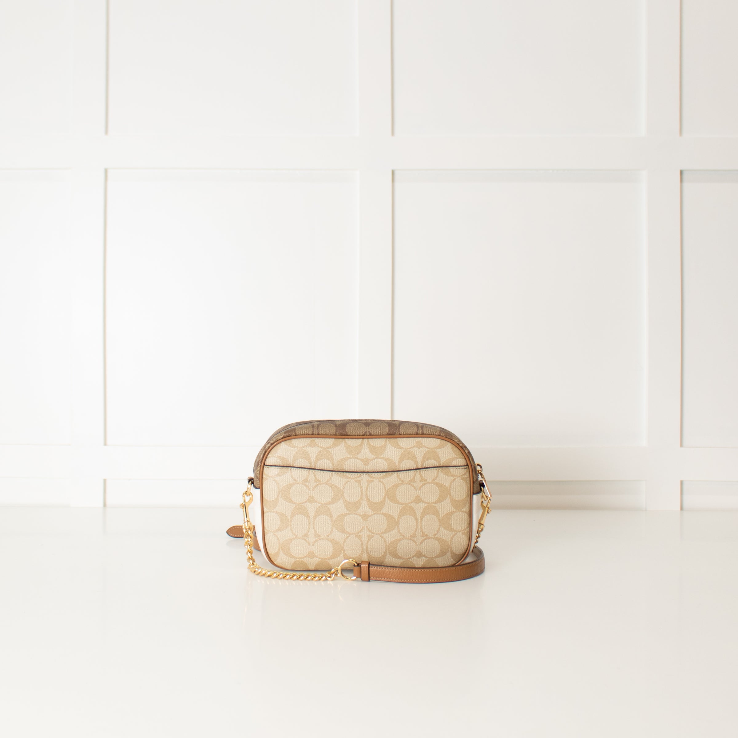 Coach Beige signature coated canvas Jamie camera bag with gold-tone hardware, a wraparound top zip closure, a removable half chain/ leather strap, and a metal branded plaque to the front.