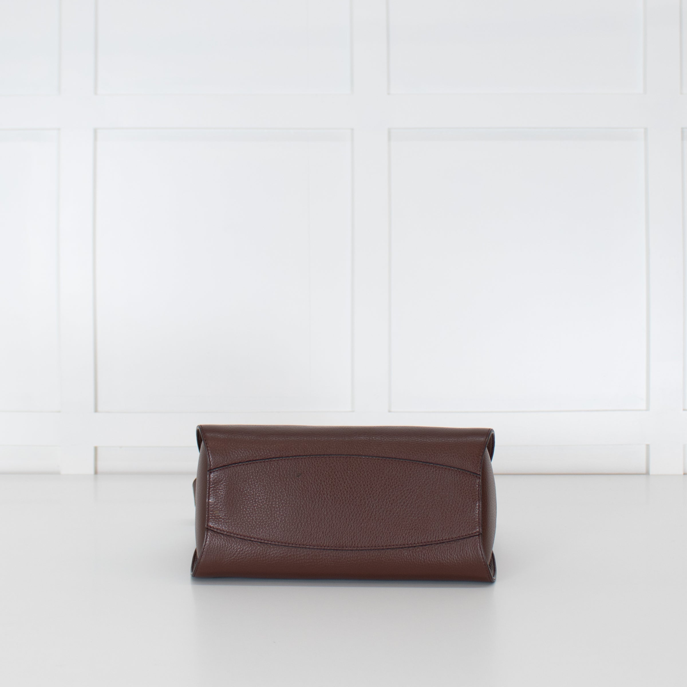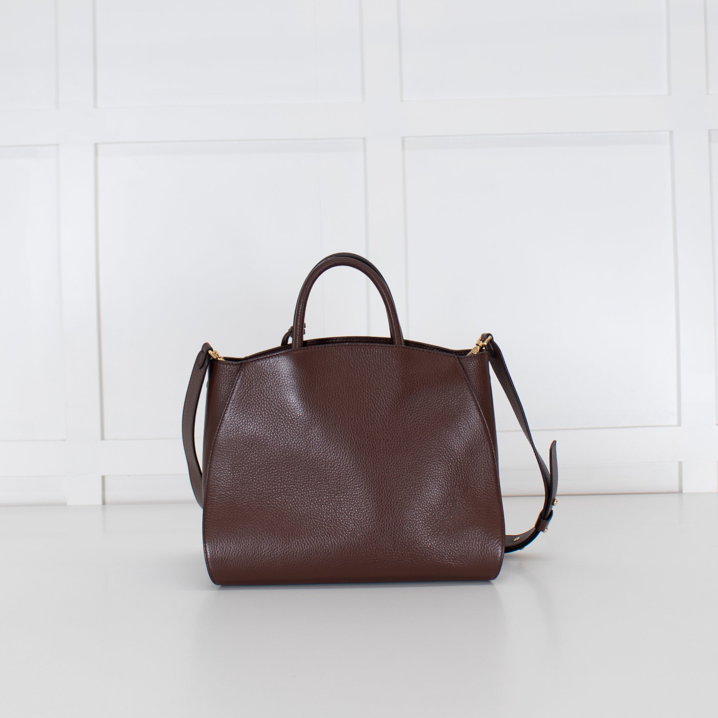 Cocinelle brown grained leather concrete shoulder bag with dual rolled leather top handles, a long detachable strap, a large C logo charm on the front, and a top zip closure. With the original dust bag.