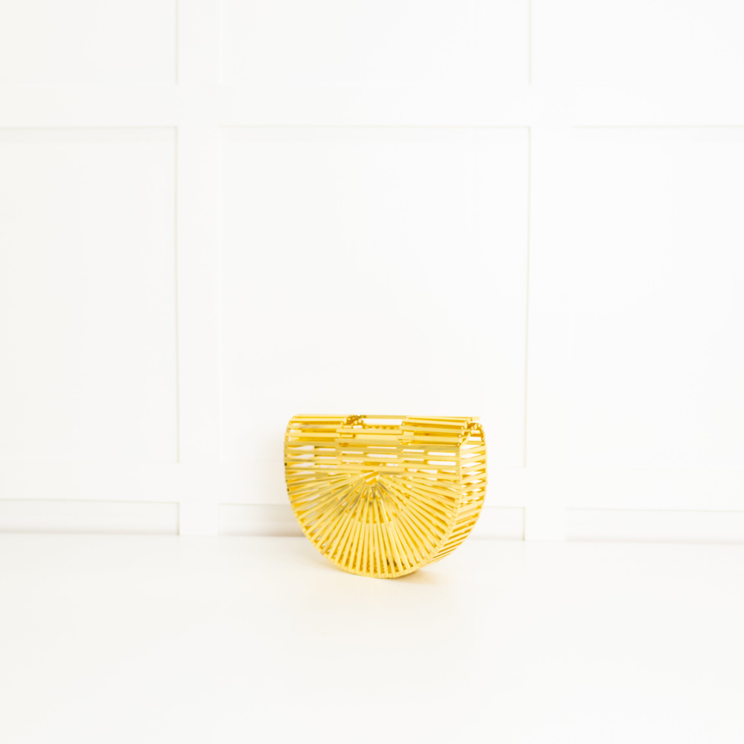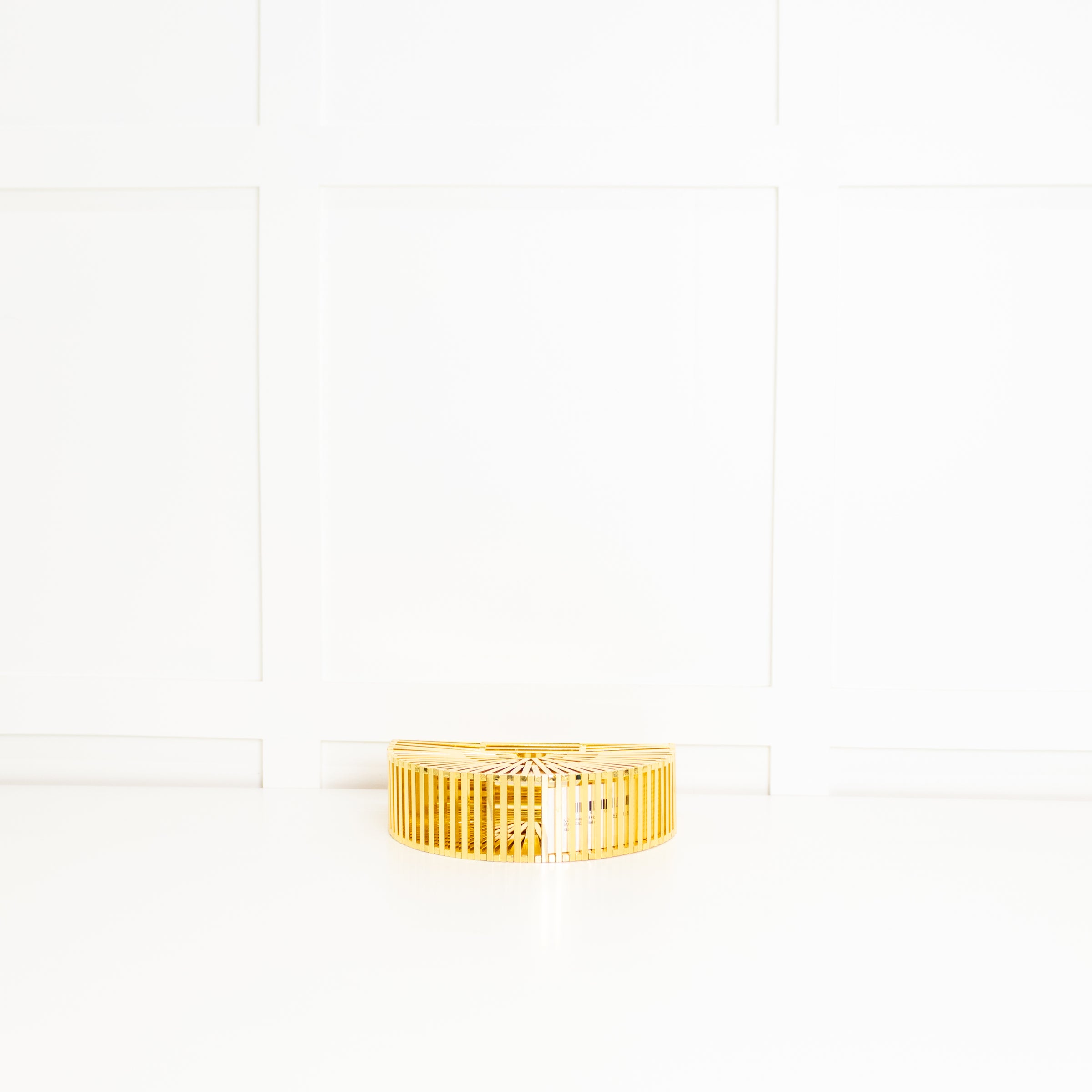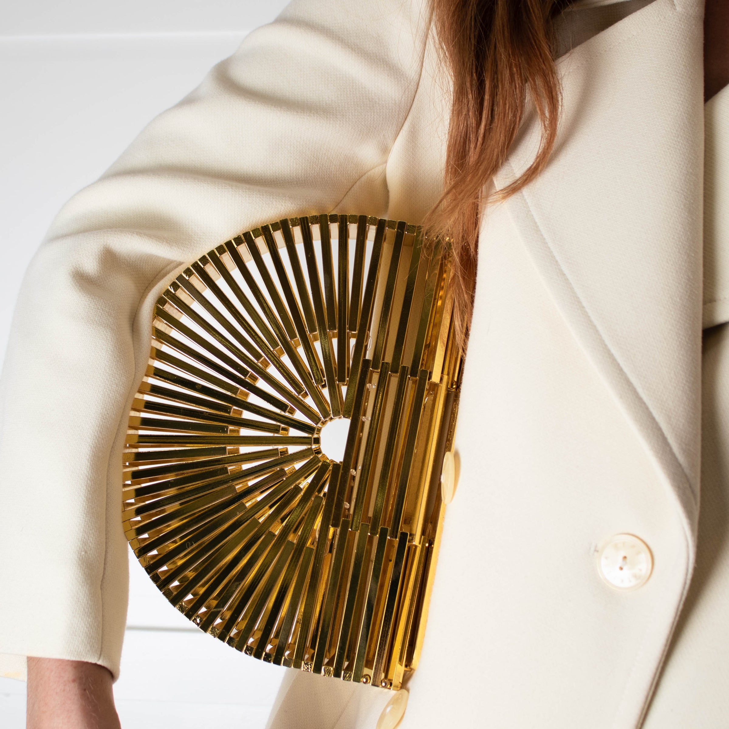 Cult Gaia gold metal Ark clutch bag, finished with an open top and branded engraving to the inside of the handle. With the original dust bag.
