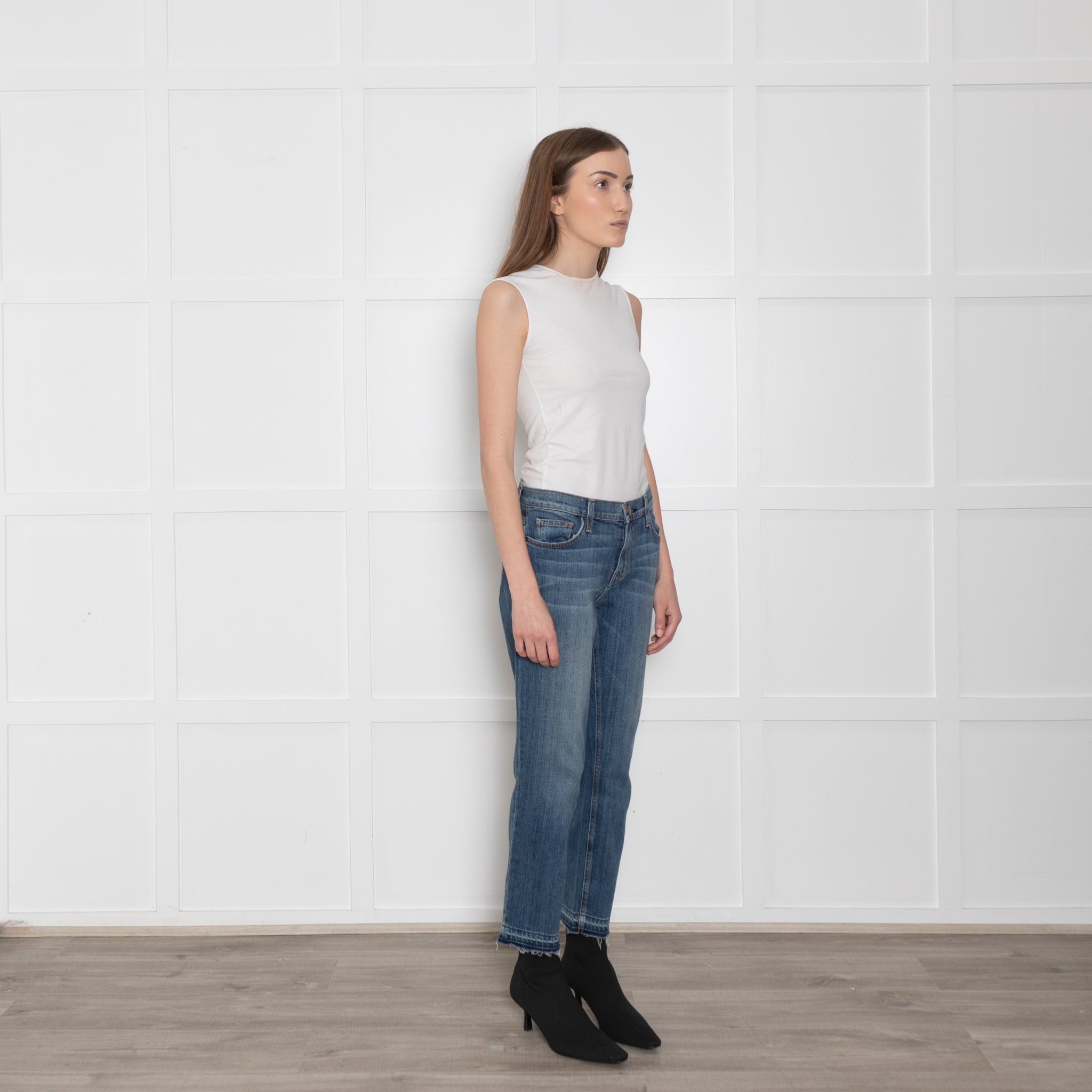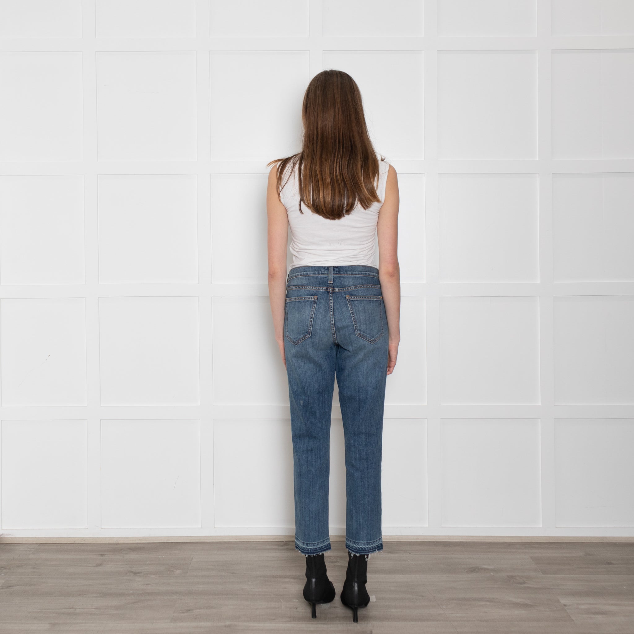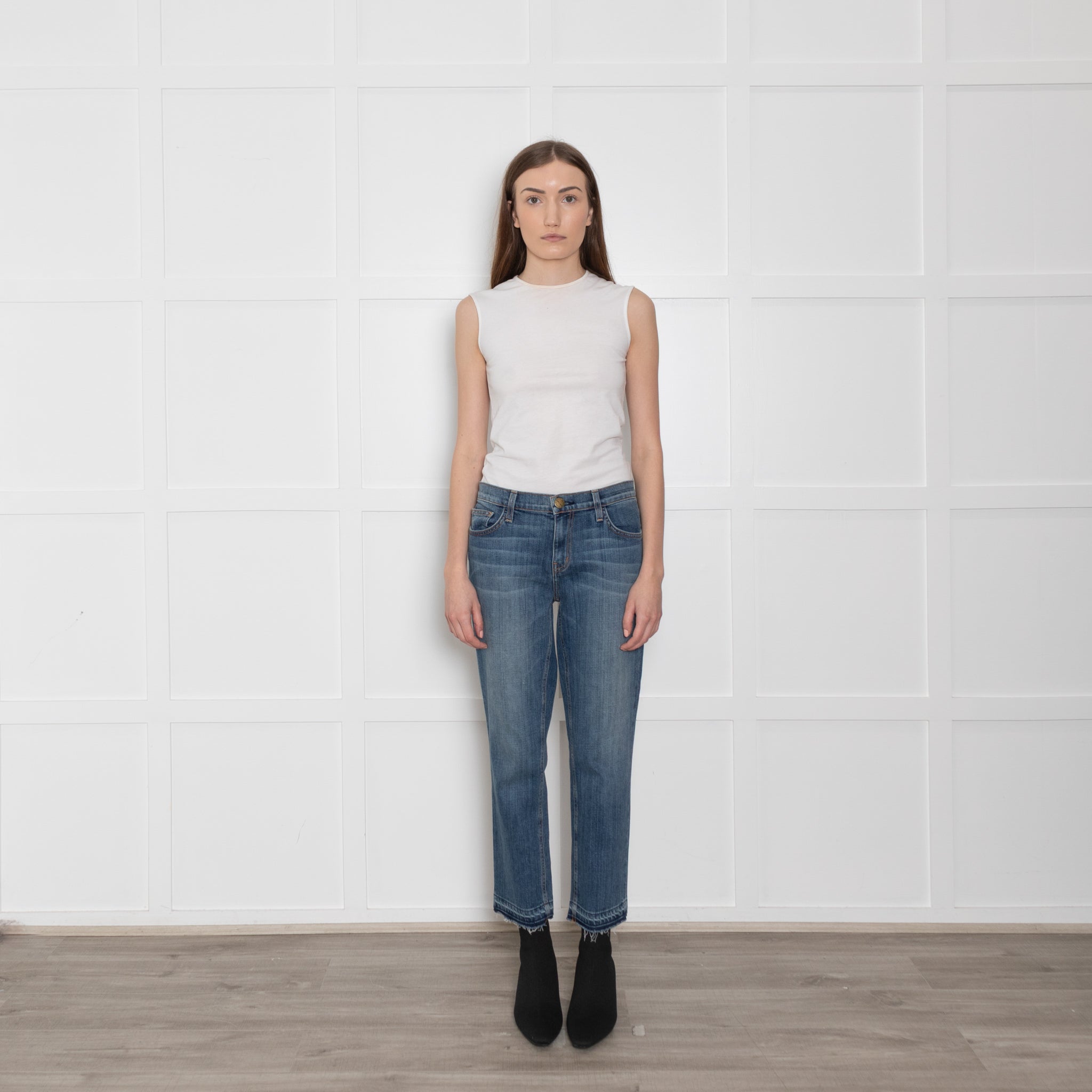 Current Elliott blue cropped wash jeans, featuring a stunning straight leg design, with four total pockets, and a a zip, button-up front closure.