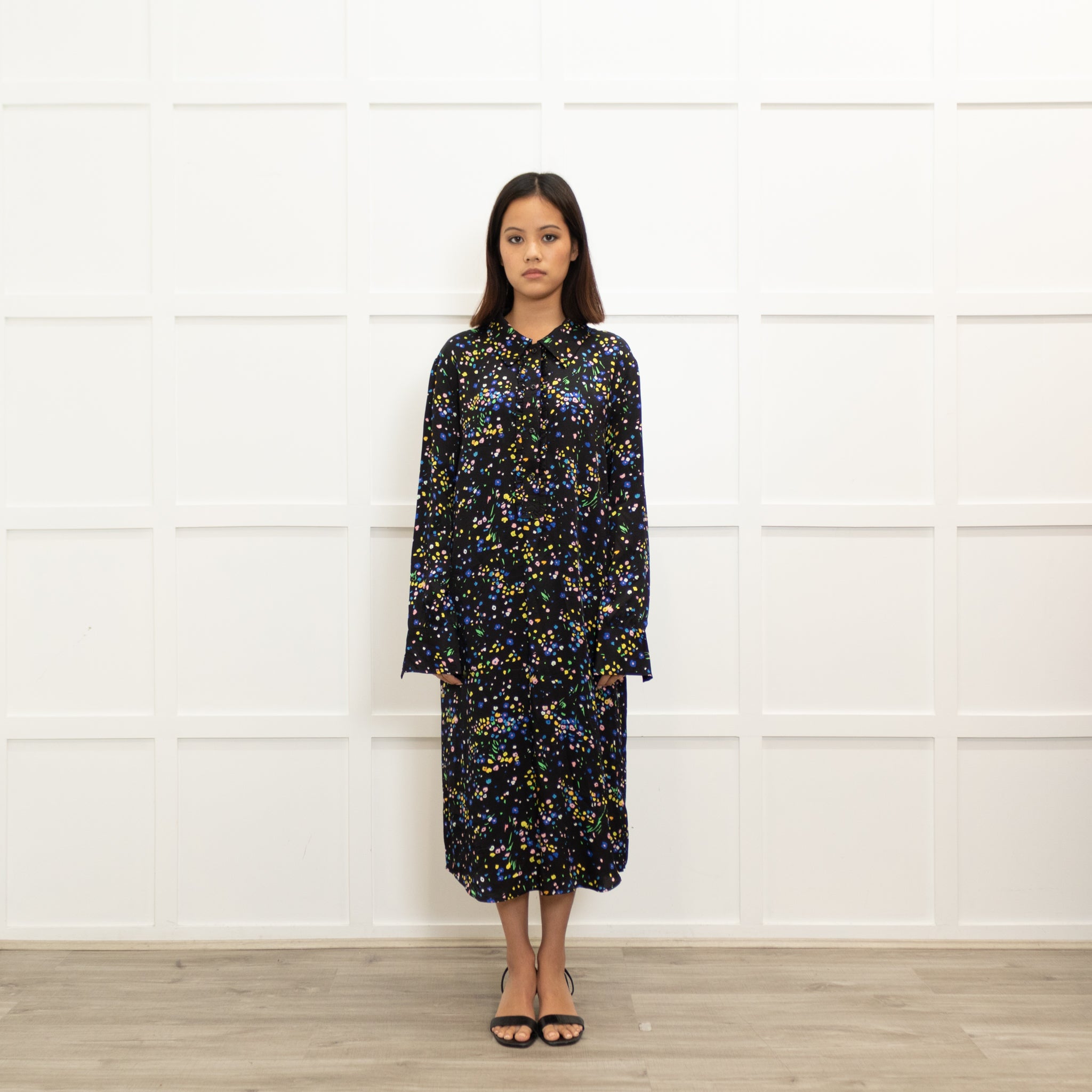 Custommade black, yellow and blue long-sleeve long dress, featuring a stunning ditzy floral print design, with a classic collar, V-neck button-up as well as button-up sleeves.