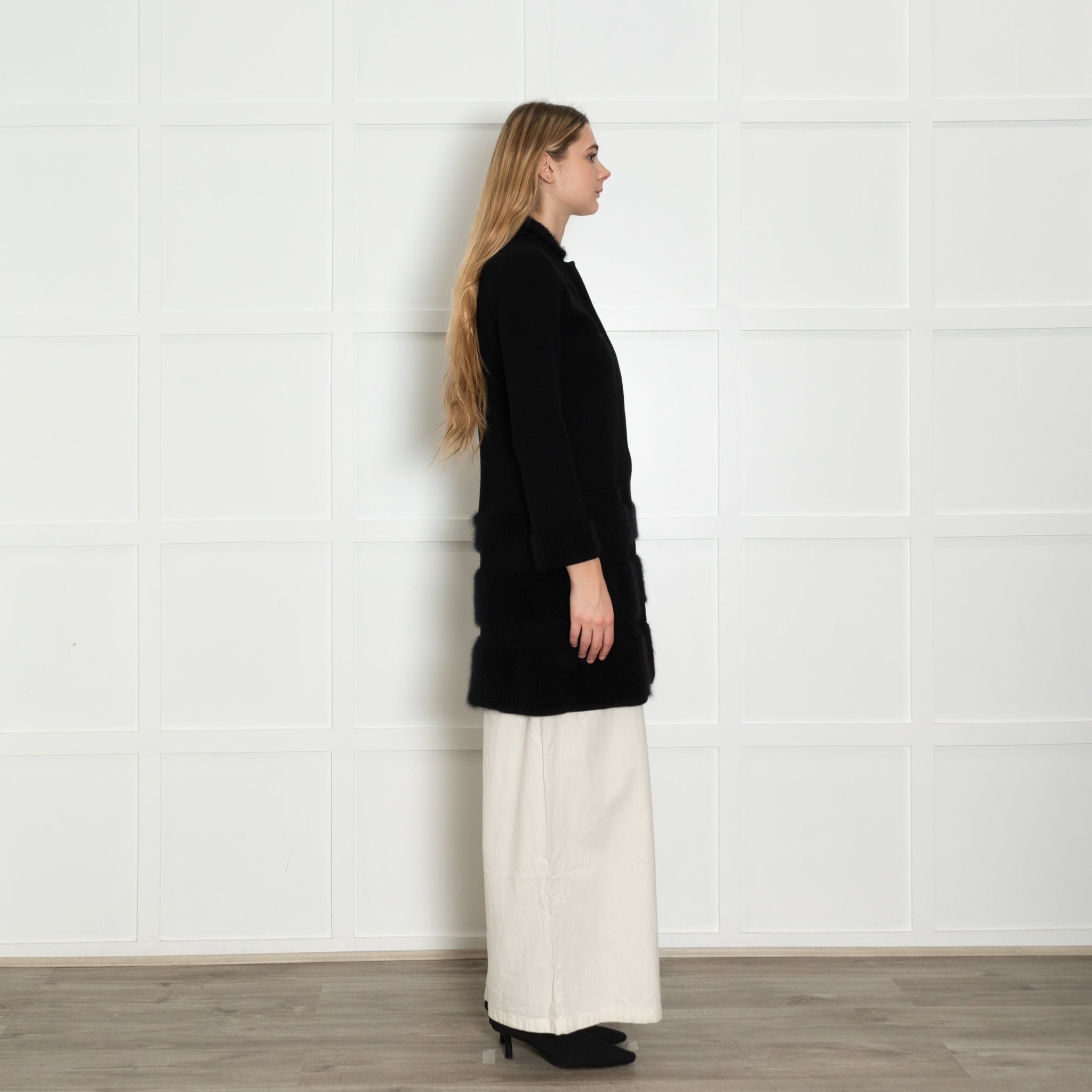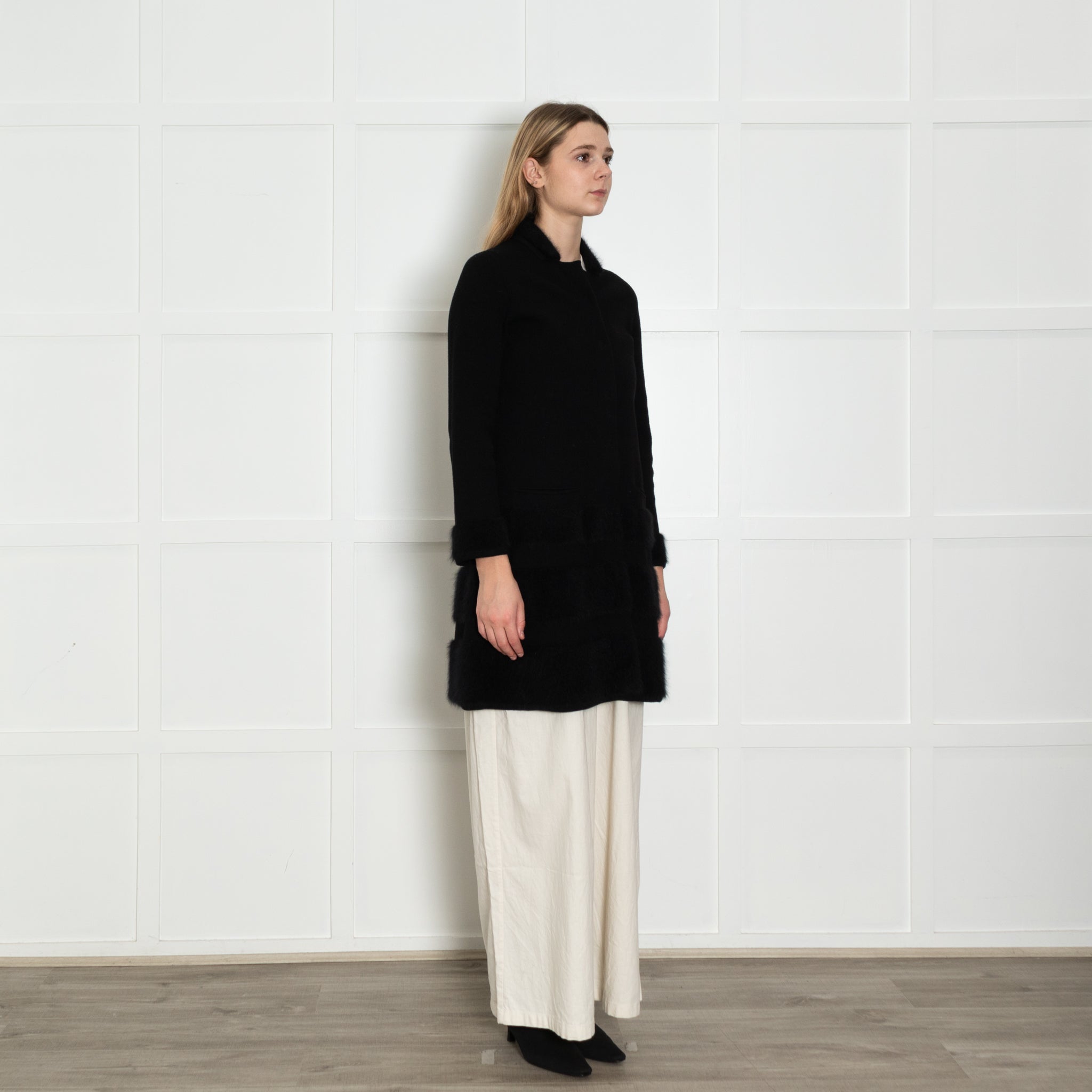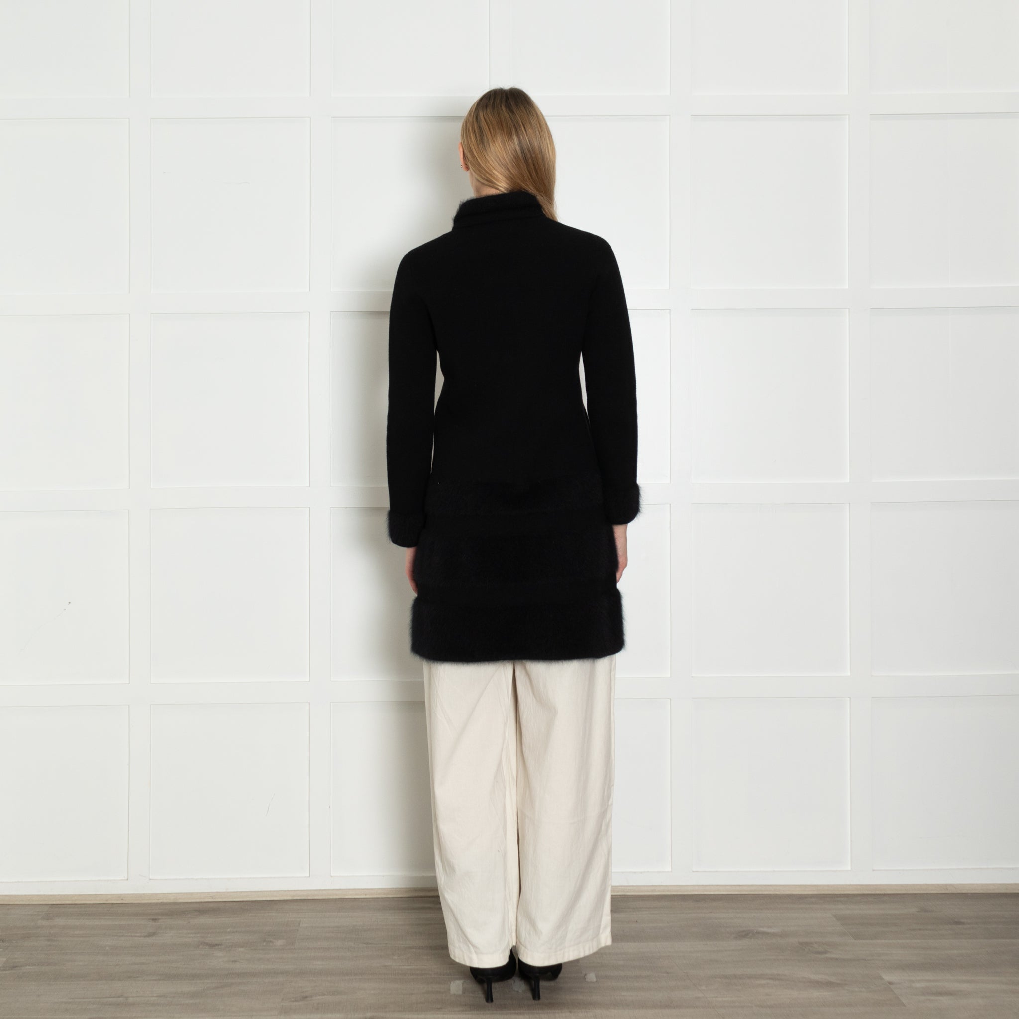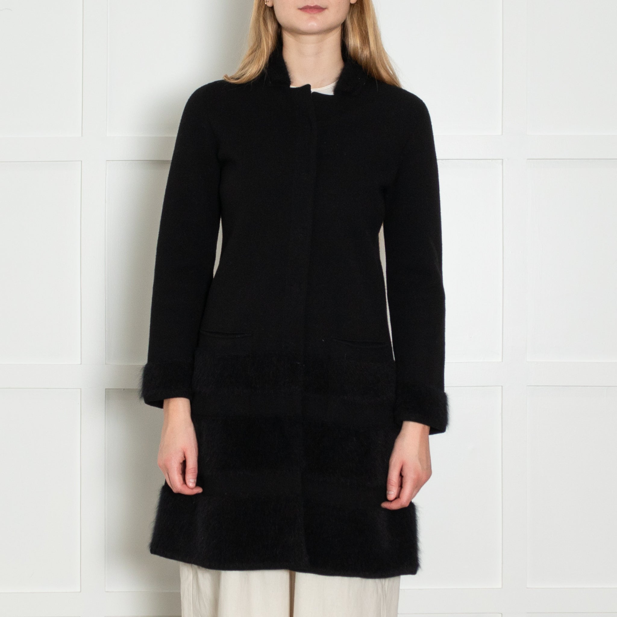D Exterior stunning black long-sleeve coat, crafted with a soft knit angora blend, featuring a button-up front, two front pockets, and a fur neckline, with the bottom half design being a lined fur-patten.