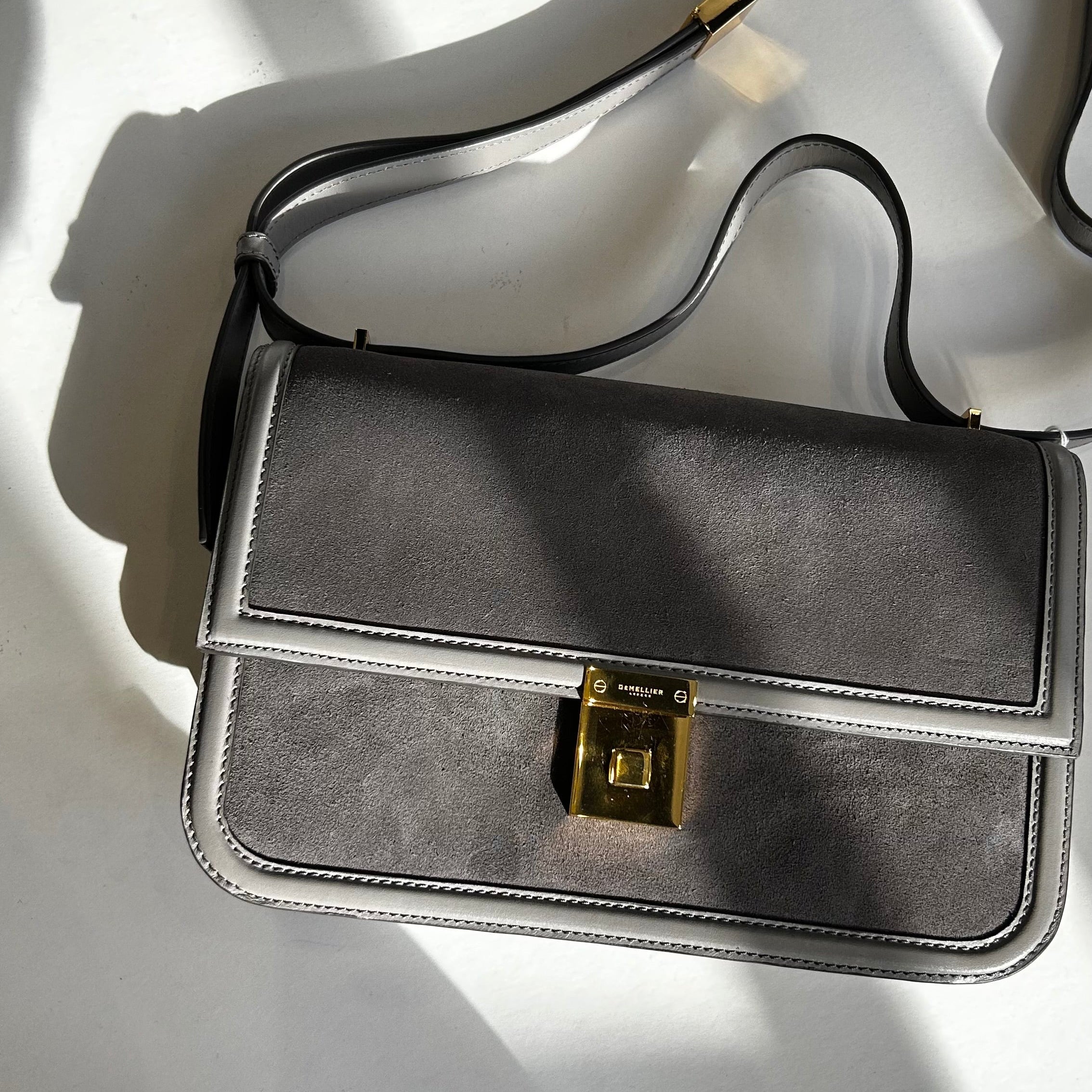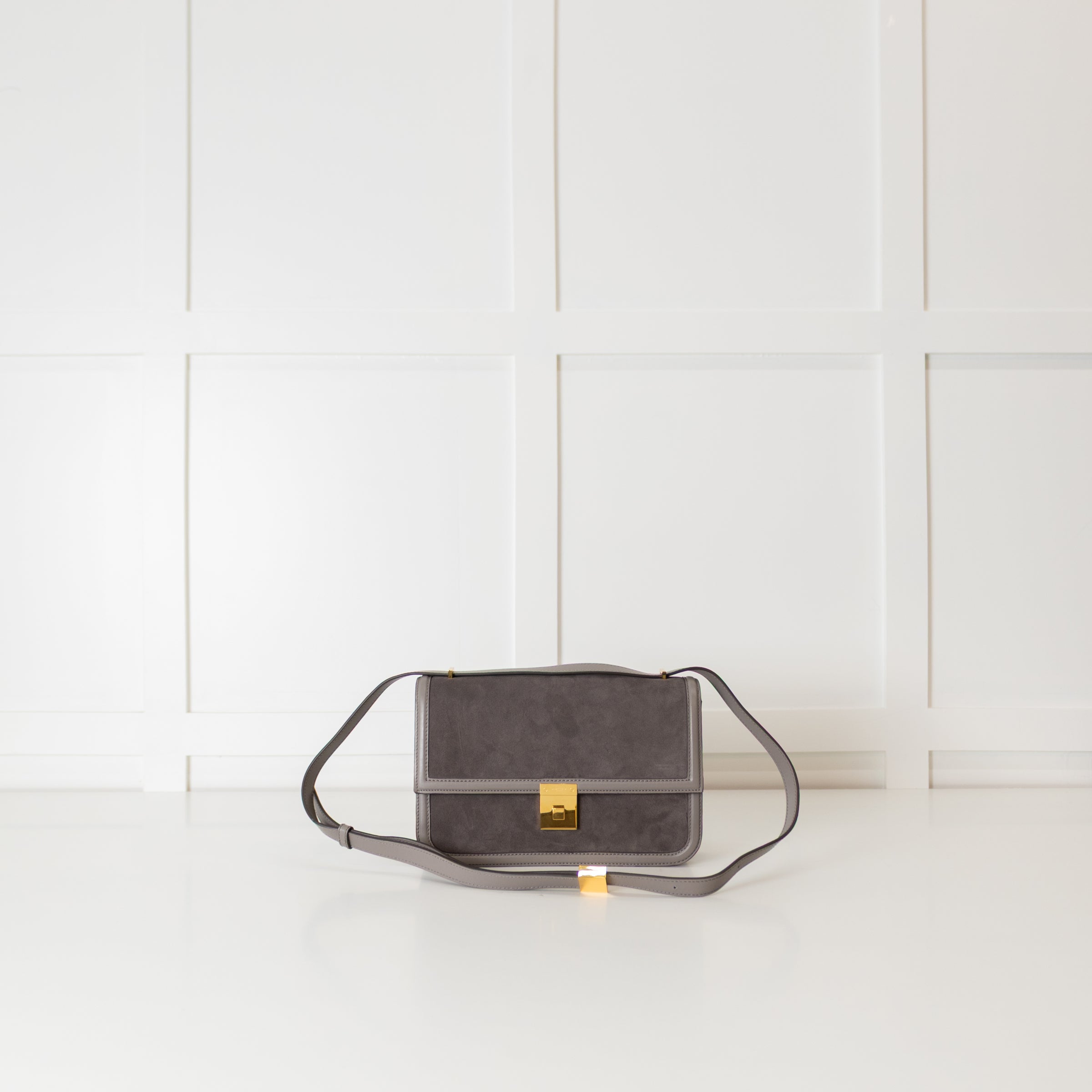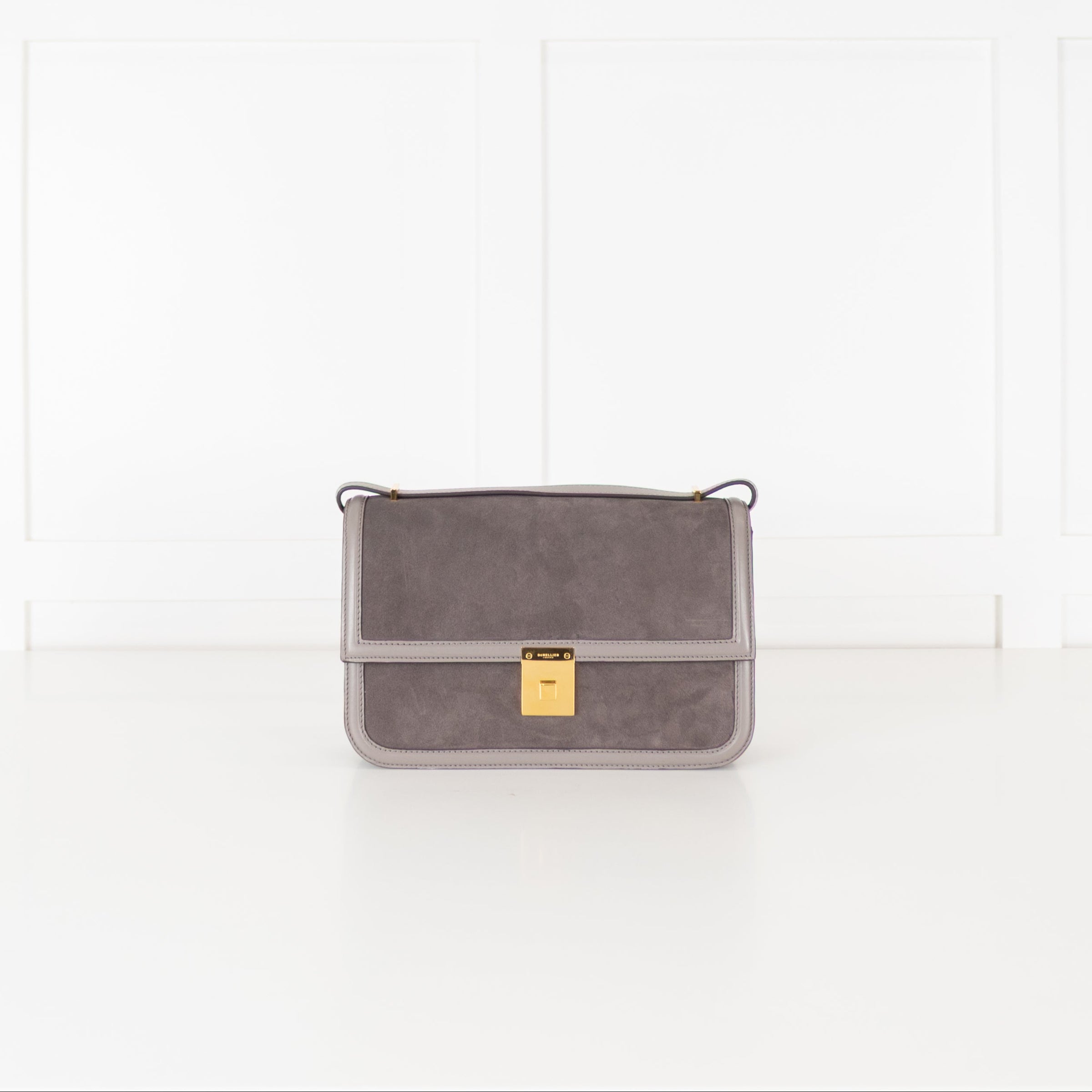DeMellier Paris grey suede crossbody bag with smooth leather trims and gold-tone hardware. The structured silhouette features a front flap with the brand’s signature push-lock fastening and a slim adjustable shoulder strap for versatile styling. The interior opens to a main compartment with a slip pocket an elegant piece that transitions effortlessly from day to evening. The original RRP £520.