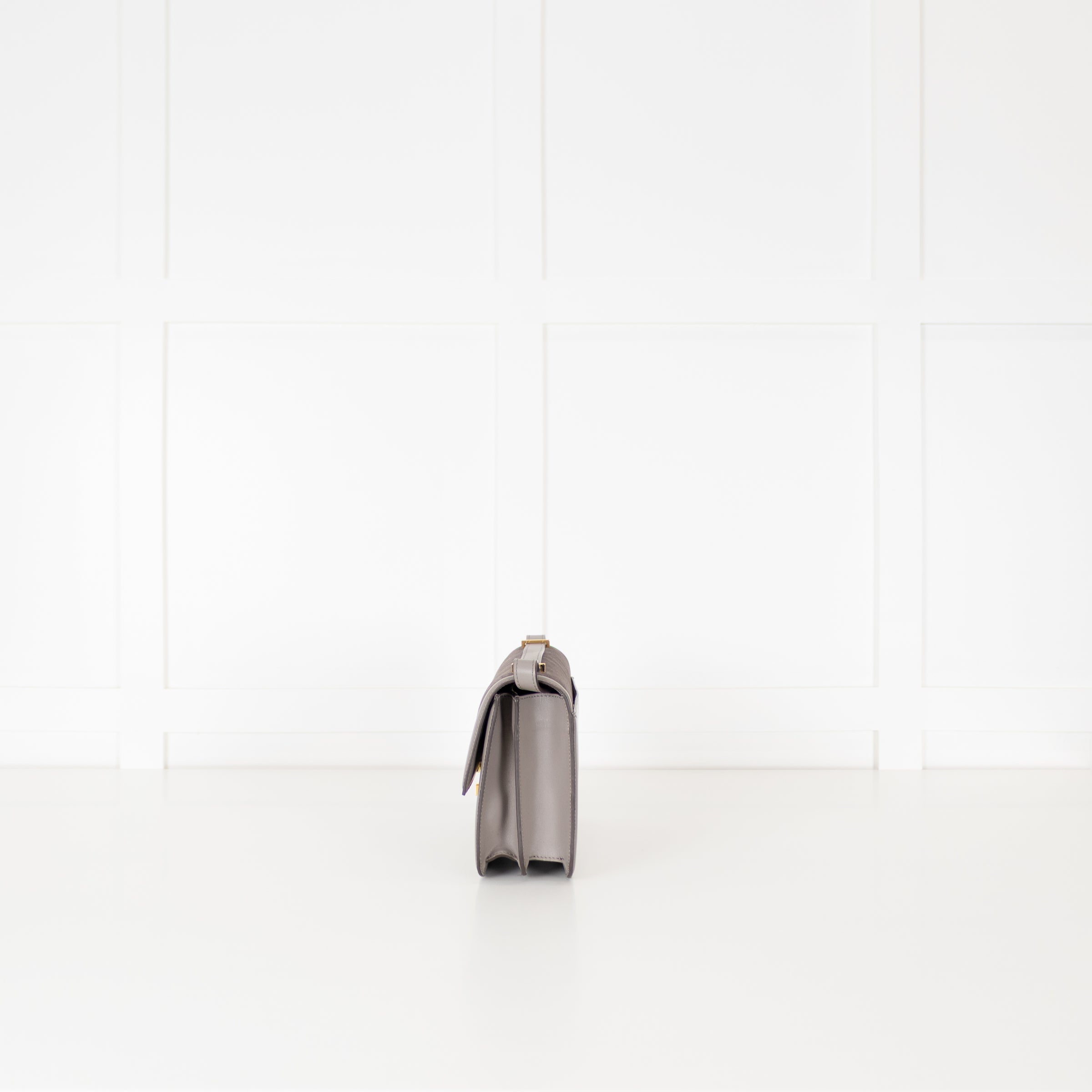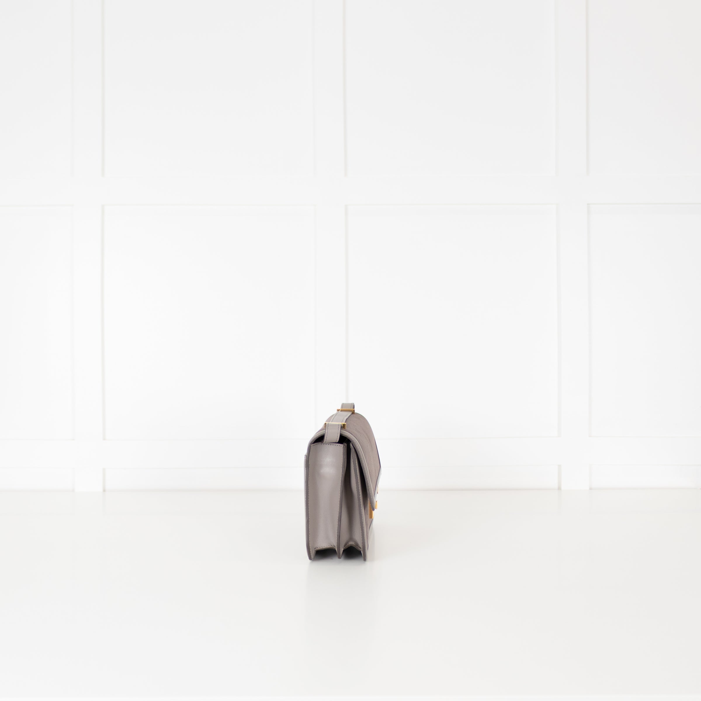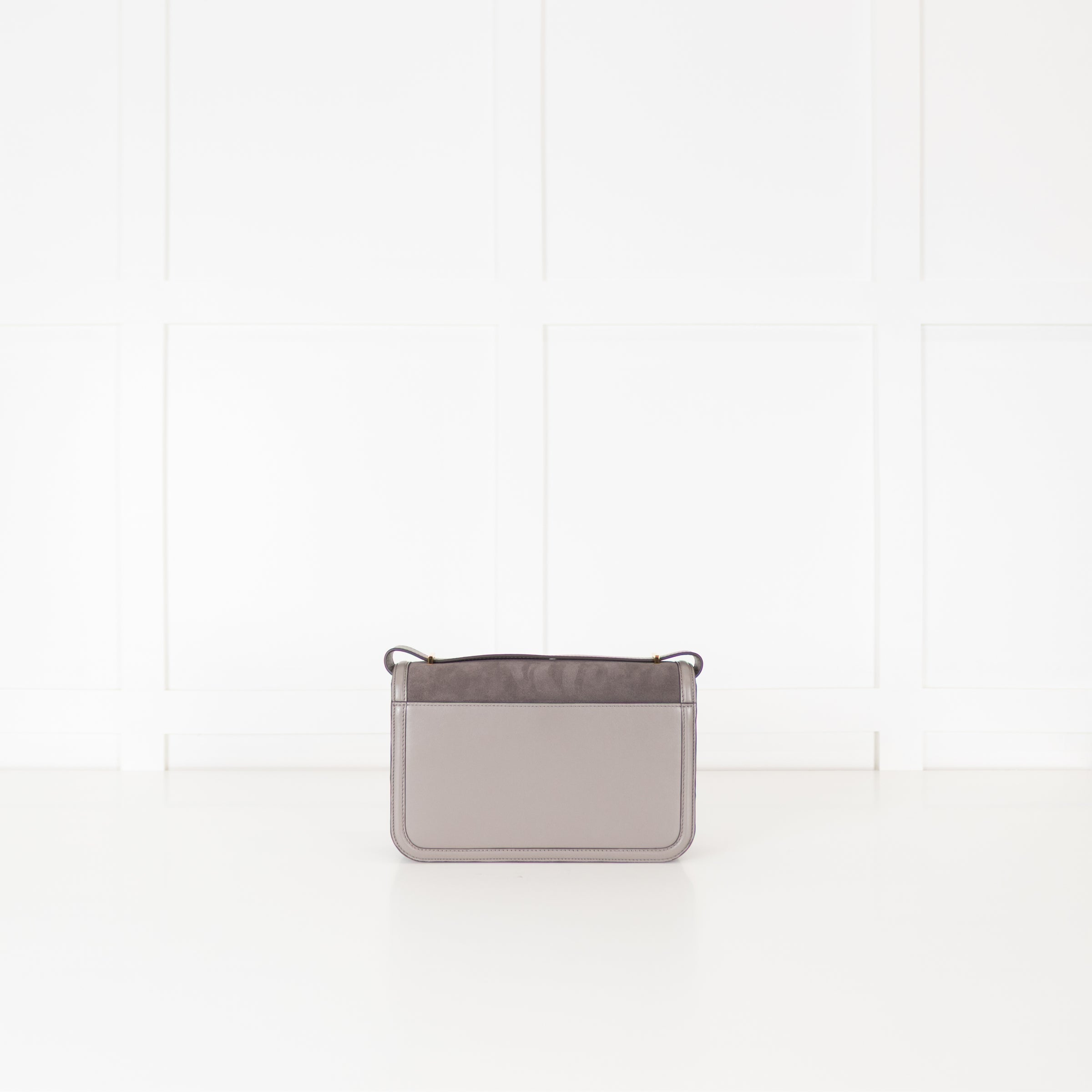 DeMellier Paris grey suede crossbody bag with smooth leather trims and gold-tone hardware. The structured silhouette features a front flap with the brand’s signature push-lock fastening and a slim adjustable shoulder strap for versatile styling. The interior opens to a main compartment with a slip pocket an elegant piece that transitions effortlessly from day to evening. The original RRP £520.