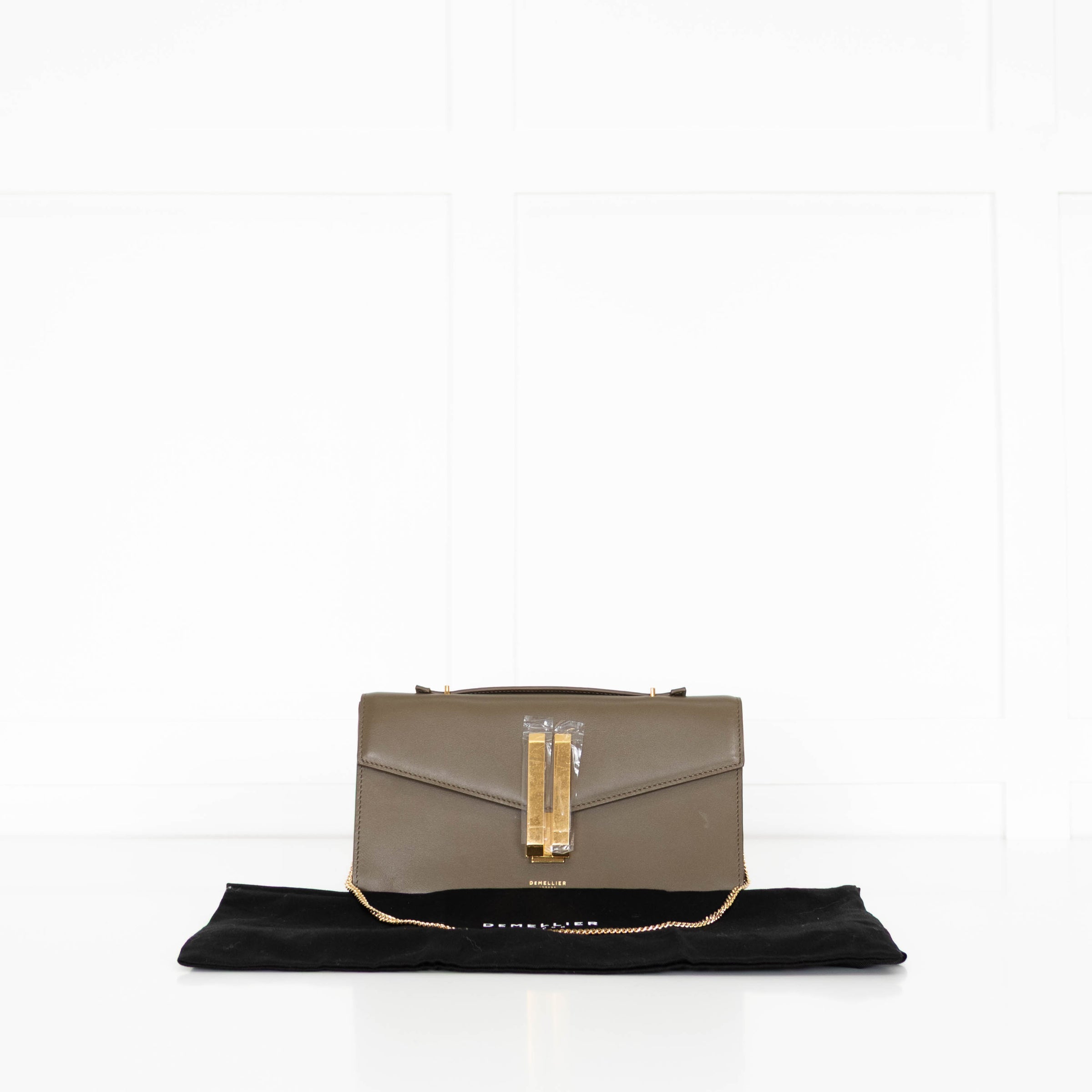 DeMellier Vancouver olive green leather clutch bag finished with the label’s instantly recognisable gold front clasp and structured top handle. The detachable strap allows for versatile styling, while the clean lines and minimalist design reflect DeMellier’s modern-luxe aesthetic. Current collection. The Original RRP £395