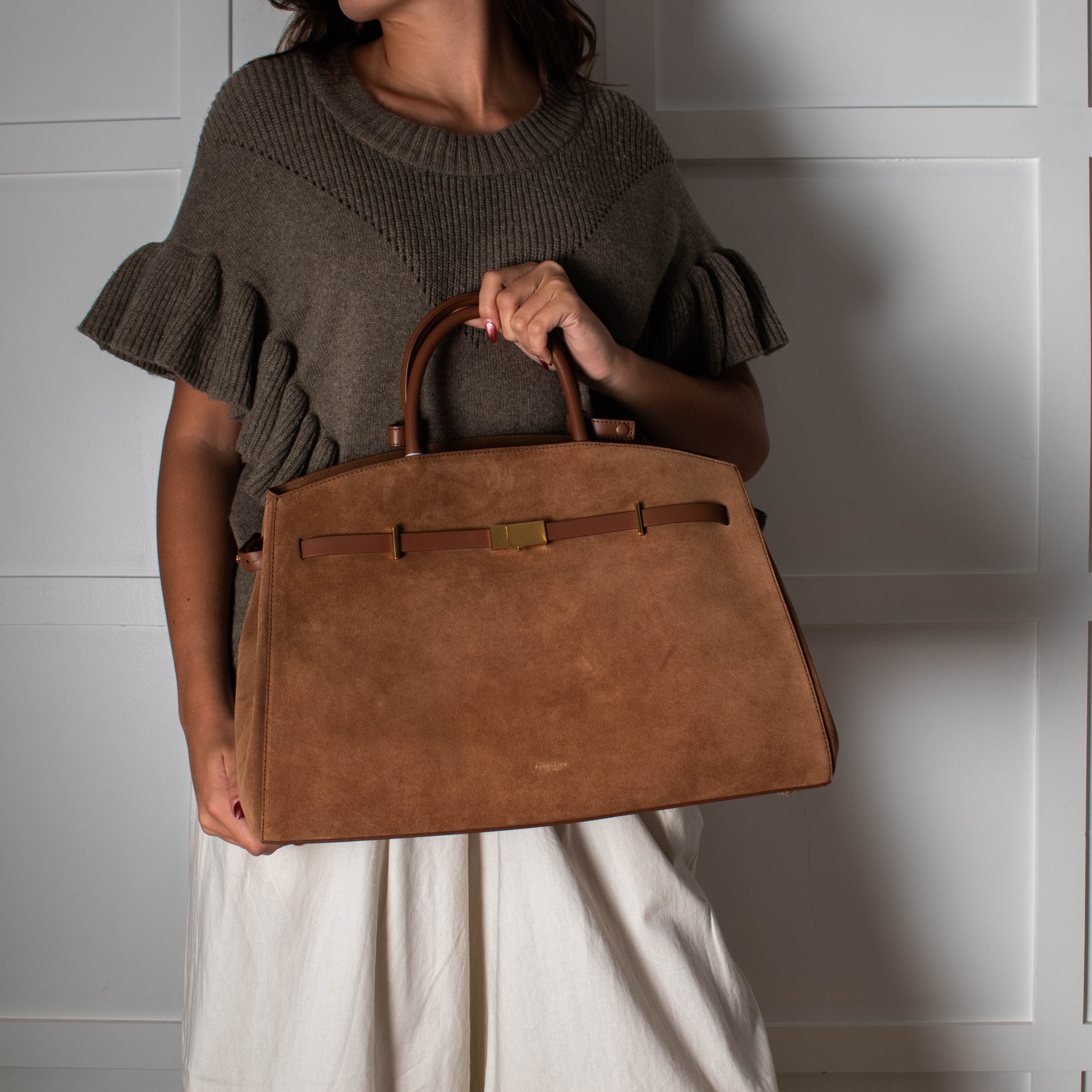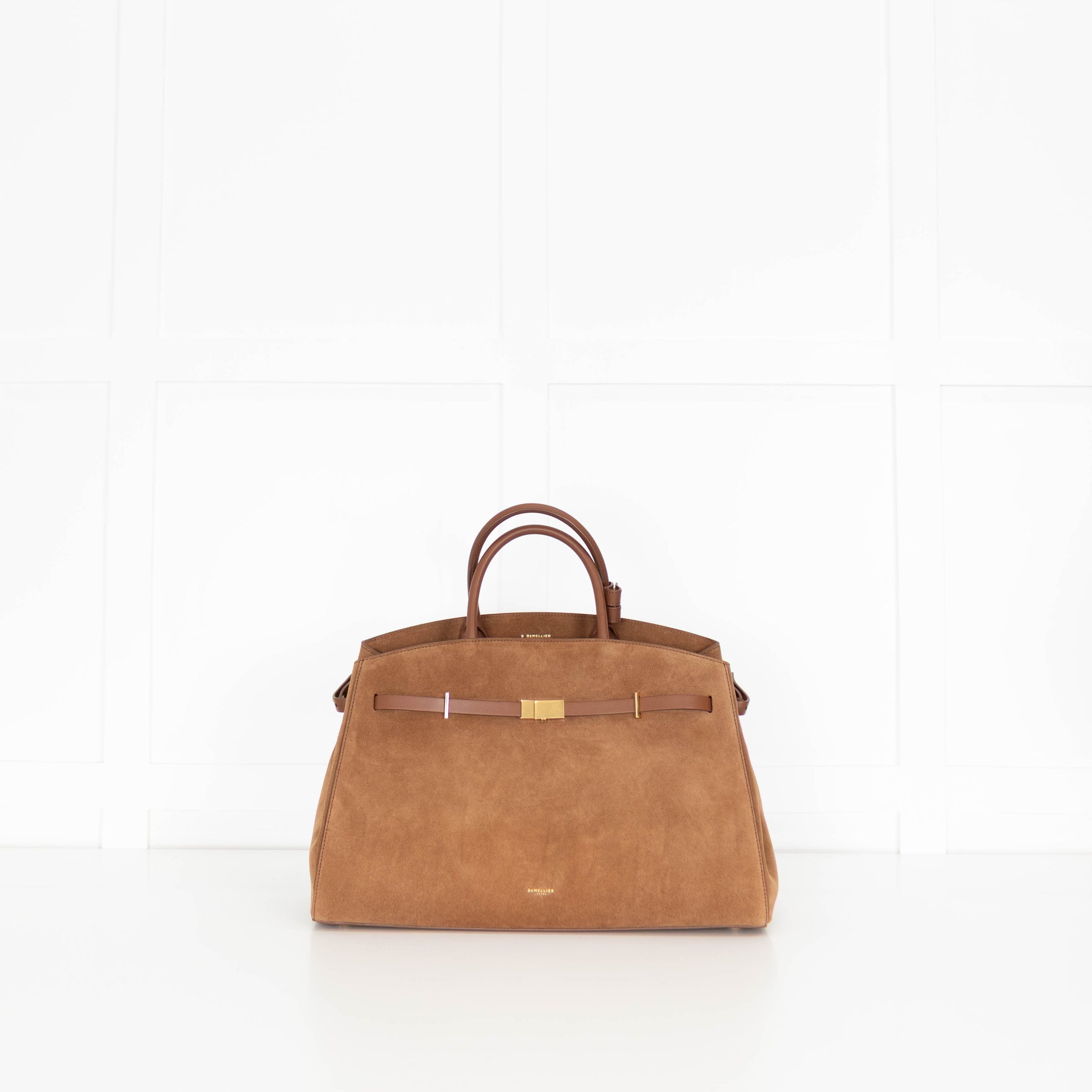 DeMellier Hudson tan suede top-handle bag with a softly structured silhouette, smooth leather trim, and the brand’s signature gold bar detail across the front. Designed with rolled top handles and a detachable shoulder strap for versatile styling. The magnetic flap opens to a spacious interior with one main compartment and an internal slip pocket. The original RRP £585.