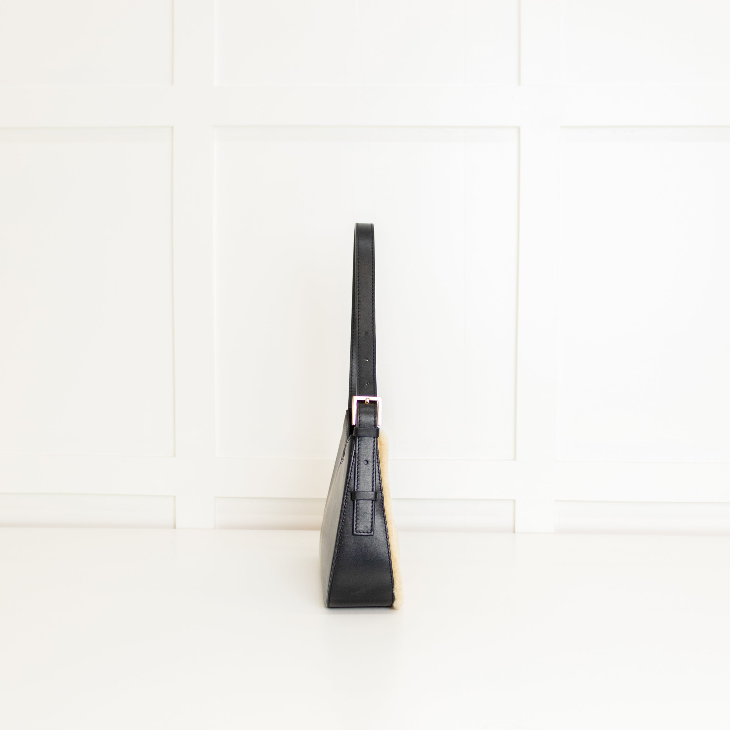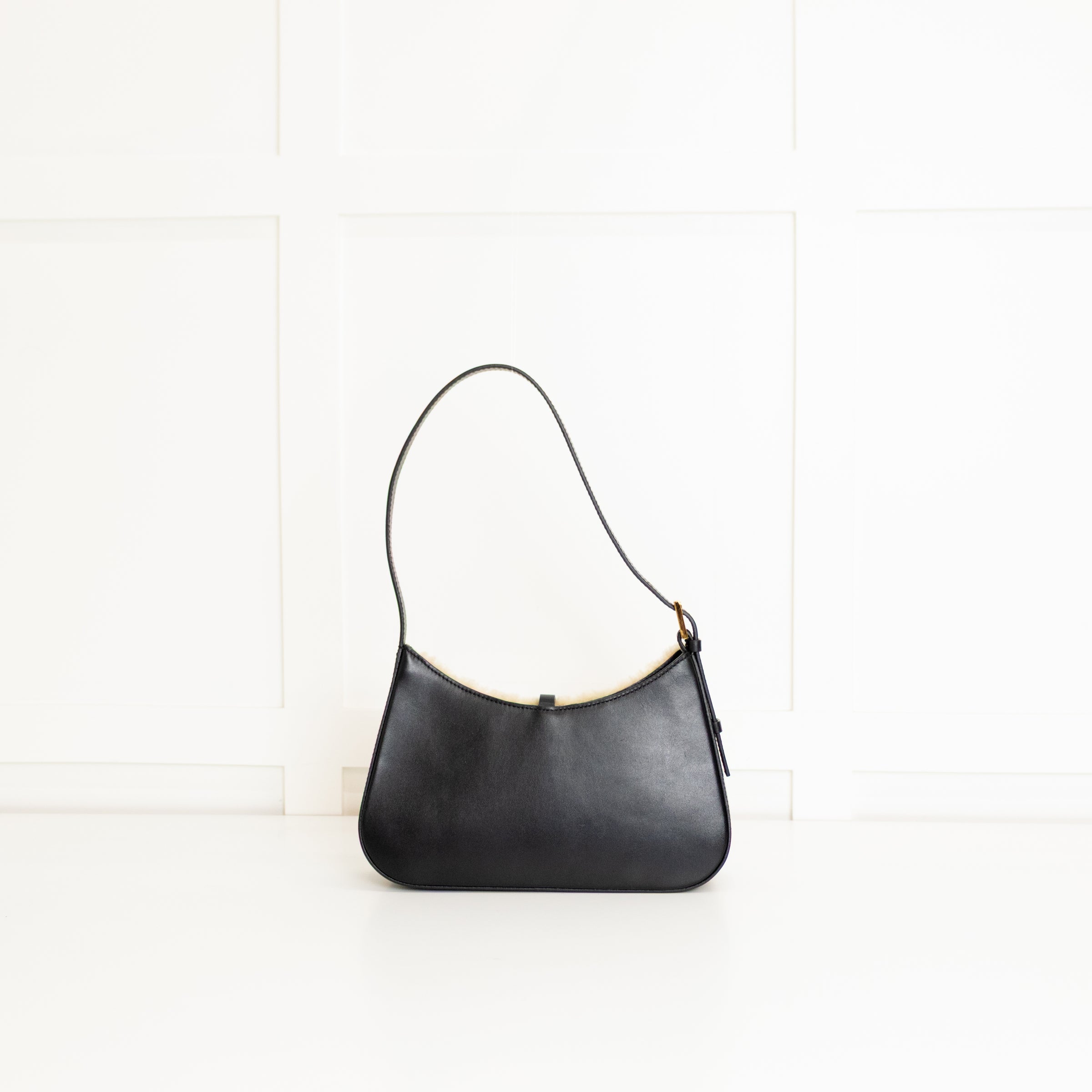 DeMellier ‘Tokyo’ shoulder bag in a two-tone palette of beige sheepskin and black leather, crafted with a sleek, modern silhouette. The design is elevated by the brand’s signature arrow-shaped magnetic closure. The adjustable strap allows for a versatile fit. The interior opens to one main compartment with a zip-fastening pocket.